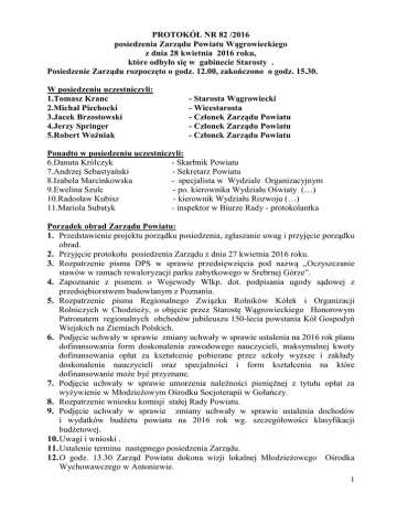 PROTOKÓŁ NR 82 /2016 posiedzenia Zarządu Powiatu