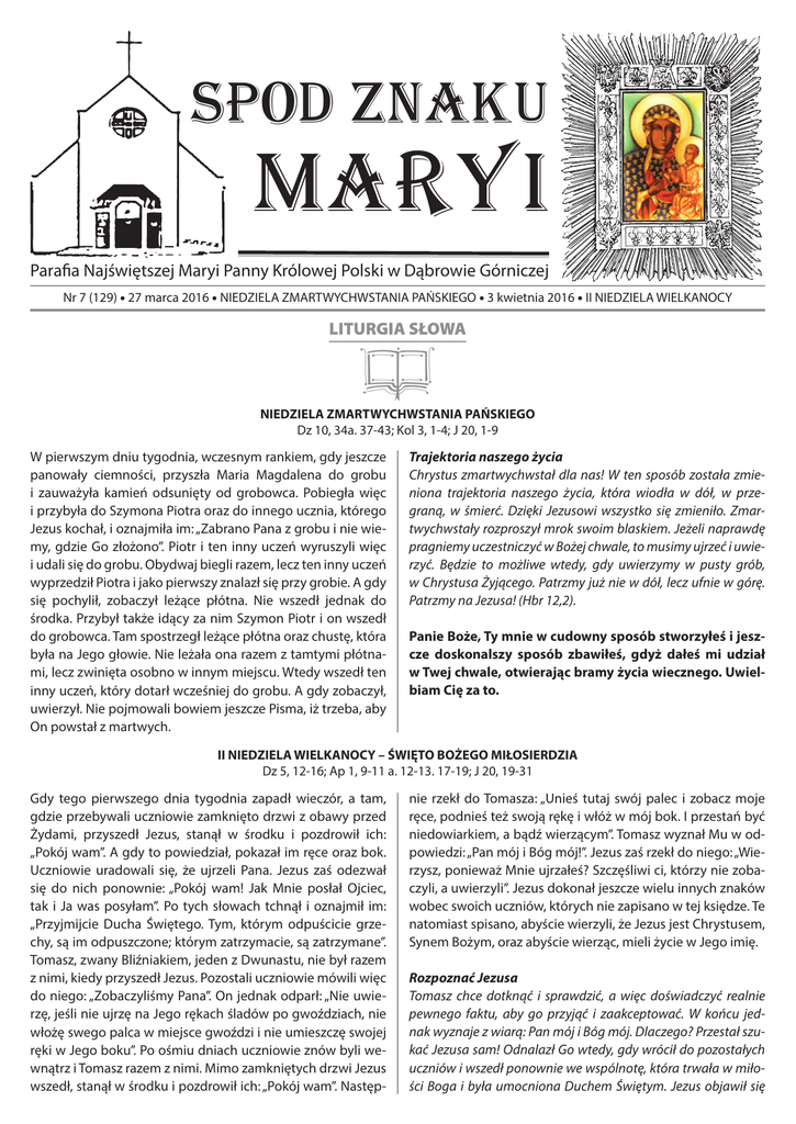 SPOD ZNAKU MARYI Parafia Najświętszej Maryi Panny Królowej Polski w Dąbrowie Górniczej Nr 7 (129) • 27 marca 2016 • NIEDZIELA ZMARTWYCHWSTANIA PAŃSKIEGO • 3 kwietnia 2016 • II NIEDZIELA WIELKANOCY LITURGIA SŁOWA | NIEDZIELA ZMARTWYCHWSTANIA PAŃSKIEGO Dz 10, 34a. 37-43; Kol 3, 1-4; J 20, 1-9 W pierwszym dniu tygodnia, wczesnym rankiem, gdy jeszcze panowały ciemności, przyszła Maria Magdalena do grobu i zauważyła kamień odsunięty od grobowca. Pobiegła więc i przybyła do Szymona Piotra oraz do innego ucznia, którego Jezus kochał, i oznajmiła im: „Zabrano Pana z grobu i nie wiemy, gdzie Go złożono”. Piotr i ten inny uczeń wyruszyli więc i udali się do grobu. Obydwaj biegli razem, lecz ten inny uczeń wyprzedził Piotra i jako pierwszy znalazł się przy grobie. A gdy się pochylił, zobaczył leżące płótna. Nie wszedł jednak do środka. Przybył także idący za nim Szymon Piotr i on wszedł do grobowca. Tam spostrzegł leżące płótna oraz chustę, która była na Jego głowie. Nie leżała ona razem z tamtymi płótnami, lecz zwinięta osobno w innym miejscu. Wtedy wszedł ten inny uczeń, który dotarł wcześniej do grobu. A gdy zobaczył, uwierzył. Nie pojmowali bowiem jeszcze Pisma, iż trzeba, aby On powstał z martwych. Trajektoria naszego życia Chrystus zmartwychwstał dla nas! W ten sposób została zmieniona trajektoria naszego życia, która wiodła w dół, w przegraną, w śmierć. Dzięki Jezusowi wszystko się zmieniło. Zmartwychwstały rozproszył mrok swoim blaskiem. Jeżeli naprawdę pragniemy uczestniczyć w Bożej chwale, to musimy ujrzeć i uwierzyć. Będzie to możliwe wtedy, gdy uwierzymy w pusty grób, w Chrystusa Żyjącego. Patrzmy już nie w dół, lecz ufnie w górę. Patrzmy na Jezusa! (Hbr 12,2). Panie Boże, Ty mnie w cudowny sposób stworzyłeś i jeszcze doskonalszy sposób zbawiłeś, gdyż dałeś mi udział w Twej chwale, otwierając bramy życia wiecznego. Uwielbiam Cię za to. II NIEDZIELA WIELKANOCY – ŚWIĘTO BOŻEGO MIŁOSIERDZIA Dz 5, 12-16; Ap 1, 9-11 a. 12-13. 17-19; J 20, 19-31 Gdy tego pierwszego dnia tygodnia zapadł wieczór, a tam, gdzie przebywali uczniowie zamknięto drzwi z obawy przed Żydami, przyszedł Jezus, stanął w środku i pozdrowił ich: „Pokój wam”. A gdy to powiedział, pokazał im ręce oraz bok. Uczniowie uradowali się, że ujrzeli Pana. Jezus zaś odezwał się do nich ponownie: „Pokój wam! Jak Mnie posłał Ojciec, tak i Ja was posyłam”. Po tych słowach tchnął i oznajmił im: „Przyjmijcie Ducha Świętego. Tym, którym odpuścicie grzechy, są im odpuszczone; którym zatrzymacie, są zatrzymane”. Tomasz, zwany Bliźniakiem, jeden z Dwunastu, nie był razem z nimi, kiedy przyszedł Jezus. Pozostali uczniowie mówili więc do niego: „Zobaczyliśmy Pana”. On jednak odparł: „Nie uwierzę, jeśli nie ujrzę na Jego rękach śladów po gwoździach, nie włożę swego palca w miejsce gwoździ i nie umieszczę swojej ręki w Jego boku”. Po ośmiu dniach uczniowie znów byli wewnątrz i Tomasz razem z nimi. Mimo zamkniętych drzwi Jezus wszedł, stanął w środku i pozdrowił ich: „Pokój wam”. Następ- nie rzekł do Tomasza: „Unieś tutaj swój palec i zobacz moje ręce, podnieś też swoją rękę i włóż w mój bok. I przestań być niedowiarkiem, a bądź wierzącym”. Tomasz wyznał Mu w odpowiedzi: „Pan mój i Bóg mój!”. Jezus zaś rzekł do niego: „Wierzysz, ponieważ Mnie ujrzałeś? Szczęśliwi ci, którzy nie zobaczyli, a uwierzyli”. Jezus dokonał jeszcze wielu innych znaków wobec swoich uczniów, których nie zapisano w tej księdze. Te natomiast spisano, abyście wierzyli, że Jezus jest Chrystusem, Synem Bożym, oraz abyście wierząc, mieli życie w Jego imię. Rozpoznać Jezusa Tomasz chce dotknąć i sprawdzić, a więc doświadczyć realnie pewnego faktu, aby go przyjąć i zaakceptować. W końcu jednak wyznaje z wiarą: Pan mój i Bóg mój. Dlaczego? Przestał szukać Jezusa sam! Odnalazł Go wtedy, gdy wrócił do pozostałych uczniów i wszedł ponownie we wspólnotę, która trwała w miłości Boga i była umocniona Duchem Świętym. Jezus objawił się wówczas tak wyraźnie, że Tomasz rozpoznał w Nim już nie tylko Syna, ale i Ojca. Słowa Pan mój i Bóg mój to najlepsza odpowiedź na Jezusowe słowa: Kto Mnie widzi, widzi także i Ojca. Jeżeli będziemy umieli Go rozpoznać, wtedy staniemy się ludźmi błogosławionymi. Chryste, klękam i „jak niewierny Tomasz Twych nie szukam ran, lecz wyznaję z wiarą, żeś Ty mój Bóg i Pan. Pomóż wierze mojej, Jezu, łaską swą, ożyw mą nadzieję, rozpal miłość mą”. PRZED ŚWIATOWYMI DNIAMI MŁODZIEŻY (9) „Zaradzajcie potrzebom świętych. Przestrzegajcie gościnności” (Rz 12,13) „Nie zapominajmy też o gościnności, gdyż przez nią niektórzy, nie wiedząc, aniołom dali gościnę” (Hbr 13,2) 1. Jaką liczbę pielgrzymów rodzina może przyjąć? Liczba przyjmowanych pielgrzymów jest uzależniona od woli oraz indywidualnych możliwości danej rodziny, niemniej jednak prosimy o przyjęcie minimum dwóch pielgrzymów. Należy pamiętać, że będą to osoby tej samej płci oraz że wymagana powierzchnia noclegowa dla jednego pielgrzyma to 3 m kw. 2. Czy rodzina dostanie informacje dotyczące szczególnych wymagań pielgrzymów (choroby, alergie, diety etc.)? Rodzina przyjmująca pielgrzymów, powinna zagwarantować miejsce noclegowe (ok. 3m kw. na osobę) oraz możliwość skorzystania z łazienki/toalety. Nie ma obowiązku zapewnienia wyżywienia (jednak jeśli będzie istniała taka możliwość, prosimy o przygotowanie śniadań dla pielgrzymów, którzy goszczą u rodziny). Nie ma obowiązku dostosowywania się do szczególnych wymagań żywieniowych poszczególnych pielgrzymów. Osoby z problemami zdrowotnymi (choroba przewlekła, alergia) są zobligowane do zapewnienia sobie we własnym zakresie niezbędnych środków farmakolog