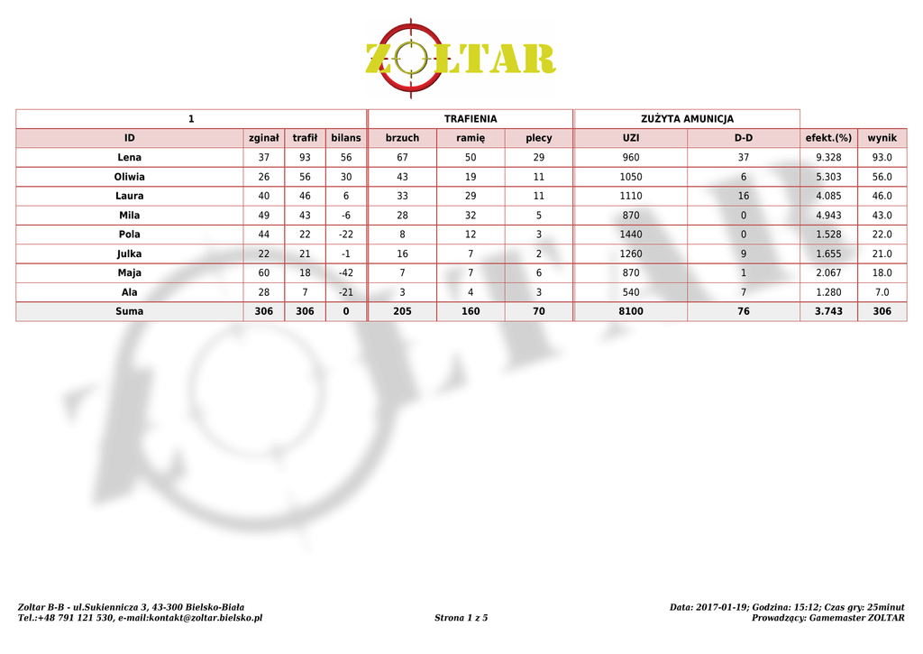 1 TRAFIENIA ZUŻYTA AMUNICJA ID zginał trafił bilans brzuch ramię plecy UZI D-D efekt.(%) wynik Lena 37 93 56 67 50 29 960 37 9.328 93.0 Oliwia 26 56 30 43 19 11 1050 6 5.303 56.0 Laura 40 46 6 33 29 11 1110 16 4.085 46.0 Mila 49 43 -6 28 32 5 870 0 4.943 43.0 Pola 44 22 -22 8 12 3 1440 0 1.528 22.0 Julka 22 21 -1 16 7 2 1260 9 1.655 21.0 Maja 60 18 -42 7 7 6 870 1 2.067 18.0 Ala 28 7 -21 3 4 3 540 7 1.280 7.0 Suma 306 306 0 205 160 70 8100 76 3.743 306 Zoltar B-B - ul.Sukiennicza 3, 43-300 Bielsko-Biała Tel.:+48 791 121 530, e-mail:[email protected] Strona 1 z 5 Data: 2017-01-19; Godzina: 15:12; Czas gry: 25minut Prowadzący: Gamemaster ZOLTAR 1 TRAFIENIA ZUŻYTA AMUNICJA ID zginał trafił bilans brzuch ramię plecy UZI D-D efekt.(%) wynik Oliwia 31 23 -8 11 17 4 1800 4 1.275 23.0 Ala 37 17 -20 11 2 5 870 8 1.936 17.0 Julka 25 10 -15 6 5 4 1020 11 0.970 10.0 Maja 36 10 -26 5 4 2 1200 5 0.830 10.0 Suma 129 60 -69 33 28 15 4890 28 1.220 60 2 TRAFIENIA ZUŻYTA AMUNICJA ID zginał trafił bilans brzuch ramię plecy UZI D-D efekt.(%) wynik Lena 16 69 53 43 39 23 2220 17 3.084 69.0 Mila 29 38 9 26 24 12 1500 1 2.532 38.0 Pola 21 14 14 8 6 3 1680 0 0.833 14.0 Laura 15 8 -7 5 6 3 660 0 1.212 8.0 Suma 81 129 69 82 75 41 6060 18 2.122 129 Zoltar B-B - ul.Sukiennicza 3, 43-300 Bielsko-Biała Tel.:+48 791 121 530, e-mail:[email protected] 2 1 129 60 Strona 2 z 5 Data: 2017-01-19; Godzina: 15:45; Czas gry: 25minut Prowadzący: Gamemaster ZOLTAR Drużyny Rozgrywki Miejsce Nazwa 1 Zoltar B-B - ul.Sukiennicza 3, 43-300 Bielsko-Biała Tel.:+48 791 121 530, e-mail:[email protected] 2 Suma 2 - 129 129 1 - 60 60 Strona 3 z 5 Data: 2017-01-19 Prowadzący: Gamemaster ZOLTAR Zestawienie wg wyniku Miejsce TRAFIENIA ZUŻYTA AMUNICJA ID zginał trafił bilans brzuch ramię plecy UZI D-D efekt.(%) wynik Lena 63.60 194.40 130.80 132.00 106.80 62.40 3816.00 64.80 5.009 194.40 Mila 93.60 97.20 3.60 64.80 67.20 20.40 2844.00 1.20 3.416 97.20 Oliwia 68.40 94.80 26.40 64.80 43.20 18.00 3420.00 12.00 2.762 94.80 4 Laura 66.00 64.80 -1.20 45.60 42.00 16.80 2124.00 19.20 3.024 64.80 5 Pola 78.00 43.20 -34.80 19.20 21.60 7.20 3744.00 0.00 1.154 43.20 6 Julka 56.40 37.20 -19.20 26.40 14.40 7.20 2736.00 24.00 1.348 37.20 7 Maja 115.20 33.60 -81.60 14.40 13.20 9.60 2484.00 7.20 1.349 33.60 8 Ala 78.00 28.80 -49.20 16.80 7.20 9.60 1692.00 18.00 1.684 28.80 Zestawienie wg bilansu Miejsce TRAFIENIA ZUŻYTA AMUNICJA ID zginał trafił bilans brzuch ramię plecy UZI D-D efekt.(%) wynik Lena 63.60 194.40 130.80 132.00 106.80 62.40 3816.00 64.80 5.009 194.40 Oliwia 68.40 94.80 26.40 64.80 43.20 18.00 3420.00 12.00 2.762 94.80 Mila 93.60 97.20 3.60 64.80 67.20 20.40 2844.00 1.20 3.416 97.20 4 Laura 66.00 64.80 -1.20 45.60 42.00 16.80 2124.00 19.20 3.024 64.80 5 Julka 56.40 37.20 -19.20 26.40 14.40 7.20 2736.00 24.00 1.348 37.20 6 Pola 78.00 43.20 -34.80 19.20 21.60 7.20 3744.00 0.00 1.154 43.20 7 Ala 78.00 28.80 -49.20 16.80 7.20 9.60 1692.00 18.00 1.684 28.80 8 Maja 115.20 33.60 -81.60 14.40 13.20 9.60 2484.00 7.20 1.349 33.60 Zoltar B-B - ul.Sukiennicza 3, 43-300 Bielsko-Biała Tel.:+48 791 121 530, e-mail:[email protected] Strona 4 z 5 Data: 2017-01-19 Prowadzący: Gamemaster ZOLTAR Zestawienie wg efektywności Miejsce TRAFIENIA ZUŻYTA AMUNICJA ID zginał trafił bilans brzuch ramię plecy UZI D-D efekt.(%) wynik Lena 63.60 194.40 130.80 132.00 106.80 62.40 3816.00 64.80 5.009 194.40 Mila 93.60 97.20 3.60 64.80 67.20 20.40 2844.00 1.20 3.416 97.20 Laura 66.00 64.80 -1.20 45.60 42.00 16.80 2124.00 19.20 3.024 64.80 4 Oliwia 68.40 94.80 26.40 64.80 43.20 18.00 3420.00 12.00 2.762 94.80 5 Ala 78.00 28.80 -49.20 16.80 7.20 9.60 1692.00 18.00 1.684 28.80 6 Maja 115.20 33.60 -81.60 14.40 13.20 9.60 2484.00 7.20 1.349 33.60 7 Julka 56.40 37.20 -19.20 26.40 14.40 7.20 2736.00 24.00 1.348 37.20 8 Pola 78.00 43.20 -34.80 19.20 21.60 7.20 3744.00 0.00 1.154 43.20 Zoltar B-B - ul.Sukiennicza 3, 43-300 Bielsko-Biała Tel.:+48 791 121 530, e-mail:[email protected] Strona 5 z 5 Data: 2017-01-19 Prowadzący: Gamemaster ZOLTAR