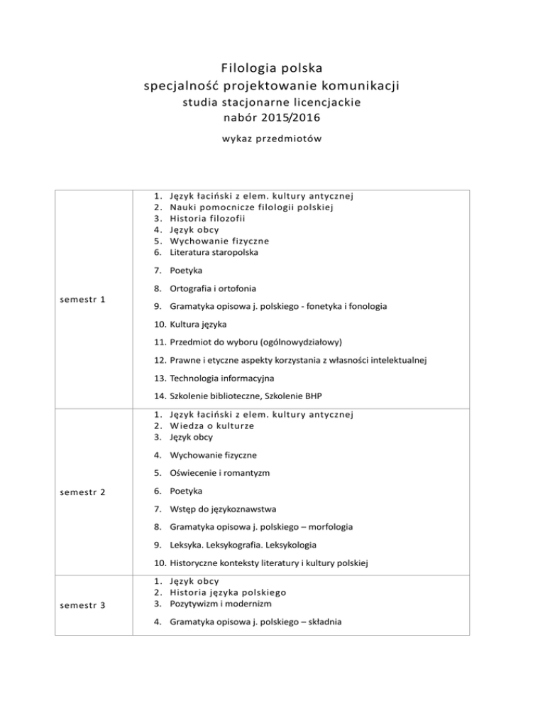 Filologia polska specjalność projektowanie komunikacji studia stacjonarne licencjackie nabór 2015/2016 wykaz przedmiotów 1. 2. 3. 4. 5. 6. Język łaciński z elem. kultury antycznej Nauki pomocnicze filologii polskiej Historia filozofii Język obcy Wychowanie fizyczne Literatura staropolska 7. Poetyka 8. Ortografia i ortofonia semestr 1 9. Gramatyka opisowa j. polskiego - fonetyka i fonologia 10. Kultura języka 11. Przedmiot do wyboru (ogólnowydziałowy) 12. Prawne i etyczne aspekty korzystania z własności intelektualnej 13. Technologia informacyjna 14. Szkolenie biblioteczne, Szkolenie BHP 1. Język łaciński z elem. kultury antycznej 2. W iedza o kulturze 3. Język obcy 4. Wychowanie fizyczne 5. Oświecenie i romantyzm semestr 2 6. Poetyka 7. Wstęp do językoznawstwa 8. Gramatyka opisowa j. polskiego – morfologia 9. Leksyka. Leksykografia. Leksykologia 10. Historyczne konteksty literatury i kultury polskiej semestr 3 1. Język obcy 2. Historia języka polskiego 3. Pozytywizm i modernizm 4. Gramatyka opisowa j. polskiego – składnia 5. Teorie komunikacji 6. Wprowadzenie do communication design 7. Projektowanie i badanie komunikacji w praktyce 8. Retoryka i erystyka 9. Praktyka śródroczna 1. Język obcy 2. Literatura polska dwudziestolecia międzywojennego 3. Teoria literatury 4. Gramatyka historyczna z elementami języka s.c.s 5. Adiustacja i korekta tekstu semestr 4 6. Komunikacja perswazyjna i manipulacja językowa 7. Creative writing w komunikacji publicznej i politycznej 8. Rzecznictwo prasowe – warsztaty 9. Organizacja eventów – warsztaty 10. Praktyka ciągła 1. Literatura współczesna 2. Stylistyka praktyczna 3. Odmiany polszczyzny współczesnej 4. Regionalne i terytorialne odmiany polszczyzny 5. Korespondencje sztuk 6. Seminarium dyplomowe 7. Systemy medialne w Polsce i na świecie semestr 5 8. Promocja i reklama w sektorze kultury i edukacji 9. Analiza dyskursu medialnego 10. Strategie Public Relations – działanie i ich ewaluacja 11. Podstawy brandingu (naming i systemy identyfikacji wizualnej) 12. Warsztaty dziennikarskie 13. Język mediów polityki 14. Własność intelektualna w reklamie i promocji semestr 6 1. Literatura powszechna 2.Analiza i interpretacja dzieła literackiego 3. Przedmiot do wyboru polonistyczny 4. Seminarium dyplomowe 5. Reklama komercyjna i społeczna 6. Copywriting – reklama i promocja 7. Komunikowanie polityczne i publiczne 8. Działalność agencji reklamowe - warsztaty opiekun roku: dr Lidia Romaniszyn -Z iomek Filologia polska specjalność nauczycielska studia stacjonarne licencjackie nabór 2015/2016 wykaz przedmiotów 2. 3. 4. 5. 6. 1. Język łaciński z elem. kultury antycznej Nauki pomocnicze filologii polskiej Historia filozofii Język obcy Wychowanie fizyczne Literatura staropolska 7. Poetyka 8. Ortografia i ortofonia semestr 1 9. Gramatyka opisowa j. polskiego - fonetyka i fonologia 10. Kultura języka 11. Przedmiot do wyboru (ogólnowydziałowy) 12. Prawne i etyczne aspekty korzystania z własności intelektualnej 13. Technologia informacyjna 14. Szkolenie biblioteczne, Szkolenie BHP 1. Język łaciński z elem. kultury antycznej 2. W iedza o kulturze 3. Język obcy semestr 2 4. Wychowanie fizyczne 5. Oświecenie i romantyzm 6. Poetyka 7. Wstęp do językoznawstwa 8. Gramatyka opisowa j. polskiego – morfologia 9. Leksyka. Leksykografia. Leksykologia 10. Historyczne konteksty literatury i kultury polskiej 1. Język obcy 2. Historia języka polskiego 3. Pozytywizm i modernizm 4. Gramatyka opisowa j. polskiego – składnia 5. Psychologia ogólna semestr 3 6. Dydaktyka ogólna 7. Metodyka nauczania literatury w szkole podstawowej 8. Metodyka kształcenia językowego w szkole podstawowej 9. Praktyka śródroczna 1. Język obcy 2. Literatura polska dwudziestolecia międzywojennego 3. Teoria literatury 4. Gramatyka historyczna z elementami języka s.c.s 5. Adiustacja i korekta tekstu semestr 4 6. Podstawy komunikacji interpersonalnej 7. Pomiar dydaktyczny w pracy nauczyciela 8. Emisja głosu 9. Metodyka zajęć korekcyjno-kompensacyjnych 10. Praktyka obserwacyjna 1. Literatura współczesna 2. Stylistyka praktyczna 3. Odmiany polszczyzny współczesnej semestr 5 4. Regionalne i terytorialne odmiany polszczyzny 5. Korespondencje sztuk 6. Seminarium dyplomowe 7. Media w edukacji polonistycznej 8. Literatura dla dzieci i młodzieży 9. Animacja społeczno-kulturalna 10. Praktyka ciągła 1. Literatura powszechna 2. Analiza i interpretacja dzieła literackiego 3. Przedmiot do wyboru polonistyczny semestr 6 4. Seminarium dyplomowe 5. Warsztat pracy wychowawczej nauczyciela 6. Prawne aspekty funkcjonowania oświaty opiekun roku: dr Lidia Romaniszyn -Z iomek