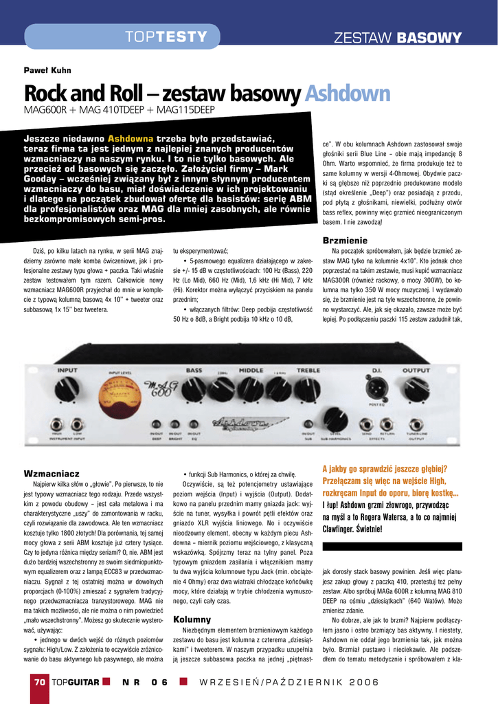 TOPTESTY ZESTAW BASOWY Paweł Kuhn Rock and Roll – zestaw basowy Ashdown MAG600R + MAG 410TDEEP + MAG115DEEP Jeszcze niedawno Ashdowna trzeba było przedstawiać, teraz firma ta jest jednym z najlepiej znanych producentów wzmacniaczy na naszym rynku. I to nie tylko basowych. Ale przecież od basowych się zaczęło. Założyciel firmy – Mark Gooday – wcześniej związany był z innym słynnym producentem wzmacniaczy do basu, miał doświadczenie w ich projektowaniu i dlatego na początek zbudował ofertę dla basistów: serię ABM dla profesjonalistów oraz MAG dla mniej zasobnych, ale równie bezkompromisowych semi-pros. ce”. W obu kolumnach Ashdown zastosował swoje głośniki serii Blue Line – obie mają impedancję 8 Ohm. Warto wspomnieć, że firma produkuje też te same kolumny w wersji 4-Ohmowej. Obydwie paczki są głębsze niż poprzednio produkowane modele (stąd określenie „Deep”) oraz posiadają z przodu, pod płytą z głośnikami, niewielki, podłużny otwór bass reflex, powinny więc grzmieć nieograniczonym basem. I nie zawodzą! Brzmienie Dziś, po kilku latach na rynku, w serii MAG znajdziemy zarówno małe komba ćwiczeniowe, jak i profesjonalne zestawy typu głowa + paczka. Taki właśnie zestaw testowałem tym razem. Całkowicie nowy wzmacniacz MAG600R przyjechał do mnie w komplecie z typową kolumną basową 4x 10’’ + tweeter oraz subbasową 1x 15’’ bez tweetera. tu eksperymentować; • 5-pasmowego equalizera działającego w zakresie +/- 15 dB w częstotliwościach: 100 Hz (Bass), 220 Hz (Lo Mid), 660 Hz (Mid), 1,6 kHz (Hi Mid), 7 kHz (Hi). Korektor można wyłączyć przyciskiem na panelu przednim; • włączanych filtrów: Deep podbija częstotliwość 50 Hz o 8dB, a Bright podbija 10 kHz o 10 dB, Wzmacniacz • funkcji Sub Harmonics, o której za chwilę. Oczywiście, są też potencjometry ustawiające poziom wejścia (Input) i wyjścia (Output). Dodatkowo na panelu przednim mamy gniazda jack: wyjście na tuner, wysyłka i powrót pętli efektów oraz gniazdo XLR wyjścia liniowego. No i oczywiście nieodzowny element, obecny w każdym piecu Ashdowna – miernik poziomu wejściowego, z klasyczną wskazówką. Spójrzmy teraz na tylny panel. Poza typowym gniazdem zasilania i włącznikiem mamy tu dwa wyjścia kolumnowe typu Jack (min. obciążenie 4 Ohmy) oraz dwa wiatraki chłodzące końcówkę mocy, które działają w trybie chłodzenia wymuszonego, czyli cały czas. Najpierw kilka słów o „głowie”. Po pierwsze, to nie jest typowy wzmacniacz tego rodzaju. Przede wszystkim z powodu obudowy – jest cała metalowa i ma charakterystyczne „uszy” do zamontowania w racku, czyli rozwiązanie dla zawodowca. Ale ten wzmacniacz kosztuje tylko 1800 złotych! Dla porównania, tej samej mocy głowa z serii ABM kosztuje już cztery tysiące. Czy to jedyna różnica między seriami? O, nie. ABM jest dużo bardziej wszechstronny ze swoim siedmiopunktowym equalizerem oraz z lampą ECC83 w przedwzmacniaczu. Sygnał z tej ostatniej można w dowolnych proporcjach (0-100%) zmieszać z sygnałem tradycyjnego przedwzmacniacza tranzystorowego. MAG nie ma takich możliwości, ale nie można o nim powiedzieć „mało wszechstronny”. Możesz go skutecznie wysterować, używając: • jednego w dwóch wejść do różnych poziomów sygnału: High/Low. Z założenia to oczywiście zróżnicowanie do basu aktywnego lub pasywnego, ale można 70 TOPGUITAR k N R 0 6 Kolumny Niezbędnym elementem brzmieniowym każdego zestawu do basu jest kolumna z czterema „dziesiątkami” i tweeterem. W naszym przypadku uzupełnia ją jeszcze subbasowa paczka na jednej „piętnastk Na początek spróbowałem, jak będzie brzmieć zestaw MAG tylko na kolumnie 4x10”. Kto jednak chce poprzestać na takim zestawie, musi kupić wzmacniacz MAG300R (również rackowy, o mocy 300W), bo kolumna ma tylko 350 W mocy muzycznej. I wydawało się, że brzmienie jest na tyle wszechstronne, że powinno wystarczyć. Ale, jak się okazało, zawsze może być lepiej. Po podłączeniu paczki 115 zestaw zadudnił tak, A jakby go sprawdzić jeszcze głębiej? Przełączam się więc na wejście High, rozkręcam Input do oporu, biorę kostkę… I łup! Ashdown grzmi złowrogo, przywodząc na myśl a to Rogera Watersa, a to co najmniej Clawfinger. Świetnie! jak dorosły stack basowy powinien. Jeśli więc planujesz zakup głowy z paczką 410, przetestuj też pełny zestaw. Albo spróbuj MAGa 600R z kolumną MAG 810 DEEP na ośmiu „dziesiątkach” (640 Watów). Może zmienisz zdanie. No dobrze, ale jak to brzmi? Najpierw podłączyłem jasno i ostro brzmiący bas aktywny. I niestety, Ashdown nie oddał jego brzmienia tak, jak można było. Brzmiał pustawo i nieciekawie. Ale podszedłem do tematu metodycznie i spróbowałem z kla- W R Z E S I E Ń / PA Ź D Z I E R N I K 2 0 0 6 Ashdown grzmi złowrogo, przywodząc na myśl a to Rogera Watersa, a to co najmniej Clawfinger. Świetnie! Nawet Ampeg niezbyt wysoko tu podskoczy! A wady? Nie wiem czemu wzmacniacz nie jest wyposażony w wyjścia kolumnowe typu Speakon, tym bardziej, że obie kolumny mają takowe. No i waga. Paczkę 115 jeszcze jakoś podniosłem, ale 410-tkę już ledwo-ledwo na niej postawiłem. Ale przecież są w tej klasie cięższe zestawy głośnikowe. No i po co w ogóle się czepiać, jeśli ten – nie kryjmy tego – w pełni profesjonalny zestaw dający moc 600 Watów kosztuje poniżej 4 tys. zł! tg M A L K Kolumna głośnikowa MAG 410T DEEP Głośniki: 4 x 10” BlueLine™ driver + tweeter Moc nominalna: 350 W ciągła (450 W szczytowa) Impedancja: 8 Ohm Pasmo przenoszenia: 60 Hz - 20 kHz Głośność (SPL): 101 dB w odległości 1m Wymiary (W x S x G): 655 x 604 x 420 mm Masa: 27,5 kg E Wzmacniacz Ashdown MAG 600R: Typ wzmacniacza mocy: jednokanałowy MOSFET Moc wzmacniacza: 575 W RMS Pasmo przenoszenia: -3 dB przy 17 Hz i 30 kHz Stosunek sygnału do szumu: >80 dB (przy płaskiej korekcji) Zniekształceni
