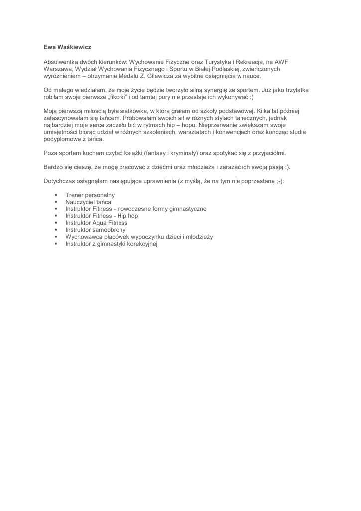 Ewa Waśkiewicz Absolwentka dwóch kierunków: Wychowanie Fizyczne oraz Turystyka i Rekreacja, na AWF Warszawa, Wydział Wychowania Fizycznego i Sportu w Białej Podlaskiej, zwieńczonych wyróżnieniem – otrzymanie Medalu Z. Gilewicza za wybitne osiągnięcia w nauce. Od małego wiedziałam, że moje życie będzie tworzyło silną synergię ze sportem. Już jako trzylatka robiłam swoje pierwsze „fikołki” i od tamtej pory nie przestaje ich wykonywać :) Moją pierwszą miłością była siatkówka, w którą grałam od szkoły podstawowej. Kilka lat później zafascynowałam się tańcem. Próbowałam swoich sił w różnych stylach tanecznych, jednak najbardziej moje serce zaczęło bić w rytmach hip – hopu. Nieprzerwanie zwiększam swoje umiejętności biorąc udział w różnych szkoleniach, warsztatach i konwencjach oraz kończąc studia podyplomowe z tańca. Poza sportem kocham czytać książki (fantasy i kryminały) oraz spotykać się z przyjaciółmi. Bardzo się cieszę, że mogę pracować z dziećmi oraz młodzieżą i zarażać ich swoją pasją :). Dotychczas osiągnęłam następujące uprawnienia (z myślą, że na tym nie poprzestanę ;-): Trener personalny Nauczyciel tańca Instruktor Fitness - nowoczesne formy gimnastyczne Instruktor Fitness - Hip hop Instruktor Aqua Fitness Instruktor samoobrony Wychowawca placówek wypoczynku dzieci i młodzieży Instruktor z gimnastyki korekcyjnej