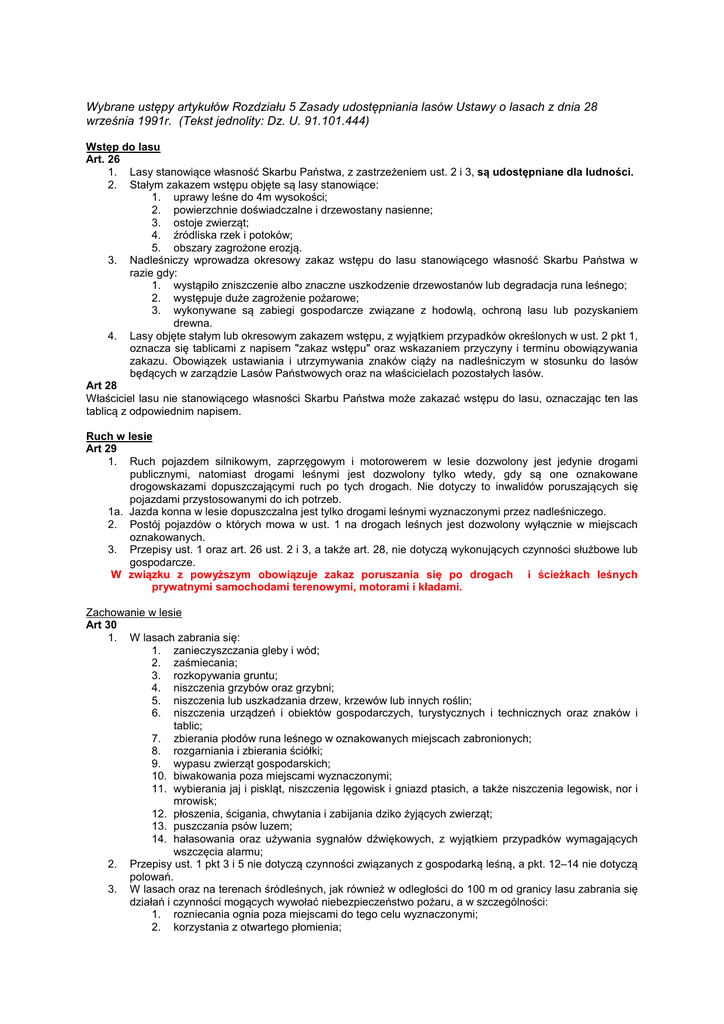 Wybrane ustępy artykułów Rozdziału 5 Zasady udostępniania lasów Ustawy o lasach z dnia 28 września 1991r. (Tekst jednolity: Dz. U. 91.101.444) Wstęp do lasu Art. 26 1. Lasy stanowiące własność Skarbu Państwa, z zastrzeżeniem ust. 2 i 3, są udostępniane dla ludności. 2. Stałym zakazem wstępu objęte są lasy stanowiące: 1. uprawy leśne do 4m wysokości; 2. powierzchnie doświadczalne i drzewostany nasienne; 3. ostoje zwierząt; 4. źródliska rzek i potoków; 5. obszary zagrożone erozją. 3. Nadleśniczy wprowadza okresowy zakaz wstępu do lasu stanowiącego własność Skarbu Państwa w razie gdy: 1. wystąpiło zniszczenie albo znaczne uszkodzenie drzewostanów lub degradacja runa leśnego; 2. występuje duże zagrożenie pożarowe; 3. wykonywane są zabiegi gospodarcze związane z hodowlą, ochroną lasu lub pozyskaniem drewna. 4. Lasy objęte stałym lub okresowym zakazem wstępu, z wyjątkiem przypadków określonych w ust. 2 pkt 1, oznacza się tablicami z napisem "zakaz wstępu" oraz wskazaniem przyczyny i terminu obowiązywania zakazu. Obowiązek ustawiania i utrzymywania znaków ciąży na nadleśniczym w stosunku do lasów będących w zarządzie Lasów Państwowych oraz na właścicielach pozostałych lasów. Art 28 Właściciel lasu nie stanowiącego własności Skarbu Państwa może zakazać wstępu do lasu, oznaczając ten las tablicą z odpowiednim napisem. Ruch w lesie Art 29 1. Ruch pojazdem silnikowym, zaprzęgowym i motorowerem w lesie dozwolony jest jedynie drogami publicznymi, natomiast drogami leśnymi jest dozwolony tylko wtedy, gdy są one oznakowane drogowskazami dopuszczającymi ruch po tych drogach. Nie dotyczy to inwalidów poruszających się pojazdami przystosowanymi do ich potrzeb. 1a. Jazda konna w lesie dopuszczalna jest tylko drogami leśnymi wyznaczonymi przez nadleśniczego. 2. Postój pojazdów o których mowa w ust. 1 na drogach leśnych jest dozwolony wyłącznie w miejscach oznakowanych. 3. Przepisy ust. 1 oraz art. 26 ust. 2 i 3, a także art. 28, nie dotyczą wykonujących czynności służbowe lub gospodarcze. W związku z powyższym obowiązuje zakaz poruszania się po drogach i ścieżkach leśnych prywatnymi samochodami terenowymi, motorami i kładami. Zachowanie w lesie Art 30 1. W lasach zabrania się: 1. zanieczyszczania gleby i wód; 2. zaśmiecania; 3. rozkopywania gruntu; 4. niszczenia grzybów oraz grzybni; 5. niszczenia lub uszkadzania drzew, krzewów lub innych roślin; 6. niszczenia urządzeń i obiektów gospodarczych, turystycznych i technicznych oraz znaków i tablic; 7. zbierania płodów runa leśnego w oznakowanych miejscach zabronionych; 8. rozgarniania i zbierania ściółki; 9. wypasu zwierząt gospodarskich; 10. biwakowania poza miejscami wyznaczonymi; 11. wybierania jaj i piskląt, niszczenia lęgowisk i gniazd ptasich, a także niszczenia legowisk, nor i mrowisk; 12. płoszenia, ścigania, chwytania i zabijania dziko żyjących zwierząt; 13. puszczania psów luzem; 14. hałasowania oraz używania sygnałów dźwiękowych, z wyjątkiem przypadków wymagających wszczęcia alarmu; 2. Przepisy ust. 1 pkt 3 i 5 nie dotyczą czynności związanych z gospodarką leśną, a pkt. 12–14 nie dotyczą polowań. 3. W lasach oraz na terenach śródleśnych, jak również w odległości do 100 m od granicy lasu zabrania się działań i czynności mogących wywołać niebezpieczeństwo pożaru, a w szczególności: 1. rozniecania ognia poza miejscami do tego celu wyznaczonymi; 2. korzystania z otwartego płomienia; 4. 3. wypalania wierzchniej warstwy gleby i pozostałości roślinnych; Przepisy ust 3 nie dotyczą działań i czynności związanych z gospodarką leśną, pod warunkiem, że czynności te nie stanowią zagrożenia pożarowego. W przypadku łamania w/w zasad, szczególnie tych, które stwarzają zagrożenie dla lasu lub przebywających w nim turystów prosimy o reakcję! Telefony: Policja 997, Straż pożarna 998, Straż Leśna Nadleśnictwa ( wg załączonej listy)