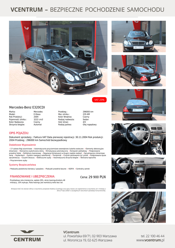 Mercedes-Benz E320CDI Marka: Model: Rok Produkcji: Pojemność silnika : Kolor Nadwozia: Skrzynia biegów: Mercedes E Klasa 2004 3222 cm3 Czarny Automat Przebieg : Moc silnika : Kolor Wnętrza: Rodzaj nadwozia: Ilość drzwi: Rodzaj paliwa: 296000 km 235 KM Czarny Sedan 4/5 Olej napędowy OPIS POJAZDU: Dokument sprzedaży : Faktura VAT Data pierwszej rejestracji: 30.11.2004 Rok produkcji: 2004 Przebieg : 296000 km Samochód bezwypadkowy Dodatkowe Wyposażenie ✓17-calowe felgi aluminiowe ✓Automatycznie przyciemniane wewnętrzne lusterko wsteczne ✓Elementy dekoracyjne drewniane ✓Kierownica wykończona skórą ✓Klimatyzacja automatyczna ✓Komputer pokładowy ✓Podgrzewane przednie fotele ✓Reflektory ksenonowe ✓Regulacja klimatyzacji w drugim rzędzie siedzeń ✓Spryskiwacze ciśnieniowe lamp ✓Szyberdach ✓System nawigacji satelitarnej ✓Tempomat ✓Czujniki parkowania tył i przód ✓Podgrzewane dysze spryskiwaczy ✓Czujnik deszczu ✓Elektryczne szyby ✓Automatyczna skrzynia biegów ✓Skórzana tapicerka ✓Przyciemniane szyby Systemy Bezpieczeństwa ✓Poduszka powietrzna kierowcy i pasażera ✓Poduszki przednie boczne ✓ISOFIX ✓Centralny zamek FINANSOWANIE I UBEZPIECZENIA: Cena: 29 900 PLN Przykładowa rata miesięczna, wpłata 20%, okres leasingu/kredytu 48 miesięcy, 10% wykupu. Rata leasingu jest wartością netto bez vat. Niniejsza treść nie stanowi oferty w rozumieniu przepisów Kodeksu Cywilnego oraz opisu towaru ani zapewnienia w rozumieniu art. 4 Ustawy z dnia 27 lipca 2002r o szczególnych warunkach sprzedaży konsumenckiej. Powered by TCPDF (www.tcpdf.org)