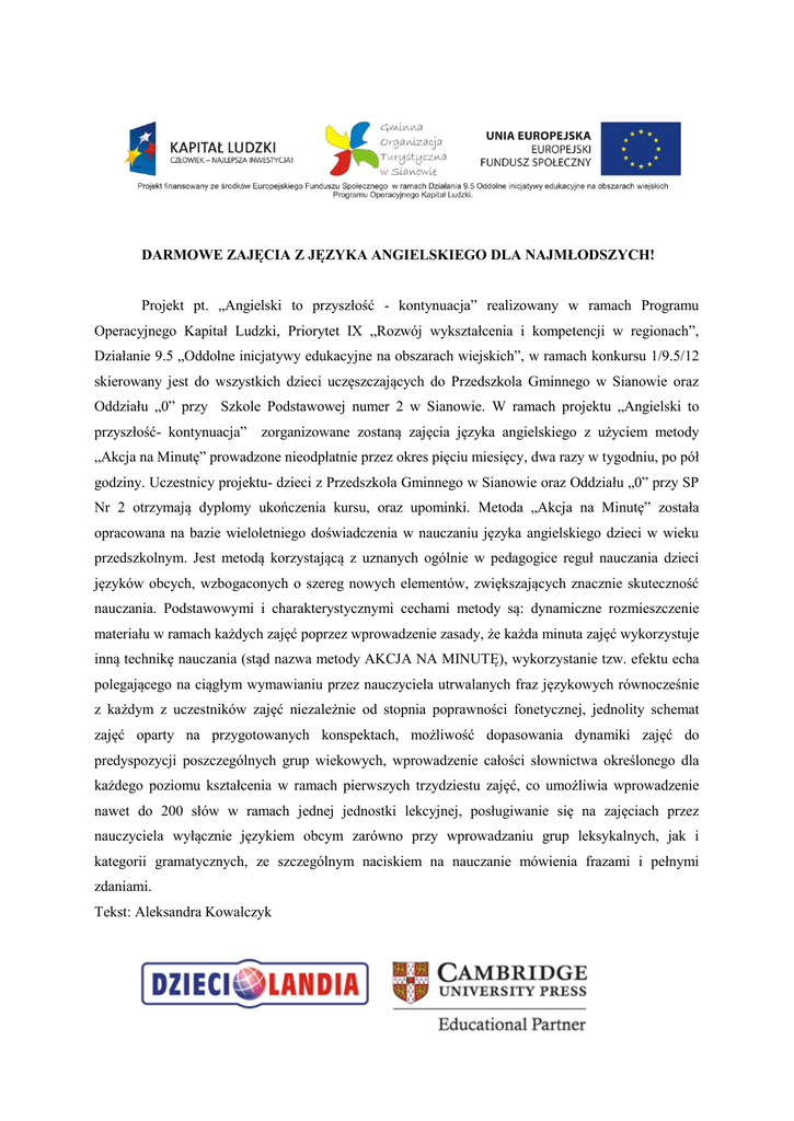 DARMOWE ZAJĘCIA Z JĘZYKA ANGIELSKIEGO DLA NAJMŁODSZYCH! Projekt pt. „Angielski to przyszłość - kontynuacja” realizowany w ramach Programu Operacyjnego Kapitał Ludzki, Priorytet IX „Rozwój wykształcenia i kompetencji w regionach”, Działanie 9.5 „Oddolne inicjatywy edukacyjne na obszarach wiejskich”, w ramach konkursu 1/9.5/12 skierowany jest do wszystkich dzieci uczęszczających do Przedszkola Gminnego w Sianowie oraz Oddziału „0” przy Szkole Podstawowej numer 2 w Sianowie. W ramach projektu „Angielski to przyszłość- kontynuacja” zorganizowane zostaną zajęcia języka angielskiego z użyciem metody „Akcja na Minutę” prowadzone nieodpłatnie przez okres pięciu miesięcy, dwa razy w tygodniu, po pół godziny. Uczestnicy projektu- dzieci z Przedszkola Gminnego w Sianowie oraz Oddziału „0” przy SP Nr 2 otrzymają dyplomy ukończenia kursu, oraz upominki. Metoda „Akcja na Minutę” została opracowana na bazie wieloletniego doświadczenia w nauczaniu języka angielskiego dzieci w wieku przedszkolnym. Jest metodą korzystającą z uznanych ogólnie w pedagogice reguł nauczania dzieci języków obcych, wzbogaconych o szereg nowych elementów, zwiększających znacznie skuteczność nauczania. Podstawowymi i charakterystycznymi cechami metody są: dynamiczne rozmieszczenie materiału w ramach każdych zajęć poprzez wprowadzenie zasady, że każda minuta zajęć wykorzystuje inną technikę nauczania (stąd nazwa metody AKCJA NA MINUTĘ), wykorzystanie tzw. efektu echa polegającego na ciągłym wymawianiu przez nauczyciela utrwalanych fraz językowych równocześnie z każdym z uczestników zajęć niezależnie od stopnia poprawności fonetycznej, jednolity schemat zajęć oparty na przygotowanych konspektach, możliwość dopasowania dynamiki zajęć do predyspozycji poszczególnych grup wiekowych, wprowadzenie całości słownictwa określonego dla każdego poziomu kształcenia w ramach pierwszych trzydziestu zajęć, co umożliwia wprowadzenie nawet do 200 słów w ramach jednej jednostki lekcyjnej, posługiwanie się na zajęciach przez nauczyciela wyłącznie językiem obcym zarówno przy wprowadzaniu grup leksykalnych, jak i kategorii gramatycznych, ze szczególnym naciskiem na nauczanie mówienia frazami i pełnymi zdaniami. Tekst: Aleksandra Kowalczyk