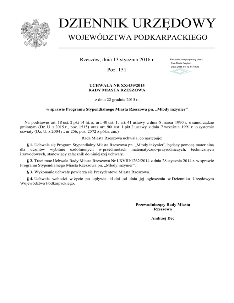 DZIENNIK URZĘDOWY WOJEWÓDZTWA PODKARPACKIEGO Rzeszów, dnia 13 stycznia 2016 r. Elektronicznie podpisany przez: Ewa Maria Przybyło Data: 2016-01-13 14:19:29 Poz. 151 UCHWAŁA NR XX/439/2015 RADY MIASTA RZESZOWA z dnia 22 grudnia 2015 r. w sprawie Programu Stypendialnego Miasta Rzeszowa pn. „Młody inżynier” Na podstawie art. 18 ust. 2 pkt 14 lit. a, art. 40 ust. 1, art. 41 ustawy z dnia 8 marca 1990 r. o samorządzie gminnym (Dz. U. z 2015 r., poz. 1515) oraz art. 90t ust. 1 pkt 2 ustawy z dnia 7 września 1991 r. o systemie oświaty (Dz. U. z 2004 r., nr 256, poz. 2572 z późn. zm.) Rada Miasta Rzeszowa uchwala, co następuje: § 1. Uchwala się Program Stypendialny Miasta Rzeszowa pn. „Młody inżynier”, będący pomocą materialną dla uczniów wybitnie uzdolnionych w przedmiotach matematyczno-przyrodniczych, technicznych i zawodowych, stanowiący załącznik do niniejszej uchwały. § 2. Traci moc Uchwała Rady Miasta Rzeszowa Nr LXVIII/1262/2014 z dnia 28 stycznia 2014 r. w sprawie Programu Stypendialnego Miasta Rzeszowa pn. „Młody inżynier”. § 3. Wykonanie uchwały powierza się Prezydentowi Miasta Rzeszowa. § 4. Uchwała wchodzi w życie po upływie 14 dni od dnia jej ogłoszenia w Dzienniku Urzędowym Województwa Podkarpackiego. Przewodniczący Rady Miasta Rzeszowa Andrzej Dec Dziennik Urzędowy Województwa Podkarpackiego –2– Poz. 151 Dziennik Urzędowy Województwa Podkarpackiego –3– Poz. 151 Dziennik Urzędowy Województwa Podkarpackiego –4– Poz. 151 Dziennik Urzędowy Województwa Podkarpackiego –5– Poz. 151 Dziennik Urzędowy Województwa Podkarpackiego –6– Poz. 151 Uzasadnienie Zgodnie z art. 18 ust. 2 pkt 14 lit. a ustawy z dnia 8 marca 1990 r. o samorządzie gminnym (Dz. U. z 2015 r., poz. 1515), rada gminy może podejmować uchwały w sprawie zasad udzielania stypendiów dla uczniów. Jednocześnie, na podstawie przepisów art. 90 lit. t ust. 1 pkt 2 ustawy z dnia 7 września 1991 r. o systemie oświaty (Dz. U. z 2004 r., Nr 256, poz. 2572 z późn. zm.), jednostki samorządu terytorialnego mogą tworzyć regionalne lub lokalne programy wspierania edukacji uzdolnionych dzieci i młodzieży. Wykorzystując dotychczasowe kilkuletnie doświadczenia funkcjonowania Programu Stypendialnego Miasta Rzeszowa pn. „Młody inżynier”, ustanowionego uchwałami XI/242/2011 Rady Miasta Rzeszowa z dnia 31 maja 2011 r. oraz XVIII/1262/2014 z 28 stycznia 2014 r., uznano za konieczne dookreślenie, kiedy mają zostać spełnione kryteria konieczne do przyznania stypendium dla młodego inżyniera oraz doprecyzowanie kryteriów i zasad przyznawania stypendiów dla uczniów wybitnie uzdolnionych z przedmiotów matematycznoprzyrodniczych, technicznych i zawodowych, zameldowanych na terenie Rzeszowa. Ponieważ głównym założeniem powyższego programu jest motywowanie uczniów szczególnie uzdolnionych dodatkowo wprowadzono wymóg uzyskania w wyniku klasyfikacji rocznej bezpośrednio poprzedzającej okres, na który ma być przyznane stypendium co najmniej oceny dobrej z zajęć edukacyjnych matematyczno-przyrodniczych. Rozszerzono katalog przedmiotów matematyczno-przyrodniczych wybieranych do średniej ocen. Wg nowego zapisu uczeń będzie mógł wybrać trzy przedmioty spośród: matematyki, fizyki, chemii, biologii, informatyki i geografii. Określono także ocenę minimalną z ww. przedmiotów. Zmiana ta ma na celu zmotywować uczniów do jeszcze lepszej pracy i nauki, osiągania coraz lepszych wyników nauczania z obowiązkowych zajęć edukacyjnych, a tym samym podwyższyć poziom nauczania w szkołach i dążyć do jeszcze lepszych wyników ze sprawdzianów i egzaminów. Ponadto rozszerzono grupę uczniów mogących się ubiegać o pomoc materialna o charakterze motywacyjnym. O stypendium dla młodego inżyniera będą mogli ubiegać się również uczniowie objęci pieczą zastępczą w placówkach prowadzonych przez Gminę Miasto Rzeszów, którzy posiadają zameldowanie na pobyt czasowy. W związku z licznymi zmianami zachodzi konieczność uchylenia uchwały LXVIII/1262/2014 Rady Miasta Rzeszowa z dnia 28 maja 2014 r. w sprawie Programu Stypendialnego Miasta Rzeszowa pn. „Młody inżynier” i przedstawienie tekstu, który zawierałby wszystkie zmiany.