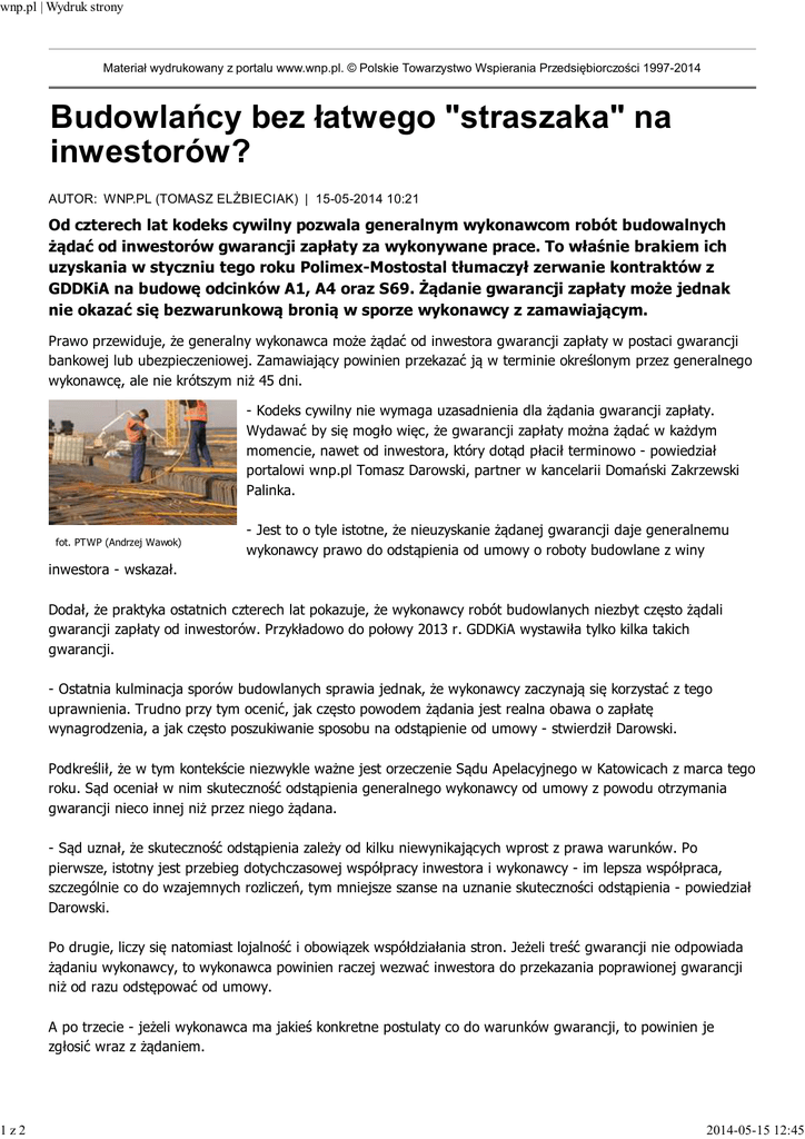 wnp.pl | Wydruk strony 1z2 Materiał wydrukowany z portalu www.wnp.pl. © Polskie Towarzystwo Wspierania Przedsiębiorczości 1997-2014 Budowlańcy bez łatwego "straszaka" na inwestorów? AUTOR: WNP.PL (TOMASZ ELŻBIECIAK) | 15-05-2014 10:21 Od czterech lat kodeks cywilny pozwala generalnym wykonawcom robót budowalnych żądać od inwestorów gwarancji zapłaty za wykonywane prace. To właśnie brakiem ich uzyskania w styczniu tego roku Polimex-Mostostal tłumaczył zerwanie kontraktów z GDDKiA na budowę odcinków A1, A4 oraz S69. Żądanie gwarancji zapłaty może jednak nie okazać się bezwarunkową bronią w sporze wykonawcy z zamawiającym. Prawo przewiduje, że generalny wykonawca może żądać od inwestora gwarancji zapłaty w postaci gwarancji bankowej lub ubezpieczeniowej. Zamawiający powinien przekazać ją w terminie określonym przez generalnego wykonawcę, ale nie krótszym niż 45 dni. - Kodeks cywilny nie wymaga uzasadnienia dla żądania gwarancji zapłaty. Wydawać by się mogło więc, że gwarancji zapłaty można żądać w każdym momencie, nawet od inwestora, który dotąd płacił terminowo - powiedział portalowi wnp.pl Tomasz Darowski, partner w kancelarii Domański Zakrzewski Palinka. fot. PTWP (Andrzej Wawok) - Jest to o tyle istotne, że nieuzyskanie żądanej gwarancji daje generalnemu wykonawcy prawo do odstąpienia od umowy o roboty budowlane z winy inwestora - wskazał. Dodał, że praktyka ostatnich czterech lat pokazuje, że wykonawcy robót budowlanych niezbyt często żądali gwarancji zapłaty od inwestorów. Przykładowo do połowy 2013 r. GDDKiA wystawiła tylko kilka takich gwarancji. - Ostatnia kulminacja sporów budowlanych sprawia jednak, że wykonawcy zaczynają się korzystać z tego uprawnienia. Trudno przy tym ocenić, jak często powodem żądania jest realna obawa o zapłatę wynagrodzenia, a jak często poszukiwanie sposobu na odstąpienie od umowy - stwierdził Darowski. Podkreślił, że w tym kontekście niezwykle ważne jest orzeczenie Sądu Apelacyjnego w Katowicach z marca tego roku. Sąd oceniał w nim skuteczność odstąpienia generalnego wykonawcy od umowy z powodu otrzymania gwarancji nieco innej niż przez niego żądana. - Sąd uznał, że skuteczność odstąpienia zależy od kilku niewynikających wprost z prawa warunków. Po pierwsze, istotny jest przebieg dotychczasowej współpracy inwestora i wykonawcy - im lepsza współpraca, szczególnie co do wzajemnych rozliczeń, tym mniejsze szanse na uznanie skuteczności odstąpienia - powiedział Darowski. Po drugie, liczy się natomiast lojalność i obowiązek współdziałania stron. Jeżeli treść gwarancji nie odpowiada żądaniu wykonawcy, to wykonawca powinien raczej wezwać inwestora do przekazania poprawionej gwarancji niż od razu odstępować od umowy. A po trzecie - jeżeli wykonawca ma jakieś konkretne postulaty co do warunków gwarancji, to powinien je zgłosić wraz z żądaniem. 2014-05-15 12:45 wnp.pl | Wydruk strony 2z2 - Zgłoszenie ogólnikowo sformułowanego żądania daje inwestorowi więcej swobody co do określenia warunków gwarancji i znacząco ogranicza możliwość odstąpienia z powodu nieotrzymania przez wykonawcę „żądanej” gwarancji - podsumował Darowski. Materiał wydrukowany z portalu www.wnp.pl. © Polskie Towarzystwo Wspierania Przedsiębiorczości 1997-2014 2014-05-15 12:45