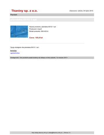 Tkaniny sp. z o.o. Utworzono: sobota, 04 lipiec 2015 Plandeki plandeka 8X10 1 szt Nazwa produktu: plandeka 8X10 1 szt Producent: import Model produktu: 000-432 A Cena: 105,01zł Opcje dostępne dla plandeka 8X10 1 szt : branża agrotechnika. Dostępność: Ten produkt został dodany do sklepu w dniu sobota, 12 marzec 2011 http://sklep.tkaniny.info.pl | [email protected] | | Strona 1/1