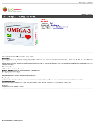 Informacje o produkcie Utworzono 07-03-2017 Gal Omega 3 700mg 300 kaps. Cena : 30.50 zł Producent : Gal Dostępność : Dostępny Stan magazynowy : bardzo wysoki Średnia ocena : brak recenzji Olej z mięśni ryb sardynkowatych NATURALNE KWASY OMEGA-3 Przeznaczenie: Preparat przeznaczony jest jako uzupełnienie codziennej diety w składniki zawarte w oleju rybim, nienasycone kwasy tłuszczowe z rodziny omega-3, głównie kwasy EPA i DHA. Nie są one syntezowane w organizmie ludzkim i powinny być dostarczane wraz z pożywieniem. Badania naukowe potwierdzają, że długołańcuchowe wielonienasycone kwasy tłuszczowe EPA i DHA wpływają na działanie układu krążenia oraz stawów. Odgrywają również ważną rolę w rozwoju i funkcjonowaniu mózgu i oczu. Składniki kapsułki: olej rybi, żelatyna, glicerol (substancja wiążąca) Zawartość składników: na zalecaną dzienną porcję produktu (6 kapsułek 517 mg) Kwas EPA (eikozapentaenowy): 378 mg Kwas DHA (dokozaheksaenowy): 252 mg Białko zawarte w produkcie pochodzi z naturalnych surowców zwierzęcych. Sposób użycia: 3 razy dziennie po 2 kapsułki podczas posiłków. Nie należy przekraczać zalecanej porcji do spożycia w ciągu dnia. Produkt nie może być stosowany jako substytut zróżnicowanej diety. Sposób przechowywania: Przechowywać w temperaturze pokojowej od 15 °C do 25 °C w suchym miejscu. Chronić od światła. Przechowywać w sposób niedostępny dla małych dzieci. Zawartość: 300 kapsułek po 700 mg/1 kapsułkę w blistrach Wygenerowano w programie www.oscGold.com