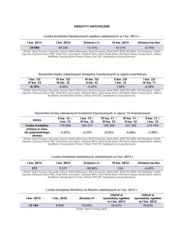 KREDYTY HIPOTECZNE Liczba kredytów hipotecznych ogółem udzielonych w I kw. 2013 r. I kw. 2013 I kw. 2012 Zmiana r./r. IV kw. 2012 Zmiana kw./kw. 39 890 46 245 -13,74% 44 216 -9,78% Źródło: Open Finance. Na podst. danych: Bank Millennium, Bank Pocztowy, Bank BGŻ, BOŚ, BZ WBK, Citi Handlowy, Crédit Agricole, Deutsche Bank PBC, DnB Nord, Euro Bank, GE/Bank BPH, Getin Noble Bank, ING Bank Śląski, Kredyt Bank, mBank, MultiBank, Nordea Bank Polska, Pekao, PKO BP, Spółdzielcza Grupa Bankowa. Dynamika liczby udzielonych kredytów hipotecznych w ujęciu kwartalnym I kw. 13/ IV kw. 12 -9,78% IV kw. 12/ III kw. 12 -3,02% III kw. 12/ II kw. 12 -3,32% II kw. 12/ I kw. 12 1,98% I kw. 12/ IV kw. 11 -8,08% Źródło: Open Finance. Na podst. danych: Bank Millennium, Bank Pocztowy, Bank BGŻ, BOŚ, BZ WBK, Citi Handlowy, Crédit Agricole, Deutsche Bank PBC, DnB Nord, Euro Bank, GE/Bank BPH, Getin Noble Bank, ING Bank Śląski, Kredyt Bank, mBank, MultiBank, Nordea Bank Polska, Pekao, PKO BP, Spółdzielcza Grupa Bankowa. Dynamika liczby udzielonych kredytów hipotecznych w ujęciu 12-miesięcznym okres liczba kredytów zmiana w stos. do poprzedniego okresu II kw. 12 – I kw. 13 176 859 I kw. 12 – IV kw. 12 183 214 IV kw. 11 – III kw. 12 189 309 III kw. 11 – II kw. 12 201 502 II kw. 11 – I kw. 12 214 579 -3,47% -3,22% -6,05% -6,09% -2,98% Źródło: Open Finance. Na podst. danych: Bank Millennium, Bank Pocztowy, Bank BGŻ, BOŚ, BZ WBK, Citi Handlowy, Crédit Agricole, Deutsche Bank PBC, DnB Nord, Euro Bank, GE/Bank BPH, Getin Noble Bank, ING Bank Śląski, Kredyt Bank, mBank, MultiBank, Nordea Bank Polska, Pekao, PKO BP, Spółdzielcza Grupa Bankowa. Liczba kredytów walutowych udzielonych w I kw. 2013 r. I kw. 2013 I kw. 2012 Zmiana r./r. IV kw. 2012 Zmiana kw./kw. 212 5 221 -95,94% 234 -9,40% Źródło: Open Finance. Na podst. danych: Bank Millennium, Bank Pocztowy, Bank BGŻ, BOŚ, BZ WBK, Citi Handlowy, Crédit Agricole, Deutsche Bank PBC, DnB Nord, Euro Bank, GE/Bank BPH, Getin Noble Bank, ING Bank Śląski, Kredyt Bank, mBank, MultiBank, Nordea Bank Polska, Pekao, PKO BP, Spółdzielcza Grupa Bankowa. Liczba kredytów Rodzina na Swoim udzielonych w I kw. 2013 r. I kw. 2013 I kw. 2012 10 184 8 609 Zmiana r/r 18,29% Udział w sprzedaży ogółem w I kw. 2013 25,53% Źródło: Open Finance, BGK. Udział w sprzedaży ogółem w I kw. 2012 18,62%