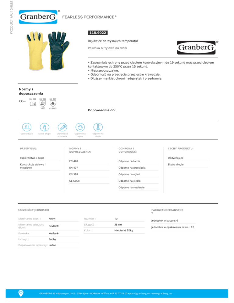 PRODUCT FACT SHEET 118.9022 Rękawice do wysokich temperatur Powłoka nitrylowa na dłoni • Zapewniają ochronę przed ciepłem konwekcyjnym do 19 sekund oraz przed ciepłem kontaktowym do 250°C przez 15 sekund. • Nieprzepuszczalne. • Odporność na przecięcie przez ostre krawędzie. • Dłuższy mankiet chroni nadgarstek i przedramię. Normy i dopuszczenia EN 420 Oddychające EN 388 EN 407 3333 424XXX Ekstra długie Odpowiednie do: Odporne na przecięcia PRZEMYSŁU: Odporne na ogień Odporne na ciepło NORMY I DOPUSZCZENIA: OCHRONA I ODPORNOŚĆ: EN 420 Odporne na tarcie EN 407 Odporne na przecięcia EN 388 Odporne na ogień CE Cat.II Odporne na ciepło Papiernictwo i pulpa CECHY PRODUKTU: Oddychające Konstrukcje stalowe i metalowe Ekstra długie Odporne na rozdarcie SZCZEGÓŁY JEDNOSTKI Materiał na dłoni : Nitryl Materiał na wierzchu dłoni : Kevlar® Powłoka : Kevlar® Uchwyt : Suchy PAKOWANIE/TRANSPOR T Rozmiar : 10 Długość : 35 cm Kolor : Niebieski, Żółty Jednostek w paczce: 6 Jednostek w opakowaniu zewn. : 12 Dopasowanie rękawicy : Luźne GRANBERG AS • Bjoavegen 1442 • 5584 Bjoa • NORWAY • Office: +47 53 77 53 00 • [email protected] • www.granberg.no