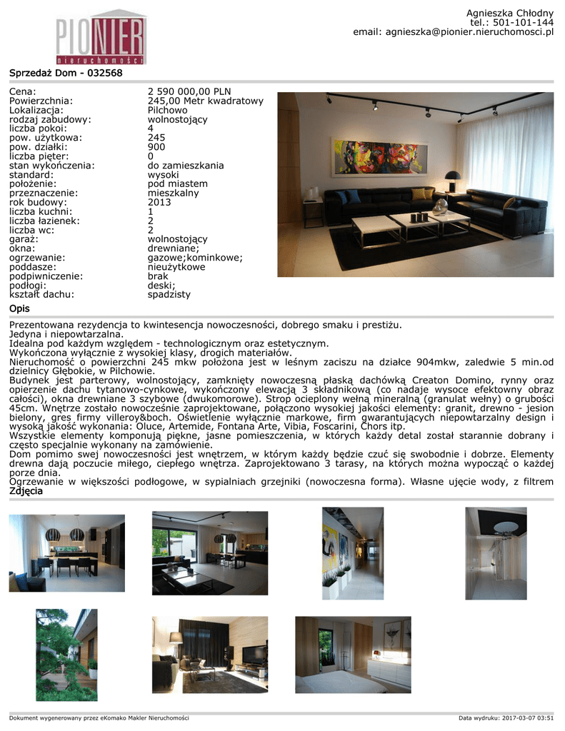 Agnieszka Chłodny tel.: 501-101-144 email: [email protected] Sprzedaż Dom - 032568 Cena: Powierzchnia: Lokalizacja: rodzaj zabudowy: liczba pokoi: pow. użytkowa: pow. działki: liczba pięter: stan wykończenia: standard: położenie: przeznaczenie: rok budowy: liczba kuchni: liczba łazienek: liczba wc: garaż: okna: ogrzewanie: poddasze: podpiwniczenie: podłogi: kształt dachu: Opis 2 590 000,00 PLN 245,00 Metr kwadratowy Pilchowo wolnostojący 4 245 900 0 do zamieszkania wysoki pod miastem mieszkalny 2013 1 2 2 wolnostojący drewniane; gazowe;kominkowe; nieużytkowe brak deski; spadzisty Prezentowana rezydencja to kwintesencja nowoczesności, dobrego smaku i prestiżu. Jedyna i niepowtarzalna. Idealna pod każdym względem - technologicznym oraz estetycznym. Wykończona wyłącznie z wysokiej klasy, drogich materiałów. Nieruchomość o powierzchni 245 mkw położona jest w leśnym zaciszu na działce 904mkw, zaledwie 5 min.od dzielnicy Głębokie, w Pilchowie. Budynek jest parterowy, wolnostojący, zamknięty nowoczesną płaską dachówką Creaton Domino, rynny oraz opierzenie dachu tytanowo-cynkowe, wykończony elewacją 3 składnikową (co nadaje wysoce efektowny obraz całości), okna drewniane 3 szybowe (dwukomorowe). Strop ocieplony wełną mineralną (granulat wełny) o grubości 45cm. Wnętrze zostało nowocześnie zaprojektowane, połączono wysokiej jakości elementy: granit, drewno - jesion bielony, gres firmy villeroy&boch. Oświetlenie wyłącznie markowe, firm gwarantujących niepowtarzalny design i wysoką jakość wykonania: Oluce, Artemide, Fontana Arte, Vibia, Foscarini, Chors itp. Wszystkie elementy komponują piękne, jasne pomieszczenia, w których każdy detal został starannie dobrany i często specjalnie wykonany na zamówienie. Dom pomimo swej nowoczesności jest wnętrzem, w którym każdy będzie czuć się swobodnie i dobrze. Elementy drewna dają poczucie miłego, ciepłego wnętrza. Zaprojektowano 3 tarasy, na których można wypocząć o każdej porze dnia. Ogrzewanie w większości podłogowe, w sypialniach grzejniki (nowoczesna forma). Własne ujęcie wody, z filtrem Zdjęcia Dokument wygenerowany przez eKomako Makler Nieruchomości Data wydruku: 2017-03-07 03:51