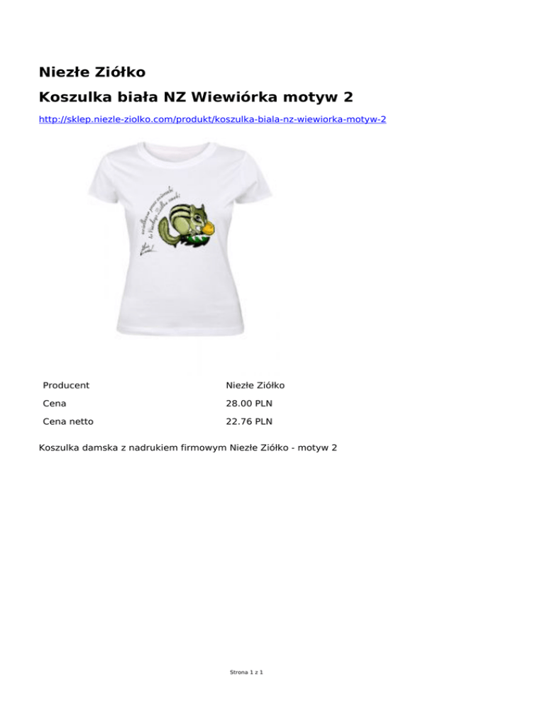 Niezłe Ziółko Koszulka biała NZ Wiewiórka motyw 2 http://sklep.niezle-ziolko.com/produkt/koszulka-biala-nz-wiewiorka-motyw-2 Producent Niezłe Ziółko Cena 28.00 PLN Cena netto 22.76 PLN Koszulka damska z nadrukiem firmowym Niezłe Ziółko - motyw 2 Strona 1 z 1