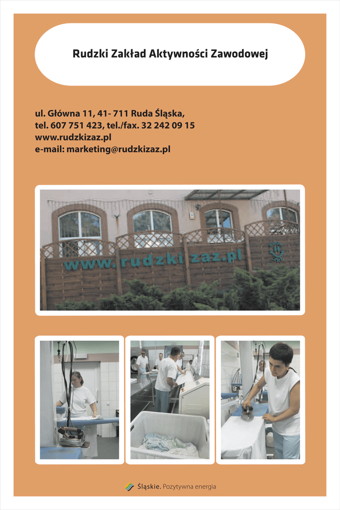 Rudzki Zakład Aktywności Zawodowej ul. Główna 11, 41- 711 Ruda Śląska, tel. 607 751 423, tel./fax. 32 242 09 15 www.rudzkizaz.pl e-mail: [email protected] Rudzki Zakład Aktywności Zawodowej zatrudnia 90 pracowników niepełnosprawnych. Większość z nich pracuje w działach usługowych. Dział usług pralniczych świadczy usługi na najwyższym poziomie, z pełną dezynfekcją i barierą higieniczną przy użyciu atestowanych środków wysokiej jakości. Wyprane, wymaglowane lub wyprasowane pranie pakowane jest w folię. Zakład zapewnia również własny transport odbieranego od klientów i dowożonego na miejsce towaru. Jego kontrahentami są przede wszystkim placówki służby zdrowia, firmy i instytucje. Dział usług szwalniczo-dekoratorskich wyposażony jest w nowoczesne maszyny do szycia i hafciarki. Pracownicy niepełnosprawni zgłębiają tajniki krawiectwa, poznają obsługę maszyn, czy też techniki hafciarstwa. Prócz drobnych usług krawieckich i reparacyjnych pracownicy wykonują na zlecenie klienta duże zamówienia, w tym: komplety pościeli, ręczniki frotte, ściereczki kuchenne, mundurki medyczne, komplety sportowe z polaru, bielizna nocna, alby komunijne itd. Na indywidualne życzenia artykuły przyozdabia się wybranym haftem. Integralną częścią szwalni jest dekoratornia. Tu powstają przepiękne stroiki, ekologiczne lale z kompletami ubranek, maskotki, jednorazowe okolicznościowe kartki, niepowtarzalne ozdoby świąteczne itp. Gotowe wyroby można obejrzeć na stronie internetowej.