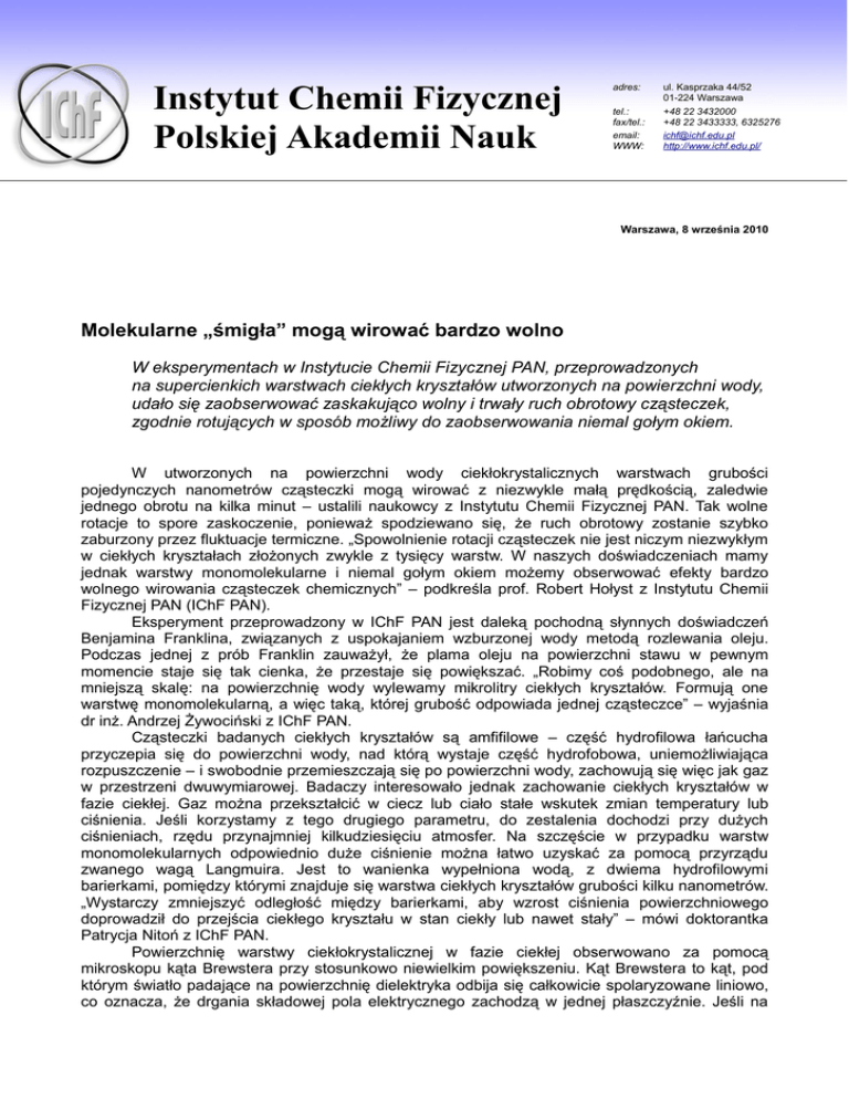 Instytut Chemii Fizycznej Polskiej Akademii Nauk adres: tel.: fax/tel.: email: WWW: ul. Kasprzaka 44/52 01-224 Warszawa +48 22 3432000 +48 22 3433333, 6325276 [email protected] http://www.ichf.edu.pl/ Warszawa, 8 września 2010 Molekularne „śmigła” mogą wirować bardzo wolno W eksperymentach w Instytucie Chemii Fizycznej PAN, przeprowadzonych na supercienkich warstwach ciekłych kryształów utworzonych na powierzchni wody, udało się zaobserwować zaskakująco wolny i trwały ruch obrotowy cząsteczek, zgodnie rotujących w sposób możliwy do zaobserwowania niemal gołym okiem. W utworzonych na powierzchni wody ciekłokrystalicznych warstwach grubości pojedynczych nanometrów cząsteczki mogą wirować z niezwykle małą prędkością, zaledwie jednego obrotu na kilka minut – ustalili naukowcy z Instytutu Chemii Fizycznej PAN. Tak wolne rotacje to spore zaskoczenie, ponieważ spodziewano się, że ruch obrotowy zostanie szybko zaburzony przez fluktuacje termiczne. „Spowolnienie rotacji cząsteczek nie jest niczym niezwykłym w ciekłych kryształach złożonych zwykle z tysięcy warstw. W naszych doświadczeniach mamy jednak warstwy monomolekularne i niemal gołym okiem możemy obserwować efekty bardzo wolnego wirowania cząsteczek chemicznych” – podkreśla prof. Robert Hołyst z Instytutu Chemii Fizycznej PAN (IChF PAN). Eksperyment przeprowadzony w IChF PAN jest daleką pochodną słynnych doświadczeń Benjamina Franklina, związanych z uspokajaniem wzburzonej wody metodą rozlewania oleju. Podczas jednej z prób Franklin zauważył, że plama oleju na powierzchni stawu w pewnym momencie staje się tak cienka, że przestaje się powiększać. „Robimy coś podobnego, ale na mniejszą skalę: na powierzchnię wody wylewamy mikrolitry ciekłych kryształów. Formują one warstwę monomolekularną, a więc taką, której grubość odpowiada jednej cząsteczce” – wyjaśnia dr inż. Andrzej Żywociński z IChF PAN. Cząsteczki badanych ciekłych kryształów są amfifilowe – część hydrofilowa łańcucha przyczepia się do powierzchni wody, nad którą wystaje część hydrofobowa, uniemożliwiająca rozpuszczenie – i swobodnie przemieszczają się po powierzchni wody, zachowują się więc jak gaz w przestrzeni dwuwymiarowej. Badaczy interesowało jednak zachowanie ciekłych kryształów w fazie ciekłej. Gaz można przekształcić w ciecz lub ciało stałe wskutek zmian temperatury lub ciśnienia. Jeśli korzystamy z tego drugiego parametru, do zestalenia dochodzi przy dużych ciśnieniach, rzędu przynajmniej kilkudziesięciu atmosfer. Na szczęście w przypadku warstw monomolekularnych odpowiednio duże ciśnienie można łatwo uzyskać za pomocą przyrządu zwanego wagą Langmuira. Jest to wanienka wypełniona wodą, z dwiema hydrofilowymi barierkami, pomiędzy którymi znajduje się warstwa ciekłych kryształów grubości kilku nanometrów. „Wystarczy zmniejszyć odległość między barierkami, aby wzrost ciśnienia powierzchniowego doprowadził do przejścia ciekłego kryształu w stan ciekły lub nawet stały” – mówi doktorantka Patrycja Nitoń z IChF PAN. Powierzchnię warstwy ciekłokrystalicznej w fazie ciekłej obserwowano za pomocą mikroskopu kąta Brewstera przy stosunkowo niewielkim powiększeniu. Kąt Brewstera to kąt, pod którym światło padające na powierzchnię dielektryka odbija się całkowicie spolaryzowane liniowo, co oznacza, że drgania składowej pola elektrycznego zachodzą w jednej płaszczyźnie. Jeśli na drodze tak spolaryzowanego światła ustawi się filtr polaryzujący w płaszczyźnie poprzecznej, zatrzyma on całe odbite światło i pod mikroskopem Brewstera czysta woda będzie wyglądała na czarną. Jeśli jednak na powierzchni wody znajdzie się coś, co skręca płaszczyznę polaryzacji, pojawią się jasne refleksy. W doświadczeniach przeprowadzonych w Instytucie Chemii Fizycznej PAN analizowano, jak zachowuje się na powierzchni wody monomolekularna warstwa ferroelektrycznego ciekłego kryształu typu smektyk C*. Smektyki C* charakteryzują się tym, że cząsteczki samoczynnie układają się w nich w warstwy, przy czym kolejne warstwy są względem siebie nieco obrócone. „My mamy tylko jedną warstwę, którą można sobie wyobrażać jako las cząsteczek, zgodnie nachylonych pod pewnym kątem” – opisuje dr inż. Żywociński. Gdy cząsteczki wody parują, uderzają w różnej wielkości grupy atomów, połączone w każdej cząsteczce ciekłego kryształu z asymetrycznym (chiralnym) atomem węgla. Asymetria powoduje, że wystające nad powierzchnię wody fragmenty cząsteczek ciekłych kryształów działają jak śmigła napędzanego wiatrem wiatraka i zaczynają kolektywnie się obracać (efekt ten po raz pierwszy zaobserwował prof. Hiroshi Yokoyama z Japonii). Aby cząsteczka wykazywała zdolność do rotacji, musi być w odpowiedni sposób skonstruowana. Grupa polarna, która trzyma ją przy powierzchni wody, nie powinna być za duża, ponieważ byłaby zanurzona za głęboko i hamowałaby rotację wywołaną przez asymetryczną grupę chiralną, w którą uderzają cząsteczki parującej wody. Z kolei grupa chiralna musi utrzymywać się wyraźnie nad powierzchnią. Rotujące cząsteczki zmieniają płaszczyznę polaryzacji odbitego światła i w polu widzenia mikroskopu Brewstera, obejmującym kilkadziesiąt milimetrów kwadratowych, pojawiają się obszary o cyklicznie zmieniającej się jasności. Najszybszy zarejestrowany w ten sposób czas obrotu cząsteczek wynosił pięć sekund, najdłuższy aż osiem minut. Prawdopodobnie można uzyskać obroty jeszcze wolniejsze, jednak nie poprzez obniżanie temperatury (ciekły kryształ przechodzi wówczas do fazy stałej), lecz nasycając powietrze parą wodną, co obniżyłoby szybkość parowania, a zatem i częstotliwość zderzeń cząsteczek wody ze „śmigłami” ciekłych kryształów. Wolno rotujące cząsteczki ciekłych kryszta
