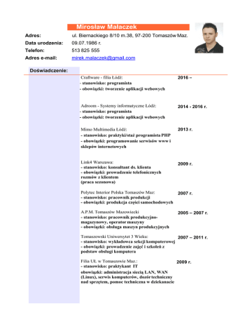 Mirosław Małaczek Adres: ul. Biernackiego 8/10 m.38, 97-200 Tomaszów Maz. Data urodzenia: 09.07.1986 r. Telefon: 513 825 555 Adres e-mail: [email protected] Doświadczenie: Craftware - filia Łódź: - stanowisko: programista - obowiązki: tworzenie aplikacji webowych 2016 – Adroom - Systemy informatyczne Łódź: - stanowisko: programista - obowiązki: tworzenie aplikacji webowych 2014 - 2016 r. Mimo Multimedia Łódź: - stanowisko: praktyki/staż programista PHP - obowiązki: programowanie serwisów www i sklepów internetowych 2013 r. Link4 Warszawa: - stanowisko: konsultant ds. klienta - obowiązki: prowadzenie telefonicznych rozmów z klientem (praca sezonowa) 2009 r. Polytec Interior Polska Tomaszów Maz: - stanowisko: pracownik produkcji - obowiązki: produkcja części samochodowych 2007 r. A.P.M. Tomaszów Mazowiecki - stanowisko: pracownik produkcyjnomagazynowy, operator maszyny - obowiązki: obsługa maszyn produkcyjnych 2005 – 2007 r. Tomaszowski Uniwersytet 3 Wieku: 2007 – 2011 r. - stanowisko: wykładowca sekcji komputerowej - obowiązki: prowadzenie zajęć i szkoleń z podstaw obsługi komputera Filia UŁ w Tomaszowie Maz.: 2009 r. - stanowisko: praktykant IT obowiązki: administracja siecią LAN, WAN (Linux), serwis komputerów, dozór techniczny nad sprzętem, pomoc techniczna w dziekanacie Tworzenie stron internetowych technologii PHP + MySQL oraz prostych programów komputerowych w językach programowania C#, Basic na zlecenia Wykształcenie: Uniwersytet Łódzki, kierunek: Informatyka, Wydział Matematyki i Informatyki, studia dzienne magisterskie Od 2010 r. Filia Uniwersytetu Łódzkiego, kierunek: Informatyka, studia dzienne licencjackie 2007 – 2010 r. Centrum Nauki i Biznesu „Żak”, Studium policealne, kierunek: Informatyka 2005 – 2007 r. ZPSZiO, IV Liceum Profilowane w Tomaszowie, Profil: kształtowanie środowiska 2002 – 2005 r. Szkolenia: 2013 r. Piękne aplikacje Windows 8 z Modern UI szkolenie organizowane przez firmę Microsoft Szkolenie z mobilnych platform informatycznych organizowane przez firmę Agreeya Mobility 2012 r. Szkolenie z retuszu portretów w programie Adobe Photoshop organizowane przez firmę Digi Photo 2012 r. Szkolenie z warsztatów języka SQL organizowane przez firmę Accenture 2011 r. Języki: J. angielski – średni Umiejętności: systemy operacyjne: Windows 7/8, Linux; znajomość języków programowania: PHP, C++, C#, Basic; znajomość baz danych: MySQL, PostgreSQL, MSSQL Server, oraz języka zapytań SQL; znajomość języków HTML, CSS, JavaScript, JQuery; znajomość systemów CMS: Magento, Prestashop, WordPress, Contao; znajomość frameworków: Symfony2, Zend; znajomość systemów kontroli wersji: Git, SVN; podstawowa znajomość pozycjonowania stron internetowych SEO; podstawy grafiki komputerowej 2D w Adobe Photoshop; tworzenie grafiki komputerowej 3D: Blender; znajomość pakietu biurowego MS Office 2007/2010/2013; Zainteresowania: Komputery, internet, gry komputerowe, filmy, sport, podróże, muzyka rozrywkowa Wyrażam zgodę na przetwarzanie moich danych osobowych zawartych w niniejszym CV dla potrzeb realizacji procesu rekrutacji zgodnie z ustawą z dnia 29.08.1997 r. o ochronie danych osobowych (tj. Dz. U. Nr 133, poz. 883)