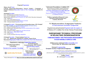 Program/Programme Miejsce obrad/Venue: Centrum Innowacyjno-Wdrożeniowe Nowych Technik i Technologii w Inżynierii Rolniczej (Innovation Centre of New Technology) ul. Głęboka 28, Lublin 20 listopad/November 8.00 – 9:30 Rejestracja uczestników/Registration 9.30 - Otwarcie Sympozjum / Opening of the Symposium Jubileusz pracy naukowej/Jubilee of scientific work prof. dr hab. Mieczyława Szpryngiela 12.00 – Obiad/lunch 13.30 - 17.30 - Sesja naukowa/Session 18.30 - Wyjazd na uroczystą kolację/Departure for dinner 19.00 – Uroczysta kolacja/Symposium Dinner 21 listopad/November - Wytwórnia Sprzętu Komunikacyjnego „PZL-Świdnik” S. A./PZL-Świdnik, an AgustaWestland Company (helicopter plant), 8.00 – Wyjazd do Świdnika/Departure to Swidnik 8.30 - Powitanie gości i prezentacja firmy/Welcome and presentation of the company 9.00 – 12.00 – Sesja/Session 12.00 - Zwiedzanie zakładu i obiad/Visit to the Plant and lunch 15.00 – Sesja/Session – Innovation Centre 17.30 – Kolacja/Dinner 18.30 – Zawody strzeleckie/ Shooting competition 22 listopad/November - Wyjazd studyjny/Study tour 8.00 – 16.00 – Biogazownia, gospodarstwo rodzinne, Zamość (Perła Renesansu)/Biogas plant, Family farm, Zamość (The Pearl of the Renaissance) Organizatorzy wspierający/Supporting organizer Marszałek Województwa Lubelskiego/ Wytwórnia Sprzętu Komunikacyjnego „PZL-Świdnik”, AgustaWestland company Marshal of the Lubelskie Voivodship Polskie Towarzystwo Inżynierii Rolniczej Oddział Lublin Polish Society of Agricultural Engineering (Lublin branch) Więcej informacji/More info: http://www.kemiz.up.lublin.pl/index.php?id=konferencje Uniwersytet Przyrodniczy w Lublinie (UP) Wydział Inżynierii Produkcji, Katedra Eksploatacji Maszyn i Zarządzania Procesami Produkcyjnymi University of Life Sciences in Lublin, POLAND Faculty of Production Engineering Department of Machinery Exploitation and Management of Production Processes Walloon Agricultural Research Centre Agricultural Engineering Department Gembloux, BELGIUM VI Międzynarodowe Sympozjum Naukowe VI International Scientific Sy mposium Organizowane pod patronatem/Organized under the auspices of JM Rektora UP w Lublinie Prof. dr hab. Mariana Wesołowskiego ZARZĄDZANIE TECHNIKĄ I PROCESAMI W ROLNICTWIE ZRÓWNOWAŻONYM FARM MACHINERY AND PROCESSES MANAGEMENT IN SUSTAINABLE AGRICULTURE Jubileusz pracy naukowej/Jubilee of scientific work Prof. dr hab. inż. Mieczysława Szpryngiela Patronat/Co-sponsorship European Society of Agricultural Engineers Sympozjum organizowane w ramach projektu badawczego/ The Symposium is organized in the frame of research project „Optymalizacja składu i aglomeracji ciśnieniowej biomasy roślinnej w aspekcie parametrów spalania w instalacjach grzewczych małej mocy” Lublin, Poland 20 – 22 listopad/November 2013 Komitet Programowo-Organizacyjny/Programme & Organizing Committee Przewodniczący/Chairmen Prof. dr hab. Józef Sawa Prof. dr ir. Yves Schenkel University of Life Sciences in Lublin/POLAND CRA-W Gembloux/BELGIUM Członkowie/Members Ir. Bruno Huyghebaert Prof. dr hab. Edmund Lorencowicz CRA-W Gembloux/BELGIUM University of Life Sciences in Lublin/POLAND BOKU - University of Natural Resources and Dr Gerhard Moitzi Life Sciences, Vienna/AUSTRIA University of Life Sciences in Lublin/POLAND Prof. dr hab. Janusz Nowak Atatürk University, Erzurum/TURKEY Prof. dr. Taskin Oztas Technological Educational Institute of Prof. Athanassios Papageorgiou Kalamata/GREECE Prof. ing. Giacomo Scarascia-Mugnozza University of Bari Aldo Moro /ITALY University of Life Sciences in Lublin/POLAND Prof. dr hab. Mieczysław Szpryngiel University of Botswana/BOTSWANA Prof. dr Jacek Uziak Zespół organizacyjny/Organizing team Dr inż. Magdalena Kachel-Jakubowska Dr inż. Milan Koszel Dr inż. Artur Kraszkiewicz University of Life Sciences in Lublin/POLAND Dr inż. Stanisław Parafiniuk Dr inż. Artur Przywara Sekretarz/Secretary Katedra Eksploatacji Maszyn i Zarządzania Procesami Produkcyjnymi; Uniwersytet Przyrodniczy w Lublinie, Dr inż. Sławomir Kocira ul. Poniatowskiego 1, 20-060 Lublin, Poland tel. +48 81 710 47 20; +48 710 47 11; Fax. +48 81 531 83 21; e-mail: [email protected] Tematyka sympozjum/Symposium themes Techniki i procesy produkcyjne w standardach rolnictwa zrównoważonego/Farm machinery and processes in sustainable agriculture standards. Biomasa i jej energetyczne zagospodarowanie w standardach rolnictwa zrównoważonego/Biomass and its energy application in sustainable agriculture standards. Ochrona roślin w standardach rolnictwa zrównoważonego/Plant protection in sustainable agriculture standards. Tematy szczegółowe/Topics Zarządzanie techniką w produkcji roślinnej i zwierzęcej/Management of field and livestock production machinery; Zarządzanie produkcją biomasy/Management of biomass production; Ochrona roślin i aplikacja agrochemikaliów/Plant protection and agrochemicals application; Redukcja kosztów i nakładów materiałowo-energetycznych/Reduction of costs and inputs of materials and energy; Zarządzanie glebą/Soil management for heavy field traffics; Ergonomia i organizacja pracy/Ergonomic and labor organization; Rolnictwo zrównoważone w UE/Sustainable agriculture in the EU; Edukacja inżynierska w rolnictwie/Engineering education in agriculture. Języki sympozjum/Languages Angielski i polski/English and Polish Tekst prezentacji w języku angielskim/Presentation materials will be in English Publikacje/Publications Nadesłane skróty referatów będą opublikowane w materiałach z sympozjum. Pełne teksty referatów zgłoszone zostaną do publikacji w następujących czasopismach naukowych: The short version of submitted papers will be published in the symposium proceedings. The full text of papers will be submitted for publication in the following scientific journals: Journal of Central European Agriculture, Electronic Journal of Polish Agricultural Universities – Agricult