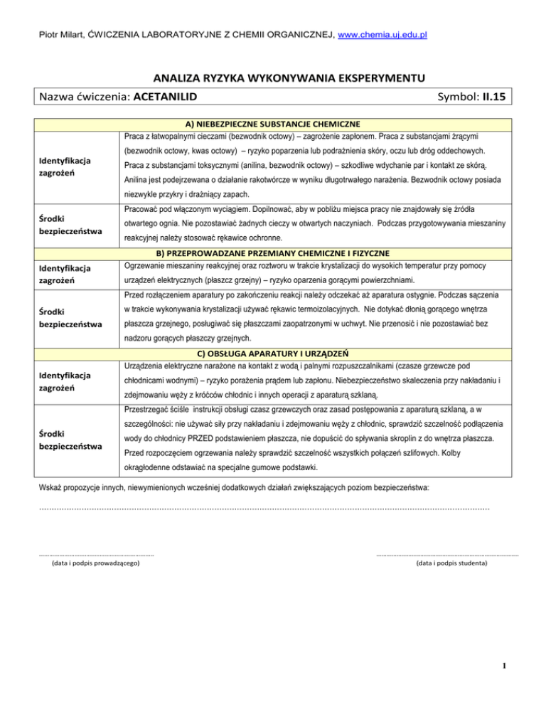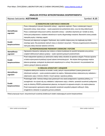 Piotr Milart, ĆWICZENIA LABORATORYJNE Z CHEMII ORGANICZNEJ, www.chemia.uj.edu.pl ANALIZA RYZYKA WYKONYWANIA EKSPERYMENTU Nazwa ćwiczenia: ACETANILID Symbol: II.15 A) NIEBEZPIECZNE SUBSTANCJE CHEMICZNE Praca z łatwopalnymi cieczami (bezwodnik octowy) – zagrożenie zapłonem. Praca z substancjami żrącymi (bezwodnik octowy, kwas octowy) – ryzyko poparzenia lub podrażnienia skóry, oczu lub dróg oddechowych. Identyfikacja zagrożeń Praca z substancjami toksycznymi (anilina, bezwodnik octowy) – szkodliwe wdychanie par i kontakt ze skórą. Anilina jest podejrzewana o działanie rakotwórcze w wyniku długotrwałego narażenia. Bezwodnik octowy posiada niezwykle przykry i drażniący zapach. Pracować pod włączonym wyciągiem. Dopilnować, aby w pobliżu miejsca pracy nie znajdowały się źródła Środki bezpieczeństwa otwartego ognia. Nie pozostawiać żadnych cieczy w otwartych naczyniach. Podczas przygotowywania mieszaniny Identyfikacja zagrożeń Ogrzewanie mieszaniny reakcyjnej oraz roztworu w trakcie krystalizacji do wysokich temperatur przy pomocy reakcyjnej należy stosować rękawice ochronne. B) PRZEPROWADZANE PRZEMIANY CHEMICZNE I FIZYCZNE urządzeń elektrycznych (płaszcz grzejny) – ryzyko oparzenia gorącymi powierzchniami. Przed rozłączeniem aparatury po zakończeniu reakcji należy odczekać aż aparatura ostygnie. Podczas sączenia Środki bezpieczeństwa w trakcie wykonywania krystalizacji używać rękawic termoizolacyjnych. Nie dotykać dłonią gorącego wnętrza płaszcza grzejnego, posługiwać się płaszczami zaopatrzonymi w uchwyt. Nie przenosić i nie pozostawiać bez nadzoru gorących płaszczy grzejnych. C) OBSŁUGA APARATURY I URZĄDZEŃ Urządzenia elektryczne narażone na kontakt z wodą i palnymi rozpuszczalnikami (czasze grzewcze pod Identyfikacja zagrożeń chłodnicami wodnymi) – ryzyko porażenia prądem lub zapłonu. Niebezpieczeństwo skaleczenia przy nakładaniu i zdejmowaniu węży z króćców chłodnic i innych operacji z aparaturą szklaną. Przestrzegać ściśle instrukcji obsługi czasz grzewczych oraz zasad postępowania z aparaturą szklaną, a w szczególności: nie używać siły przy nakładaniu i zdejmowaniu węży z chłodnic, sprawdzić szczelność podłączenia Środki bezpieczeństwa wody do chłodnicy PRZED podstawieniem płaszcza, nie dopuścić do spływania skroplin z do wnętrza płaszcza. Przed rozpoczęciem ogrzewania należy sprawdzić szczelność wszystkich połączeń szlifowych. Kolby okrągłodenne odstawiać na specjalne gumowe podstawki. Wskaż propozycje innych, niewymienionych wcześniej dodatkowych działań zwiększających poziom bezpieczeństwa: ……………………………………………………………………………………………………………………………………………………………… ………………………………………………………….. (data i podpis prowadzącego) …………………………………….………………………………….. (data i podpis studenta) 1