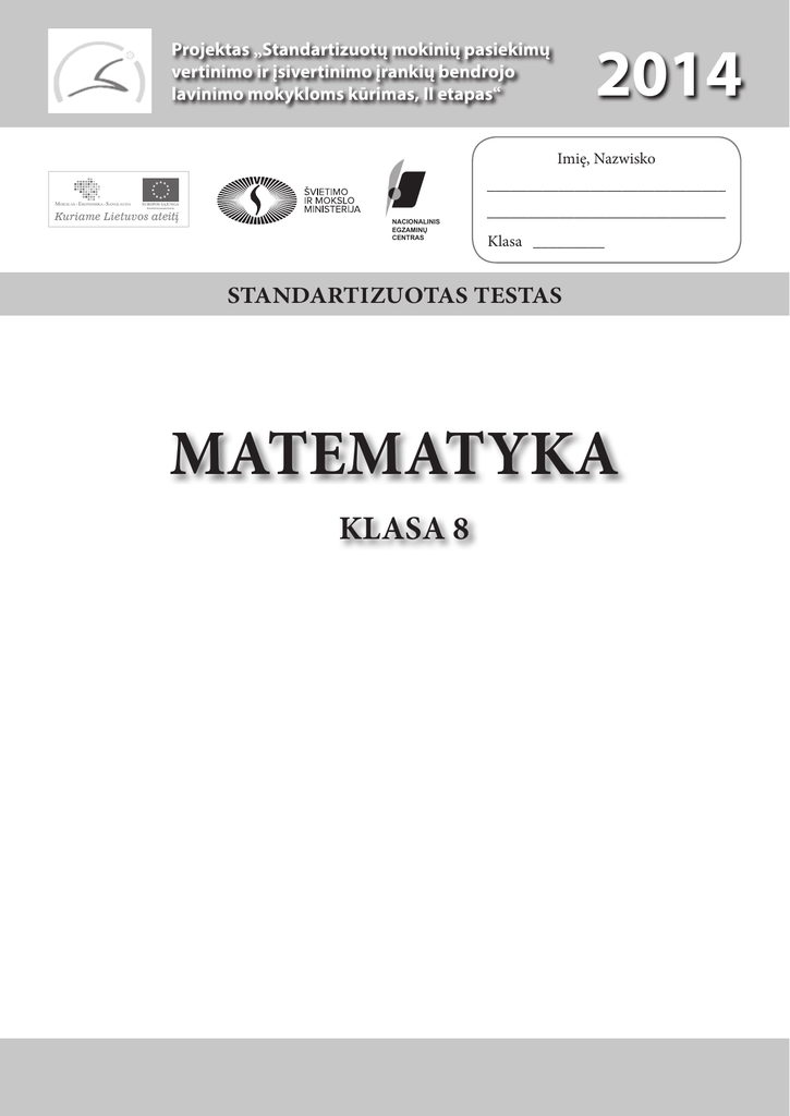 2014 Projektas „Standartizuotų mokinių pasiekimų vertinimo ir įsivertinimo įrankių bendrojo lavinimo mokykloms kūrimas, II etapas“ Imię, Nazwisko ______________________________ MOKSLAS • EKONOMIKA • SANGLAUDA EUROPOS SĄJUNGA EUROPOS SOCIALINIS FONDAS Kuriame Lietuvos ateitiį Nacionalinis egzaminų centras ______________________________ Klasa _________ Standartizuotas testas MatematYka Klasa 8 matematYka 1 Wycieczka w ogrodzie botanicznym rozpoczyna się o 14 godz. 10 min. i trwa 155 min. Kiedy się wycieczka skończy? ● Odpowiedź:_____________ 2 Po odnowieniu domu letniskowego, jego cena wzrosła o 25%. Właściciel w ogłoszeniu o sprzedaży tego domu popełnił błąd – nieprawidłowo podał nową cenę domu. Jaka powinna być nowa cena domu? ● Stara cena 60 000 Lt Nowa cena 80 000 Lt Odpowiedź:_____________ 3 Do ulepienia kołdunów bierze się 2,5 szklanki mąki, jeśli się ma 0,5 kg mięsa. Ile szklanek mąki należy wziąć dla 2 kg mięsa? ● Odpowiedź:_____________ 4 W pewnym gospodarstwie zebrano 23,7 t jabłek, a w innym gospodarstwie zebrano o 0,8 t mniej. Ile ton jabłek zebrano w obu gospodarstwach? ● Odpowiedź:_____________ 5 ●● Jeśli zauważyłeś zasadę, według której są wpisywane liczby, uzupełnij tabelkę. 30 15 32 17 34 19 36 Klasa 8 1 matematYka 6 s (km) Rysunek przedstawia zależność przebytej drogi s (km) od czasu t (h) ruchu rowerzysty. Ile kilometrów pokonał rowerzysta w ciągu ostatniej godziny jazdy? 70 60 50 40 30 20 10 Odpowiedź:_____________ 7 ● 0 1 2 3 t (godz.) 4 Wiadomo, że ΔEFG = ΔEHG, EF = 7 cm, HG = 10 cm. Zapisz długości odcinków FG i EH. F ● E Odpowiedź: FG = _________ cm, EH = _________ cm. 8 H G Oblicz: ( 13 − 3 )( 13 + 3 ) = a b c d 9 ● 4 7 10 22 Po burzy bez prądu zostały 13 843 gospodarstwa domowe. Zapisz tę liczbę z dokładnością do tysięcy. ● Odpowiedź:_____________ 10 2 Oblicz: 5 11 + = 16 16 10.1 − 10.2 (− 2)3 + Klasa 8 0,25 = ● ●● matematYka 11 12 ● Na której kartce wypisano liczby, które otrzymano, obliczając wartości wyrażenia 4n, gdy n = 1, 2, 3, 4? 4, 7, 12, 19 4, 8, 12, 16 4, 9, 16, 25 4, 10, 18, 28 a b c d ● Rozwiąż równanie: – 3x = 9 Odpowiedź:_____________ 13 Przedstaw na osi liczbowej wszystkie rozwiązania nierówności – 3 ≤ x ≤ 4,5. ● 14 Rozwiąż nierówność 2x + 14 ≤ 4x – 6. Zapisz rozwiązanie. ●● Rozwiązanie: Odpowiedź:_____________ 15 ( ) 6 ● x 12 Jaką liczbę należy wpisać w miejsce x, aby była prawdziwa równość 4 = 4 ? Odpowiedź:_____________ Klasa 8 3 matematYka 16 W pudełku leżą cztery kolorowe ołówki jednakowej wielkości: czerwony, niebieski, żółty i zielony. Losowo wyjmujemy z pudełka jeden ołówek. Ile jest wyników sprzyjających zdarzeniu “Wybraliśmy ołówek czerwony albo ołówek niebieski”? ● Odpowiedź:_____________ 17 Rajmundowi złożenie pudełka zajęło szóstą części godziny. Ile takich pudełek zrobiłby Rajmund w ciągu pół godziny? ● Odpowiedź:_____________ 18 Masa sześciu jednakowych jabłek jest równa masie pudełka, do którego włożono dwa takie same jabłka. Jaka jest masa jednego jabłka, jeżeli masa pudełka jest równa pół kilograma? ● Odpowiedź:_____________ 19 W stołówce szkolnej sprzedaje się herbatę dwóch gatunków – zieloną i czarną oraz bułeczki trzech rodzajów – z twarogiem, dżemem i czekoladą. Ile dni Tomek mógłby jeść różne śniadania składające się z kubka herbaty i jednej bułeczki? ● Odpowiedź:_____________ 20 Marzena miała 3 naszyjniki. Najpierw każdy naszyjnik wymieniła na 2 spinki do włosów, a następnie każdą spinkę na 3 nalepki. Ile nalepek ma teraz Marzena? Odpowiedź:_____________ 4 Klasa 8 ● matematYka 21 W szkole lekcje rozpoczynają się o 8 godz. Szymon do szkoły ma 600 metrów. Z domu on wyszedł o 7 godz. 45 min., a w ciągu minuty pokonuje 50 m. Czy nie spóźni się Szymon na pierwszą lekcję? Wybierz odpowiedź i ją uzasadnij. Spóźni się □ 1 Nie spóźni się □ ●● 2 Gdyż: __________________________________________________________________ ____________________________________________________________________________ ____________________________________________________________________________ 22 Rozmiar pierścionka zależy od długości średnicy wewnętrznego okręgu. Rysunek przedstawia pierścionki różnych rozmiarów i podane są długości średnic ich wewnętrznych okręgów. Rozmiar 5 dydis 5 15,7 mm 22.1 Rozmiar 6 dydis 6 Rozmiar 7 dydis 7 16,5 mm 17,3 mm Rozmiar 8 dydis 8 Rozmiar 9 dydis 9 18,2 mm 18,9 mm Jaką długość (z dokładnością do 0,1 mm) ma wewnętrzny okrąg pierścionka rozmiaru 8? Zapisz rozwiązanie. Rozwiązanie: ●● Odpowiedź:_____________ 22.2 Dziewczyna chce kupić pierścionek. Długość wewnętrznego okręgu pierścionka jest równa 51 mm. Jaki powinien być rozmiar jej pierścionka? Zapisz rozwiązanie. Rozwiązanie: ●● Odpowiedź:_____________ Klasa 8 5 matematYka 23 W którym przypadku suma kątów sześciokąta nie jest równa sumie kątów figur, z których on się składa? a 24 b c ● d Rysunek przedstawia siatkę, z której można złożyć walec. 12 24.1 ● Jaka będzie wysokość otrzymanego walca? 5 Odpowiedź:_____________ 24.2 12 Oblicz objętość tego walca. (Objętość walca oblicza się według wzoru V = �r²h. Odpowiedź zapisz z �). Zapisz rozwiązanie. Rozwiązanie: ●● Odpowiedź:_____________ 25 Rysunek przedstawia cztery sposoby, jak za pomocą jednej linii prostej można podzielić równoległobok na dwie równe części. Pokaż jeszcze jeden sposób, jak równoległobok jedną linią prostą można podzielić na dwie równe części. 6 Klasa 8 ● matematYka 26 Figura A i figura B składa się z pięciu takich samych kwadracików. Obwód figury A jest równy 72 cm. Oblicz obwód figury B. A ● B Odpowiedź:_____________ 27 2 9 Łukasz i Romek – bracia. Wiek Łukasza stanowi wieku oj