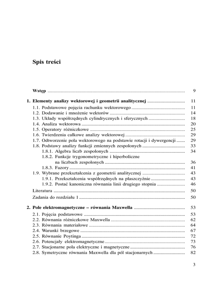 Spis treci Wstêp ................................................................................................................. 9 1. Elementy analizy wektorowej i geometrii analitycznej ............................... 11 1.1. 1.2. 1.3. 1.4. 1.5. 1.6. 1.7. 1.8. Podstawowe pojêcia rachunku wektorowego ............................................ Dodawanie i mno¿enie wektorów .............................................................. Uk³ady wspó³rzêdnych cylindrycznych i sferycznych .............................. Analiza wektorowa ..................................................................................... Operatory ró¿niczkowe .............................................................................. Twierdzenia ca³kowe analizy wektorowej ................................................. Odtworzenie pola wektorowego na podstawie rotacji i dywergencji ....... Podstawy analizy funkcji zmiennych zespolonych ................................... 1.8.1. Algebra liczb zespolonych .............................................................. 1.8.2. Funkcje trygonometryczne i hiperboliczne na liczbach zespolonych .................................................................. 1.8.3. Fazory ............................................................................................... 1.9. Wybrane przekszta³cenia z geometrii analitycznej ................................... 1.9.1. Przekszta³cenia wspó³rzêdnych na p³aszczynie ............................ 1.9.2. Postaæ kanoniczna równania linii drugiego stopnia ....................... 11 14 18 20 25 29 29 33 34 Literatura ............................................................................................................ 50 Zadania do rozdzia³u 1 ....................................................................................... 50 2. Pole elektromagnetyczne – równania Maxwella .......................................... 53 2.1. 2.2. 2.3. 2.4. 2.5. 2.6. 2.7. 2.8. Pojêcia podstawowe ................................................................................... Równania ró¿niczkowe Maxwella ............................................................. Równania materia³owe ............................................................................... Warunki brzegowe ...................................................................................... Równanie Poytinga ..................................................................................... Potencja³y elektromagnetyczne .................................................................. Stacjonarne pola elektryczne i magnetyczne ............................................. Symetryczne równania Maxwella dla pól stacjonarnych .......................... 36 41 43 43 46 53 62 64 67 72 73 76 82 3 4 2.9. Pola stacjonarne dipoli .............................................................................. 2.9.1. Dipol elektryczny ........................................................................... 2.9.2. Potencja³ polaryzacji dielektrycznej .............................................. 2.9.3. Dipol magnetyczny ......................................................................... 2.10. Magnetyczny potencja³ wektorowy magnetyzacji ................................... 2.11. Skalarny potencja³ ekwiwalentnych monopoli magnetycznych ............. 2.12. Równania Maxwella w dziedzinie pulsacji ............................................. 2.13. Postaæ fazorowa równañ Maxwella .......................................................... 2.14. Dualnoæ równañ Maxwella ..................................................................... Literatura ............................................................................................................ Zadania do rozdzia³u 2 ....................................................................................... 83 83 84 85 88 89 91 92 93 96 97 3. rod³a pola elektromagnetycznego ................................................................ 3.1. Wytwarzanie fal elektromagnetycznych przez elementarne ród³a .......... 3.1.1. Promieniowanie dipola Hertza ........................................................ 3.1.2. Pole elektromagnetyczne ma³ego dipola magnetycznego (pêtli pr¹dowej) ................................................................................ 3.2. Dualnoæ pól w strefie dalekiej dipola elektrycznego i magnetycznego ...................................................... 3.3. Podstawowe konstrukcje róde³ promieniowania i ich pola w strefie dalekiej ........................................................................ 3.3.1. Pole ma³ego dipola z liniowym rozk³adem pr¹du .......................... 3.3.2. Pole krótkiego dipola z sinusoidalnym rozk³adem pr¹du .............. 3.4. Charakterystyka kierunkowa promieniowania .......................................... 3.5. Szyki liniowe dipoli .................................................................................... 3.6. Polaryzacja pola elektrycznego .................................................................. Literatura ............................................................................................................ Zadania do rozdzia³u 3 ....................................................................................... 99 99 99 115 117 117 119 122 127 130 130 4. Anteny .......................................................................................................... 4.1. Ogólne w³aciwoci anten ........................................................................ 4.2. Charakterystyki przestrzenne anten ......................................................... 4.3. Schematy zastêpcze anteny ...................................................................... 4.4. Wzmocnienie a kierunkowoæ anteny ..................................................... 4.5. Zasada wzajemnoci w technice antenowej ............................................ 4.6