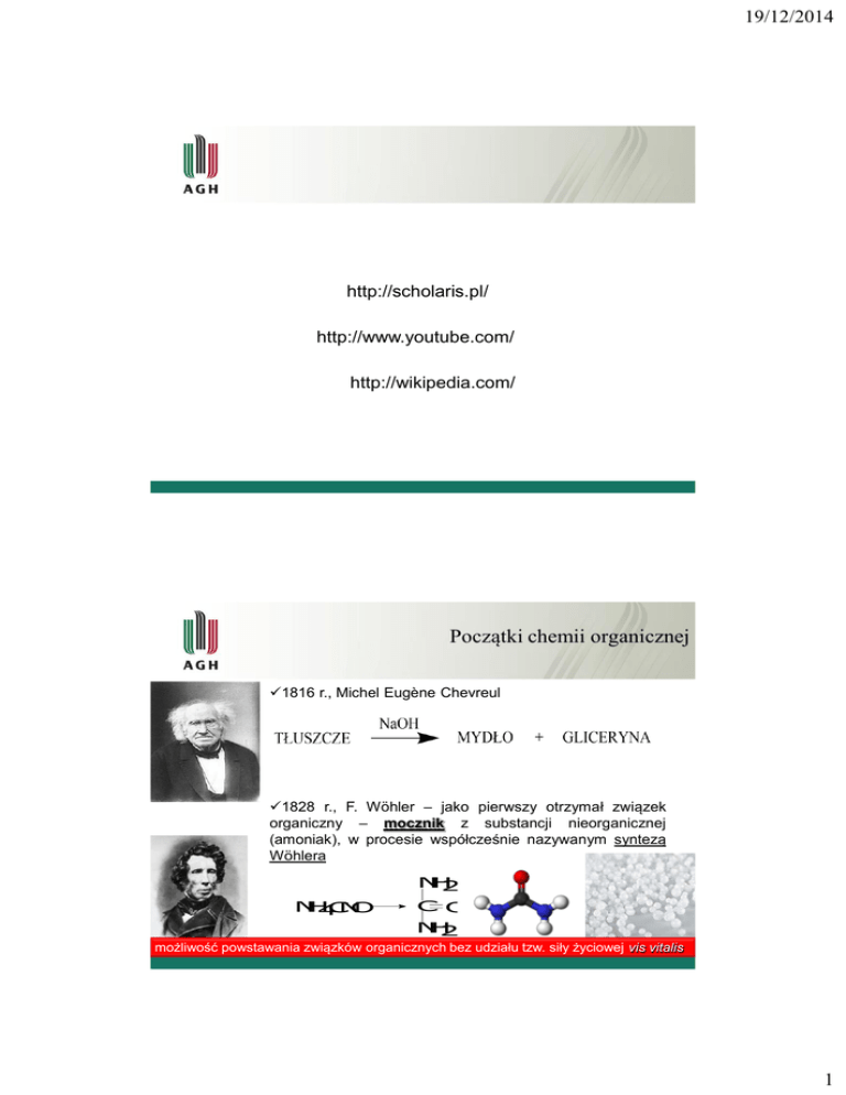 19/12/2014 http://scholaris.pl/ http://www.youtube.com/ http://wikipedia.com/ Początki chemii organicznej 1816 r., Michel Eugène Chevreul 1828 r., F. Wöhler – jako pierwszy otrzymał związek organiczny – mocznik z substancji nieorganicznej (amoniak), w procesie współcześnie nazywanym syntezą Wöhlera N H C N O 4 N H 2 CO N H 2 możliwość powstawania związków organicznych bez udziału tzw. siły życiowej vis vitalis 1 19/12/2014 Początki chemii organicznej 1856 - William Henry Perkin – barwnik organiczny, purpura Perkina (muweina) 1874 - Othmer Zeidler – owadobójczy środek DDT (dichlorodifenylotrichloroetan) Chemia organiczna chemia organiczna = chemia związków węgla dziedzina chemii zajmująca się badaniem budowy, właściwości fizycznych i chemicznych, struktury i reakcji związków chemicznych zawierających węgiel, a także opracowywaniem różnorodnych metod syntezy tych połączeń 10 000 000 znanych związków organicznych związki organiczne – wszystkie związki chemiczne, w skład których wchodzi C (za wyjątkiem: tlenków węgla, kwasu węglowego, węglanów, wodorowęglanów, węglików, cyjanowodoru, cyjanków, kwasu cyjanowego, piorunowego i izocyjanowego, a także ich soli) 2 19/12/2014 związki organiczne zawierać mogą atomy innych pierwiastków, takich jak: wodór, tlen, azot, fosfor, krzem oraz siarka Węgiel niemetal ciało stałe organizmy żywe czysty pierwiastek: diament, grafit, fulereny i grafen 3 19/12/2014 Wiązania chemiczne stan podstawowy 2s C: 2p stan wzbudzony 2s * C: 2p węgiel we wszystkich związkach organicznych jest czterowartościowy hybrydyzacja Hybrydyzacja z sp3 sp3 sp3 y x sp3 płaszczyzna xy 4 19/12/2014 wiązanie pojedyncze metan, CH4 wiązanie podwójne eten, CH2=CH2 wiązanie utworzone przez sp2 –s nakładanie wiązanie wiązanie wiązanie wiązanie utworzone przez sp2 –sp2 nakładanie wiązanie wiązanie potrójne etyn, CHCH wiązanie utworzone przez sp –s nakładanie wiązanie utworzone przez sp –sp nakładanie 5 19/12/2014 Wiązania chemiczne O O 140 kJ/mol Si Si 226 kJ/mol C C 348 kJ/mol wysoka stabilność N N 160 kJ/mol wiązanie długość (pm) energia (kJ/mol) H–H H–O H–F H–Cl C–H C–C C=C C≡C C–N C–O C–F C–Cl N–H N–N N≡N O–O O=O F–F Cl–Cl Br–H Br–Br 74 96 92 127 109 154 134 120 147 143 134 177 101 141 110 145 121 142 199 141 228 436 366 568 432 413 348 614 839 308 360 488 330 391 160 945 140 498 158 243 366 193 Wiązania chemiczne łańcuch prosty łańcuch rozgałęziony węgiel może tworzyć łańcuchy otwarte i zamknięte wiązania pojedyncze wiązania wielokrotne 6 19/12/2014 Wiązania chemiczne sposoby przedstawiania wzorów przestrzennych Wiązania chemiczne sposoby przedstawiania wzorów przestrzennych 7 19/12/2014 Wiązania chemiczne wiązanie chemiczne zdelokalizowane Pozostałe symbole strzałka wskazująca kierunek przemiany stosowana w zapisie większości schematów reakcji chemicznych 8 19/12/2014 Pozostałe symbole strzałka wskazująca na wyraźnie odwracalny charakter reakcji strzałka stanu równowagi dynamicznej tautomeria keto-enolowa Pozostałe symbole 9 19/12/2014 Pozostałe symbole strzałka „mezomeryczna” stosowana przy rysowaniu struktur granicznych Pozostałe symbole strzałki oznaczające przesunięcie/przeniesienie elektronu 10 19/12/2014 Pozostałe symbole strzałki oznaczająca pozorne przesunięcie par elektronowych Pozostałe symbole ładunki formalne, rodniki, pary elektronowe niesparowany elektron, używany do oznaczania rodników para elektronowa (wolna para elektronowa) dodatni ładunek formalny atomu, ładunek jonu ujemny ładunek formalny atomu, ładunek jonu 11 19/12/2014 Zasady zapisu wzorów chemicznych Lewisa 1. dla każdego indywiduum chemicznego posiadającego elektrony zlokalizowane można napisać wzór elektronowy zwany strukturą Lewisa obrazujący położenie tych elektronów (przedstawia się jedynie elektrony walencyjne) 2. całkowita liczba elektronów walencyjnych w cząsteczce i rodniku, musi być równa sumie wszystkich elektronów, znajdujących się na powłokach zewnętrznych, dostarczonych cząsteczce przez poszczególne atomy Zasady zapisu wzorów chemicznych Lewisa 3. w przypadku anionów liczbę elektronów powiększa się odpowiednio o ładunek jonu, natomiast w przypadku kationów liczbę elektronów odpowiednio zmniejsza się 12 19/12/2014 Zasady zapisu wzorów chemicznych Lewisa 4. należy ustalić, które z elektronów znajdują się w wiązaniach kowalencyjnych, a które pozostają elektronami niewiążącymi 5. elektrony niewiążące stanowią część powłoki walencyjnej tylko jednego atomu, natomiast elektrony w wiązaniach kowalencyjnych stanowią część powłok walencyjnych obydwu atomów tworzących wiązanie Zasady zapisu wzorów chemicznych Lewisa B C N O F 6. atomy drugiego okresu mogą mieć najwyżej osiem elektronów walencyjnych H 7. wodór, należący do pierwszego okresu, może mieć co najwyżej dwa elektrony walencyjne 13 19/12/2014 Zasady zapisu wzorów chemicznych Lewisa 8. jeżeli istnieje wybór między strukturami z sześcioma lub siedmioma elektronami w sferze walencyjnej pierwiastka z drugiego okresu, a strukturą z oktetem elektronowym, to ta druga, na ogół, odpowiada strukturze rzeczywistej wyjątek! tlen w stanie trypletowym tlen w stanie singletowym Rodzaje wiązań chemicznych H elektroujemność – zdolność atomów pierwiastka do przyciągania elektronów (* w skali Paulinga) 2,2 Li B C N O F 1,0 2,0 2,5 3,0 3,5 4,0 Na 0,9 wiązanie kowalencyjne – różnica elektroujemności atomów 0 – 0,4* parametry wiązania kowalencyjnego: długość, energia, polarność wiązanie kowalencyjne spolaryzowane – różnica elektroujemności atomów 0,4 -1,7 cząsteczka jest dipolem elektrycznym; cząsteczka jest polarna; miarą polarności cząsteczki jest jej moment dipolowy moment dipolowy = ładunek odległość miedzy środkami ładunków dodatniego i uj