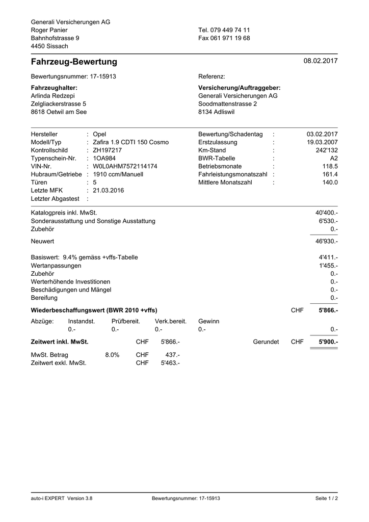 Generali Versicherungen AG Roger Panier Bahnhofstrasse 9 4450 Sissach Tel. 079 449 74 11 Fax 061 971 19 68 08.02.2017 Fahrzeug-Bewertung Bewertungsnummer: 17-15913 Referenz: Fahrzeughalter: Arlinda Redzepi Zelgliackerstrasse 5 8618 Oetwil am See Versicherung/Auftraggeber: Generali Versicherungen AG Soodmattenstrasse 2 8134 Adliswil Hersteller Modell/Typ Kontrollschild Typenschein-Nr. VIN-Nr. Hubraum/Getriebe Türen Letzte MFK Letzter Abgastest : : : : : : : : : Opel Zafira 1.9 CDTI 150 Cosmo ZH197217 1OA984 W0L0AHM7572114174 1910 ccm/Manuell 5 21.03.2016 Bewertung/Schadentag Erstzulassung Km-Stand BWR-Tabelle Betriebsmonate Fahrleistungsmonatszahl Mittlere Monatszahl : : : : : : : 03.02.2017 19.03.2007 242'132 A2 118.5 161.4 140.0 Katalogpreis inkl. MwSt. Sonderausstattung und Sonstige Ausstattung Zubehör 40'400.6'530.0.- Neuwert 46'930.- Basiswert: 9.4% gemäss +vffs-Tabelle Wertanpassungen Zubehör Werterhöhende Investitionen Beschädigungen und Mängel Bereifung 4'411.1'455.0.0.0.0.- Wiederbeschaffungswert (BWR 2010 +vffs) Abzüge: Instandst. 0.- Prüfbereit. 0.- Zeitwert inkl. MwSt. MwSt. Betrag Zeitwert exkl. MwSt. auto-i EXPERT Version 3.8 8.0% CHF Verk.bereit. 0.- CHF 5'866.- CHF CHF 437.5'463.- Gewinn 0.- Bewertungsnummer: 17-15913 5'866.0.- Gerundet CHF 5'900.- Seite 1 / 2 Generali Versicherungen AG Roger Panier Bahnhofstrasse 9 4450 Sissach Tel. 079 449 74 11 Fax 061 971 19 68 08.02.2017 Details zur Fahrzeug-Bewertung Serienausstattung Pack Sitz-Komfort 1, Pack Sicht, Pack Licht, Pack Raucher, Elektronische Wegfahrsperre, Zentralverriegelung mit Fernbedienung, Elektrische Fensterheber vorne, Elektrische Fensterheber hinten, Aussenspiegel elekt. verstellbar/ heizbar manuell anklappbar, Elektronischer Geschwindigkeitsregler, Nebelscheinwerfer vorne, Tagesfahrtlichtschaltung, Seitenschutzleisten in Wagenfarbe, Dachreling silber, Leichtmetallfelgen 16" 10-Speichen QL5, Reserverad vollwertig, ABS Antiblockiersystem, Bremsassistent EBA, Servolenkung elektrohydraulisch, Dieselpartikelfilter, ESP Elektr. Stabilitätsprogramm/ TcPlus/ CBC, Klimaanlage halbautomatisch, Quickheat Heizsystem, Airbag Fahrer und Beifahrerseite, Seitenairbag Fahrer und Beifahrerseite, Kopfairbag vorne und hinten, Auskuppelnde Sicherheits-Pedalen PRS, Lederlenkrad, Lenkrad verstellbar, FlexSpace Sitzsystem, Höhenverstellbarer Fahrersitz, Kindersitz-Vorbereitung Isofix, Armlehne Fahrerseite, Staub- und Pollenfilter, 12 V Steckdose im Laderaum, Aktive Kopfstützen vorne, Schublade unter Beifahrersitz, Gepäckraumabdeckung, Radio/ CD CD30, Radiobedienung am Lenkrad, Sprachcode Deutsch/ Radio, Keine Gewähr auf die Angaben der Serienausstattungen Sonderaustattung und Sonstige Ausstattung Neupreis Pack Sitz-Komfort 2 Pack Winter Open & Start/ Schlüsselloses System Dunkel getönte Scheiben ab 2. Reihe Anhängevorrichtung mit abnehmbarem Kugelkopf Klimaautomat und hitzereflektierende Frontscheibe Bordcomputer mit Check Control-System Radio/ DVD Spieler/ Navigation DVD90 Mobiltelefon-Vorbereitung+Freisprecheinrichtung/ Bluetooth Wertanpassungen Allgemeiner Zustand auto-i EXPERT Version 3.8 Bewertungsnummer: 17-15913 180.540.580.300.750.560.500.2'500.620.Total 6'530.- Prozent Betrag 3.1 1'455.- Total 1'455.- Seite 2 / 2