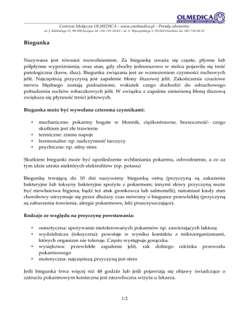 Centrum Medyczne OLMEDICA – www.cmolmedica.pl – Porady zdrowotne ul. J. Kilińskiego 11, 99-100 Łęczyca, tel. (24) 721-24-63 | ul. S. Wyszyńskiego 2, 95-035 Ozorków, tel. (42) 718-26-25 Biegunka Nazywana jest również rozwolnieniem. Za biegunkę uważa się częste, płynne lub półpłynne wypróżnienia, oraz stan, gdy choćby jednorazowo w stolcu pojawiła się treść patologiczna (krew, śluz). Biegunka związana jest ze wzmożeniem czynności ruchowych jelit. Najczęstszą przyczyną jest zapalenie błony śluzowej jelit. Zakończenia czuciowe nerwu błędnego zostają podrażnione, wskutek czego dochodzi do odruchowego pobudzenia ruchów robaczkowych jelit. W związku z zapalnie zmienioną błoną śluzową zwiększa się płynność treści jelitowych. Biegunka może być wywołana czterema czynnikami: • • • • mechaniczne: pokarmy bogate w błonnik, ciężkostrawne, bezsoczność- czego skutkiem jest złe trawienie termiczne: zimne napoje hormonalne: np. nadczynność tarczycy psychiczne: np. silny stres Skutkiem biegunki może być upośledzenie wchłaniania pokarmu, odwodnienie, a co za tym idzie utrata niektórych elektrolitów (np. potasu) Biegunkę trwającą do 10 dni nazywamy biegunką ostrą (przyczyną są zakażenia bakteryjne lub toksyny bakteryjne spożyte z pokarmem; innymi słowy przyczyną może być niewłaściwa higiena, bądź też atak gronkowca lub salmonelli), natomiast kiedy stan chorobowy utrzymuje się przez dłuższy czas mówimy o biegunce przewlekłej (przyczyną są zaburzenia trawienia, alergie pokarmowe, leki przeczyszczające). Rodzaje ze względu na przyczynę powstawania: • • • • osmotyczna: spożywanie nietolerowanych pokarmów np. zawierających laktozę wydzielnicza (toksyczna): powstaje w wyniku kontaktu z mikroorganizmami, których organizm nie toleruje. Często występuje gorączka. wysiękowa: przewlekłe zapalenie jelit, rak dolnego odcinka przewodu pokarmowego motoryczna: najczęstszą przyczyną jest stres Jeśli biegunka trwa więcej niż 48 godzin lub jeśli pojawiają się objawy świadczące o zatruciu pokarmowym konieczna jest niezwłoczna wizyta u lekarza. 1/2 Centrum Medyczne OLMEDICA – www.cmolmedica.pl – Porady zdrowotne ul. J. Kilińskiego 11, 99-100 Łęczyca, tel. (24) 721-24-63 | ul. S. Wyszyńskiego 2, 95-035 Ozorków, tel. (42) 718-26-25 Leczenie: W przypadku biegunki o niewielkim stopniu odwodnienia stosuje się nawadnianie doustne (podawanie wody i elektrolitów). Jeżeli doszło do ciężkiego odwodnienia, występują objawy wstrząsu, zaburzenia świadomości lub wymioty konieczne jest nawadnianie dożylne. 2/2