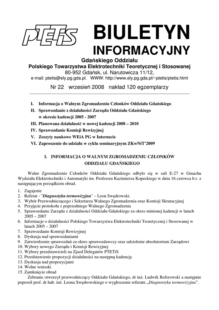 BIULETYN INFORMACYJNY Gdańskiego Oddziału Polskiego Towarzystwa Elektrotechniki Teoretycznej i Stosowanej 80-952 Gdańsk, ul. Narutowicza 11/12, e-mail: [email protected]. WWW: http://www.ely.pg.gda.pl/~ptetis/ptetis.html Nr 22 wrzesień 2008 nakład 120 egzemplarzy _______________________________________________________________________________________ I. Informacja o Walnym Zgromadzeniu Członków Oddziału Gdańskiego II. Sprawozdanie z działalności Zarządu Oddziału Gdańskiego w okresie kadencji 2005 - 2007 III. Planowana działalność w nowej kadencji 2008 – 2010 IV. Sprawozdanie Komisji Rewizyjnej V. Zeszyty naukowe WEiA PG w Internecie VI. Zaproszenie do udziału w cyklu seminaryjnym ZKwNiT’2009 I. INFORMACJA O WALNYM ZGROMADZENIU CZŁONKÓW ODDZIAŁU GDAŃSKIEGO Walne Zgromadzenie Członków Oddziału Gdańskiego odbyło się w sali E-27 w Gmachu Wydziału Elektrotechniki i Automatyki im. Profesora Kazimierza Kopeckiego w dniu 16 czerwca b.r. z następującym porządkiem obrad. 1. 2. 3. 4. 5. Zagajenie Referat - "Diagnostyka termowizyjna" – Leon Swędrowski. Wybór Przewodniczącego i Sekretarza Walnego Zgromadzenia oraz Komisji Skrutacyjnej Przyjęcie protokołu z poprzedniego Walnego Zgromadzenia Sprawozdanie Zarządu z działalności Oddziału Gdańskiego za okres minionej kadencji w latach 2005 – 2007 6. Informacje o działalności Polskiego Towarzystwa Elektrotechniki Teoretycznej i Stosowanej w latach 2005 – 2007 7. Sprawozdanie Komisji Rewizyjnej 8. Dyskusja nad sprawozdaniami 9. Zatwierdzenie sprawozdań za okres sprawozdawczy oraz udzielenie absolutorium Zarządowi 10. Wybory nowego Zarządu i Komisji Rewizyjnej 11. Wybory przedstawicieli na Zjazd Delegatów PTETiS 12. Przedstawienie propozycji działalności na następną kadencję 13. Dyskusja nad propozycjami 14. Wolne wnioski 15. Zamknięcie obrad Zebranie otworzył przewodniczący Oddziału Gdańskiego, dr inż. Ludwik Referowski a następnie poprosił prof. dr hab. inż. Leona Swędrowskiego o wygłoszenie referatu „Diagnostyka termowizyjna”. - 2 - W dalszej części zebrania na przewodniczącego wybrano prof. dra hab. inż. Andrzeja Grono, który prowadził dalszą część obrad. Sekretarzem wybrany został dr hab. inż. Dariusz Świsulski, a do. Komisji Skrutacyjnej wybrano: prof. dra hab. inż. Alicję Konczakowską i dra inż. Jacka Cichosza. Przewodniczący Zgromadzenia przedstawił planowany porządek obrad, który został zatwierdzony jednogłośnie: Sprawozdanie Zarządu z działalności Oddziału Gdańskiego za okres minionej kadencji w latach 2005 – 2007 przedstawił Przewodniczący Oddziału, dr inż. Ludwik Referowski. W trakcie sprawozdania uczestnicy uczcili chwilą ciszy zmarłego 22 kwietnia 2007 roku prof. dr hab. inż. Wojciecha Winiarskiego, wieloletniego działacza PTETiS Następnie dr inż. Ludwik Referowski przedstawił informacje o działalności Zarządu Głównego i pozostałych Oddziałów Polskiego Towarzystwa Elektrotechniki Teoretycznej i Stosowanej w latach 2005 – 2007. (działalność). Sprawozdanie Komisji Rewizyjnej przedstawił Przewodniczący Komisji, Prof. dr hab. inż. Ludwik Spiralski. Po zatwierdzeniu sprawozdania i udzieleniu absolutorium ustępującemu Zarządowi przystąpiono do wyboru nowego Zarządu, który został wybrany w następującym składzie: Zarząd Oddziału Gdańskiego na kadencje 2008 - 2010 1. Dr inż. Ludwik Referowski – przewodniczący 2. Prof. dr hab. inż. Bogdan Kosmowski – wiceprzewodniczący 3. Prof. dr hab. inż. Kazimierz Jakubiuk – sekretarz 4. Dr inż. Lech Hasse – skarbnik 5. Dr hab. inż. Janusz Smulko – członek 6. Dr hab. inż. Dariusz Świsulski – członek 7. Dr inż. Stanisław Witkowski - członek Komisję Rewizyjną Oddziału wybrano w składzie: 1. 2. 3. 4. Komisja Rewizyjna Oddziału Gdańskiego na kadencję 2008 - 2010 Prof. dr hab. inż. Andrzej Grono - przewodniczący Prof. dr hab. inż. Antoni Nowakowski - członek Dr inż. Mirosław Mizan - członek Prof. dr hab. inż. Ludwik Spiralski- - członek Następnie dokonano wyboru przedstawicieli na Zjazd Delegatów PTETiS, który odbędzie się w Warszawie w dniu 27 października br. 1. 2. 3. 4. 5. Przedstawiciele Oddziału Gdańskiego na Zjazd Delegatów PTETiS Prof. dr hab. inż.. Andrzej Grono Dr inż. Lech Hasse Dr inż. Ludwik Referowski Dr hab. inż. Janusz Smulko Dr hab. inż. Dariusz Świsulski Z kolei przewodniczący Ludwik Referowski przedstawił propozycje działalności Oddziału na kadencję 2008 – 2010. W trakcie dyskusji podkreślono potrzebę publikacji życiorysów dawnych działaczy elektryki, tym bardziej, że jest już coraz mniej osób pamiętających naszych kolegów pracujących kilkadziesiąt lat temu. Ponieważ nie zgłoszono wolnych wniosków, po wyczerpaniu dyskusji Przewodniczący zgromadzenia, prof. Andrzej Grono zamknął obrady. _________________________________________________________________ Biuletyn Informacyjny Oddziału Gdańskiego PTETiS, Nr 22 - 3 - II SPRAWOZDANIE Z DZIAŁALNOŚCI ZARZĄDU ODDZIAŁU GDAŃSKIEGO W OKRESIE KADENCJI 2005 - 2007 1.Informacje podstawowe Skład Zarządu Oddziału Gdańskiego Ludwik Referowski – przewodniczący Bogdan Kosmowski – z-ca przewodniczącego Kazimierz Jakubiuk - sekretarz Lech Hasse - skarbnik Marek Olesz – członek zarządu Dariusz Świsulski - członek zarządu Stanisław Witkowski – członek zarządu Skład Komisji Rewizyjnej Ludwik Spiralski – przewodniczący Mirosław Mizan - członek komisji Janusz Smulko – członek komisji Paweł Zimny – członek komisji Stan liczbowy członków Rok 2005 2006 2007 Liczba członków 83 79 75 Odeszli od nas Prof. dr hab. inż. Wojciech Winiarski – Politechnika Gdańska Wydział Elektrotechniki i Automatyki - zmarł 22.04.2007 Zebrania Zarządu Rok 2005 2006 2007 Organizacyjne 4 4 4 Naukowe 20 16 17 Seminaria Konferencje Cykl seminaryjny Zastosowanie Komputerów w Nauce i Technice - organizowany corocznie. Odczyty odbywaj