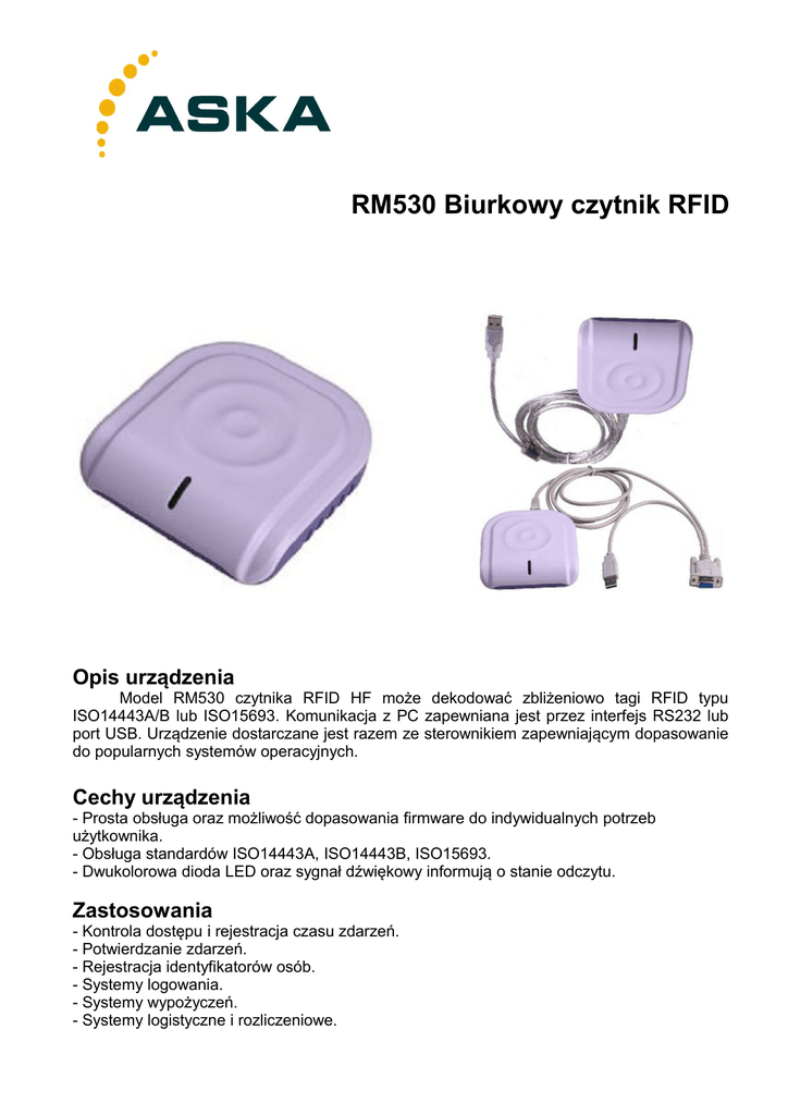 RM530 Biurkowy czytnik RFID Opis urządzenia Model RM530 czytnika RFID HF może dekodować zbliżeniowo tagi RFID typu ISO14443A/B lub ISO15693. Komunikacja z PC zapewniana jest przez interfejs RS232 lub port USB. Urządzenie dostarczane jest razem ze sterownikiem zapewniającym dopasowanie do popularnych systemów operacyjnych. Cechy urządzenia - Prosta obsługa oraz możliwość dopasowania firmware do indywidualnych potrzeb użytkownika. - Obsługa standardów ISO14443A, ISO14443B, ISO15693. - Dwukolorowa dioda LED oraz sygnał dźwiękowy informują o stanie odczytu. Zastosowania - Kontrola dostępu i rejestracja czasu zdarzeń. - Potwierdzanie zdarzeń. - Rejestracja identyfikatorów osób. - Systemy logowania. - Systemy wypożyczeń. - Systemy logistyczne i rozliczeniowe. Dane techniczne RM530 Nazwa parametru Opis Standardy odczytu ISO/IEC14443A,ISO/IEC14443B,ISO/IEC15693 Obsługiwane chipy MIFARE® Classic 1k / MIFARE® Classic 4k / MIFARE Ultralight® / MIFARE® DESFire®; AT88RF020; 66CL160S; SR176; SRIX4K(TYPE-B); I-Code2; TI RFID Tag-IT HF-I, EM4135, EM4034, itp. Częstotliwość pracy 13,56 MHz Zasięg odczytu 50÷100mm Interfejsy RS232, USB Szybkość transmisji danych 9600÷115200 bit/s Zasilanie DC 5V z portu USB Temperatura pracy -10 do +70°C Temperatura przechowywania -20 do +80°C Obudowa Plastik o wysokiej odporności Wymiary 100 x 100 x 27mm Waga 150g Modele Opis RM530-S-A RS232 interfejs, ISO14443A RM530-S-C RS232 interfejs, ISO15693 RM530-S-E RS232 interfejs, ISO14443A+B+ISO15693 RM530-H-A USB interfejs Plug&Play, ISO14443A RM530-H-C USB interfejs Plug&Play, ISO15693 RM530-H-E USB interfejs Plug&Play, ISO14443A+B+ISO15693 RM530-U-A USB interfejs, ISO14443A RM530-U-C USB interfejs, ISO15693 RM530-U-E USB interfejs, ISO14443A+B+ISO15693 ASKA ul. Wędkarska 2A/B1, 04-869 Warszawa tel. 22 4985908/9, fax 22 6177020 e-mail: [email protected] www.kodykreskowe.com