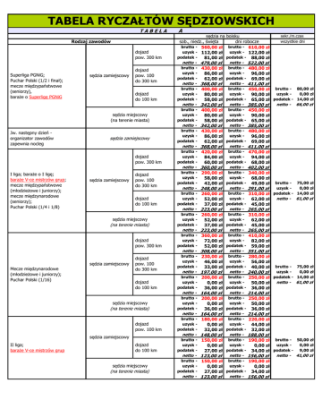 TABELA RYCZAŁTÓW SĘDZIOWSKICH TABELA Rodzaj zawodów dojazd pow. 300 km Superliga PGNiG; Puchar Polski (1/2 i finał); mecze międzypaństwowe (seniorzy), baraże o Superligę PGNiG sędzia zamiejscowy dojazd pow. 100 do 300 km dojazd do 100 km sędzia miejscowy (na terenie miasta) Jw. następny dzień organizator zawodów zapewnia nocleg sędzia zamiejscowy dojazd pow. 300 km I liga; baraże o I ligę; baraże V-ce mistrzów grup; mecze międzypaństwowe (młodzieżowe i juniorzy); mecze międzynarodowe (seniorzy); Puchar Polski (1/4 i 1/8) sędzia zamiejscowy dojazd pow. 100 do 300 km dojazd do 100 km sędzia miejscowy (na terenie miasta) dojazd pow. 300 km Mecze międzynarodowe (młodzieżowe i juniorzy); Puchar Polski (1/16) sędzia zamiejscowy dojazd pow. 100 do 300 km dojazd do 100 km sędzia miejscowy (na terenie miasta) dojazd pow. 100 km sędzia zamiejscowy II liga; baraże V-ce mistrzów grup dojazd do 100 km sędzia miejscowy (na terenie miasta) A sędzia na boisku sob., niedz., święta dni robocze brutto - 560,00 zł brutto - 610,00 zł uzysk - 112,00 zł uzysk - 122,00 zł podatek 81,00 zł podatek - 88,00 zł netto - 479,00 zł netto - 522,00 zł brutto - 430,00 zł brutto - 480,00 zł uzysk 86,00 zł uzysk 96,00 zł podatek 62,00 zł podatek - 69,00 zł netto - 368,00 zł netto - 411,00 zł brutto - 400,00 zł brutto - 450,00 zł uzysk 80,00 zł uzysk 90,00 zł podatek 58,00 zł podatek - 65,00 zł netto - 342,00 zł netto - 385,00 zł brutto - 400,00 zł brutto - 450,00 zł uzysk 80,00 zł uzysk 90,00 zł podatek 58,00 zł podatek - 65,00 zł netto - 342,00 zł netto - 385,00 zł brutto - 430,00 zł brutto - 480,00 zł uzysk 86,00 zł uzysk 96,00 zł podatek 62,00 zł podatek - 69,00 zł netto - 368,00 zł netto - 411,00 zł brutto - 420,00 zł brutto - 470,00 zł uzysk 84,00 zł uzysk 94,00 zł podatek 60,00 zł podatek - 68,00 zł netto - 360,00 zł netto - 402,00 zł brutto - 290,00 zł brutto - 340,00 zł uzysk 58,00 zł uzysk 68,00 zł podatek 42,00 zł podatek - 49,00 zł netto - 248,00 zł netto - 291,00 zł brutto - 260,00 zł brutto - 310,00 zł uzysk 52,00 zł uzysk 62,00 zł podatek 37,00 zł podatek - 45,00 zł netto - 223,00 zł netto - 265,00 zł brutto - 260,00 zł brutto - 310,00 zł uzysk 52,00 zł uzysk 62,00 zł podatek 37,00 zł podatek - 45,00 zł netto - 223,00 zł netto - 265,00 zł brutto - 360,00 zł brutto - 410,00 zł uzysk 72,00 zł uzysk 82,00 zł podatek 52,00 zł podatek - 59,00 zł netto - 308,00 zł netto - 351,00 zł brutto - 230,00 zł brutto - 280,00 zł uzysk 46,00 zł uzysk 56,00 zł podatek 33,00 zł podatek - 40,00 zł netto - 197,00 zł netto - 240,00 zł brutto - 200,00 zł brutto - 250,00 zł uzysk 0,00 zł uzysk 50,00 zł podatek 36,00 zł podatek - 36,00 zł netto - 164,00 zł netto - 214,00 zł brutto - 200,00 zł brutto - 250,00 zł uzysk 0,00 zł uzysk 50,00 zł podatek 36,00 zł podatek - 36,00 zł netto - 164,00 zł netto - 214,00 zł brutto - 180,00 zł brutto - 220,00 zł uzysk 0,00 zł uzysk 44,00 zł podatek 32,00 zł podatek - 32,00 zł netto - 148,00 zł netto - 188,00 zł brutto - 150,00 zł brutto - 190,00 zł uzysk 0,00 zł uzysk 0,00 zł podatek 27,00 zł podatek - 34,00 zł netto - 123,00 zł netto - 156,00 zł brutto - 150,00 zł brutto - 190,00 zł uzysk 0,00 zł uzysk 0,00 zł podatek 27,00 zł podatek - 34,00 zł netto - 123,00 zł netto - 156,00 zł sekr./m.czas wszystkie dni brutto - 80,00 zł uzysk 0,00 zł podatek - 14,00 zł netto - 66,00 zł brutto - 75,00 zł uzysk 0,00 zł podatek - 14,00 zł netto - 61,00 zł brutto - 75,00 zł uzysk 0,00 zł podatek - 14,00 zł netto - 61,00 zł brutto - 50,00 zł uzysk 0,00 zł podatek 9,00 zł netto - 41,00 zł TABELA RYCZAŁTÓW SĘDZIOWSKICH sędzia zamiejscowy Liga międzywojewódzka; Puchar WZPR; brutto - 130,00 zł brutto - 150,00 zł uzysk 0,00 zł uzysk 0,00 zł podatek 23,00 zł podatek - 27,00 zł brutto - 40,00 zł uzysk 0,00 zł brutto - 100,00 zł brutto - 120,00 zł podatek 7,00 zł uzysk 0,00 zł uzysk 0,00 zł netto - 33,00 zł podatek 18,00 zł podatek - 22,00 zł netto - 107,00 zł sędzia miejscowy (na terenie miasta ) netto - TABELA Funkcja dojazd pow. 300 km delegat zamiejscowy Delegat ZPRP dojazd pow. 100 do 300 km dojazd do 100 km delegat miejscowy Jw. następny dzień organizator zapewnia nocleg (delegat zamiejscowy) Sędzia główny turnieje międzynarodowe i seniorskie (do 2 meczów dziennie) ryczałt za 1 dzień zawodów - w przypadku zawodów kilkudniowych organizator ma obowiązek zapewnienia noclegu i wyżywienia (dot. sędziów zamiejscowych) delegat zamiejscowy - (dotyczy zawodów wielodniowych, mnożna w zależności od ilości dni zawodów ) dojazd pow. 300 km sędzia zamiejscowy dojazd pow. 100 do 300 km dojazd do 100 km sędzia miejscowy - (dotyczy zawodów jednodniowych) Jw. następny dzień organizator zapewnia nocleg (delegat zamiejscowy) Sędzia główny turnieje międzynarodowe i seniorskie (powyżej 2 meczów dziennie) ryczałt za 1 dzień zawodów - w przypadku zawodów kilkudniowych organizator ma obowiązek zapewnienia noclegu i wyżywienia (dot. sędziów zamiejscowych) sędzia miejscowy i zamiejscowy (dotyczy zawodów wielodniowych, mnożna w zależności od ilości dni zawodów) dojazd pow. 300 km sędzia zamiejscowy dojazd pow. 100 do 300 km dojazd do 100 km sędzia miejscowy Jw. następny dzień organizator zapewnia nocleg (delegat zamiejscowy) sędzia miejscowy i zamiejscowy 82,00 zł netto - 123,00 zł netto - 98,00 zł B sobota, niedziela, święta 360,00 zł 72,00 zł 52,00 zł netto 308,00 zł brutto 230,00 zł uzysk 46,00 zł podatek 33,00 zł netto 197,00 zł brutto 200,00 zł uzysk 0,00 zł podatek 36,00 zł netto 164,00 zł brutto 200,00 zł uzysk 0,00 zł podatek 36,00 zł netto 164,00 zł brutto 230,00 zł uzysk 46,00 zł podatek 33,00 zł netto 197,00 zł brutto 360,00 zł uzysk 72,00 zł podatek 52,00 zł netto 308,00 zł brutto 230,00 zł uzysk 46,00 zł podatek 33,00 zł netto 197,00 zł brutto 2