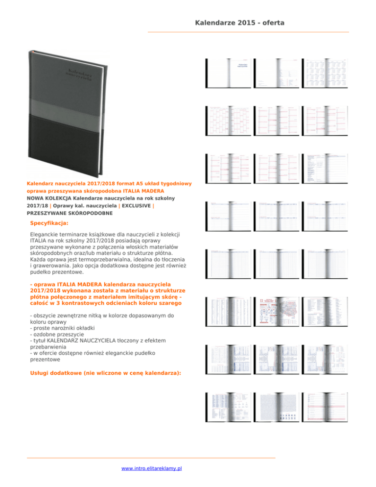 Kalendarze 2015 - oferta Kalendarz nauczyciela 2017/2018 format A5 układ tygodniowy oprawa przeszywana skóropodobna ITALIA MADERA NOWA KOLEKCJA Kalendarze nauczyciela na rok szkolny 2017/18 | Oprawy kal. nauczyciela | EXCLUSIVE | PRZESZYWANE SKÓROPODOBNE Specyfikacja: Eleganckie terminarze książkowe dla nauczycieli z kolekcji ITALIA na rok szkolny 2017/2018 posiadają oprawy przeszywane wykonane z połączenia włoskich materiałów skóropodobnych oraz/lub materiału o strukturze płótna. Każda oprawa jest termoprzebarwialna, idealna do tłoczenia i grawerowania. Jako opcja dodatkowa dostępne jest również pudełko prezentowe. - oprawa ITALIA MADERA kalendarza nauczyciela 2017/2018 wykonana została z materiału o strukturze płótna połączonego z materiałem imitującym skórę całość w 3 kontrastowych odcieniach koloru szarego - obszycie zewnętrzne nitką w kolorze dopasowanym do koloru oprawy - proste narożniki okładki - ozdobne przeszycie - tytuł KALENDARZ NAUCZYCIELA tłoczony z efektem przebarwienia - w ofercie dostępne również eleganckie pudełko prezentowe Usługi dodatkowe (nie wliczone w cenę kalendarza): www.intro.elitareklamy.pl Kalendarze 2015 - oferta Do kalendarzy książkowych dla nauczycieli i pedagogów można zamówić dodatkowo następujące usługi: • Dodatkowe tabele ocen (od 1 egz.) • Tłoczenie tekstu/personalizacji na okładce (od 1 egz.) • Nadruk reklamowy na okładce (od 1 egz.) • Metalowe narożniki okładki (od 1 egz.) • Ozdobne pudełko prezentowe (od 1 egz.) • Wklejka foto lub z dedykacją (od 1 egz.) • Wymienny zeszyt teleadresowy (od 1 egz.) • Barwna gumka zamykająca kalendarz (od 1 egz.) • Przesyłkę prezentu w imieniu zamawiającego na wskazany adres • Tłoczenie logo suche/z folią (z matrycą od 100 zł, tłoczymy również z dostarczonej matrycy) • Logo lub personalizacja 3D na okładce (od 50 egz.) • Indywidualny projekt okładki przeszywanej (od 100 egz.) • Okładka drukowana na papierze lub płótnie (od 100 egz.) Zobacz również podobne kalendarze: kalendarz nauczyciela | rok szkolny 2017/2018 | dla nauczyciela | kalendarz pedagoga | pedagogiczny | tabele ocen www.intro.elitareklamy.pl Kalendarze 2015 - oferta www.intro.elitareklamy.pl Kalendarz nauczyciela 2017/2018 format A5 układ tygodniowy Kalendarz nauczyciela 2017/2018 format A5 układ tygodniowy Kalendarz nauczyciela 2017/2018 format A5 układ tygodniowy Specyfikacja: Kalendarz nauczyciela: Specyfikacja: Kalendarz nauczyciela: Specyfikacja: Kalendarz nauczyciela: Objętość: 160 stron Papier biały 70g Wymiary bloku: Format A5 – kartki o wym. 143 x 204 mm Tasiemka do zaznaczania bieżącej daty (z wyjątkiem opraw PCV - w nich tasiemka nie jest dodawana) Objętość: 160 stron Papier biały 70g Wymiary bloku: Format A5 – kartki o wym. 143 x 204 mm Tasiemka do zaznaczania bieżącej daty (z wyjątkiem opraw PCV - w nich tasiemka nie jest dodawana) Objętość: 160 stron Papier biały 70g Wymiary bloku: Format A5 – kartki o wym. 143 x 204 mm Tasiemka do zaznaczania bieżącej daty (z wyjątkiem opraw PCV - w nich tasiemka nie jest dodawana) Dodatek informacyjny dla nauczyciela zawiera tabele: - organizacja roku szkolnego 2017/2018 - tabela - terminy posiedzeń Rady Pedagogicznej - tabela - ważne terminy - tabela - wycieczki, wyjazdy, imprezy tabela - zebrania z rodzicami - tabela - plan lekcji nauczyciela na I i II semestr - tabela - plan dyżurów nauczyciela na I i II semestr - tabela - informacje o uczniach - tabela - finanse klasowe – 2 tabele - tabela ocen na I i II semestr – 10 tabel dla 10 klas (10 tabel na I semestr i 10 tabel na II semestr) - istnieje możliwość dodania dodatkowych tabel ocen Dodatek informacyjny dla nauczyciela zawiera tabele: - organizacja roku szkolnego 2017/2018 - tabela - terminy posiedzeń Rady Pedagogicznej - tabela - ważne terminy - tabela - wycieczki, wyjazdy, imprezy tabela - zebrania z rodzicami - tabela - plan lekcji nauczyciela na I i II semestr - tabela - plan dyżurów nauczyciela na I i II semestr - tabela - informacje o uczniach - tabela - finanse klasowe – 2 tabele - tabela ocen na I i II semestr – 10 tabel dla 10 klas (10 tabel na I semestr i 10 tabel na II semestr) - istnieje możliwość dodania dodatkowych tabel ocen Dodatek informacyjny dla nauczyciela zawiera tabele: - organizacja roku szkolnego 2017/2018 - tabela - terminy posiedzeń Rady Pedagogicznej - tabela - ważne terminy - tabela - wycieczki, wyjazdy, imprezy tabela - zebrania z rodzicami - tabela - plan lekcji nauczyciela na I i II semestr - tabela - plan dyżurów nauczyciela na I i II semestr - tabela - informacje o uczniach - tabela - finanse klasowe – 2 tabele - tabela ocen na I i II semestr – 10 tabel dla 10 klas (10 tabel na I semestr i 10 tabel na II semestr) - istnieje możliwość dodania dodatkowych tabel ocen Kalendarium dla nauczyciela na rok szkolny 2017/2018 zawiera: - kalendarium w układzie tygodniowym od 22.08.2017 do 25.06.2018 - skrócone kalendarium od 27.06.2017 do 21.08.2018 - skrócone kalendarium od 26.06.2018 do 03.09.2018 - plan roku szkolnego 2017/2018 - na każdej karcie skrócone kalendarium miesiąca poprzedniego, bieżącego i kolejnego - planer od lipca 2017 do października 2018 Kalendarium dla nauczyciela na rok szkolny 2017/2018 zawiera: - kalendarium w układzie tygodniowym od 22.08.2017 do 25.06.2018 - skrócone kalendarium od 27.06.2017 do 21.08.2018 - skrócone kalendarium od 26.06.2018 do 03.09.2018 - plan roku szkolnego 2017/2018 - na każdej karcie skrócone kalendarium miesiąca poprzedniego, bieżącego i kolejnego - planer od lipca 2017 do października 2018 Kalendarium dla nauczyciela na rok szkolny 2017/2018 zawiera: - kalendarium w układzie tygodniowym od 22.08.2017 do 25.06.2018 - skrócone kalendarium od 27.06.2017 do 21.08.2018 - skrócone kalendarium od 26.06.2018 do 03.09.2018 - plan roku szkolnego 2017/2018 - na każdej karcie skrócone kalendarium miesi