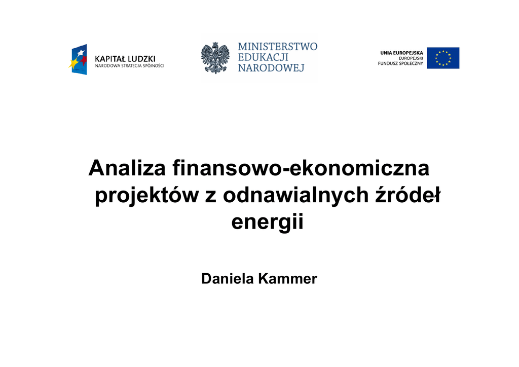 Analiza finansowo-ekonomiczna projektów z odnawialnych źródeł energii Daniela Kammer Celem analizy finansowo-ekonomicznej jest pokazanie, na ile opłacalna jest realizacje danego projekt, przy uwzględnieniu wszystkich wydatków, które musimy w tym celu ponieść oraz przychodów, które spodziewamy się uzyskać. Mówiąc krótko – analiza winna odpowiedzieć na pytanie, czy otrzymane przychody przewyższą poniesione wydatki, czy też nie. Analiza finansowo-ekonomiczna projektów zawiera: • • • • • • • • • • analizę nakładów inwestycyjnych, które musi Inwestor ponieść, aby wdrożyć projekt; analizę przychodów osiągnięte po realizacji projektu; analizę kosztów związanych z eksploatacją projektu po jego oddaniu do użytkowania (tzw. koszty operacyjne); harmonogramu amortyzacji majątku trwałego; harmonogramu spłaty pożyczki lub kredytu otrzymanego na realizacje projektu; zapotrzebowanie na kapitał obrotowy; harmonogram spłaty pożyczki lub kredytu; sporządzenie Rachunku Zysków i Strat projektu; sporządzanie Bilansu projektu; sporządzenie Rachunku Przepływów Pieniężnych (Cash-flow). Nakłady inwestycyjne projektu • • • • • Grunty Budynki i budowle Maszyny i urządzenia Środki transportu Wartość niematerialne i prawne Harmonogram realizacji projektu Wykres Gantta Przychody • ze sprzedaży energii elektrycznej • ze sprzedaży energii cieplnej • ze sprzedaży nawozów organicznych Cena energii elektrycznej z OZN składa się z dwóch części • Cena za tzw. „czarną energię” oraz • Cena za tzw. „zieloną energię” Ilość energii elektryczne MWh • moc x czas pracy instalacji biogazowni (godz.) Koszty eksploatacyjne • • • • • • Amortyzacja Koszty energii i materiałów Wynagrodzenia Koszty przeglądów oraz remontów Koszty obsług obce Inne koszty rodzajowe Amortyzacja Odpisów amortyzacyjnych lub umorzeniowych od środka trwałego dokonuje się drogą systematycznego, planowanego rozłożenia jego wartości początkowej na ustalony okres amortyzacji. Stanowi ona koszt, który obniża podstawę opodatkowania, ale nie jest wydatkiem. Na dzień przyjęcia środka trwałego do używania ustala się okres oraz stawkę i metodą jego amortyzacji. Podstawową metodą amortyzacji jest tzn. metoda liniowa. W metodzie tej całkowitą wartość początkową składnika majątku trwałego dzieli się na równe kwotowo części w całym okresie amortyzacji. Zapotrzebowanie na kapitał obrotowy bardzo często nazywany jest on także „kapitałem pracującym”, gdyż jest też elementem majątku, dzięki któremu zakład może efektywnie funkcjonować. Jest on także elementem bezpieczeństwa, gwarantującego zachowanie płynności finansowej projektu, a więc jego zdolności do spłaty najbardziej pilnych zobowiązań (krótkoterminowych). Zapotrzebowanie na kapitał obrotowy Na kapitał obrotowy składa się wartość • zapasów i • należności, ale należy od tego • odjąć zobowiązania bieżące Kapitał = zapasy + należności – zobowiązania krótkoterminowe obrotowy Harmonogram spłaty pożyczki lub kredytu • metoda malejących rocznych płatności • metoda równych rocznych płatności Przykład Rachunek zysków i strat • istotny elementem jest tu określenie podstawy opodatkowania; • jeżeli zysk przed opodatkowaniem, począwszy od pierwszego roku, jest dodatni, to wówczas wysokość podstawy opodatkowania odpowiada wysokości tego zysku (podatek – 18% zysku). Rachunek zysków i strat • jeżeli natomiast w początkowym okresie jest on ujemny (czyli straty), to wówczas podstawę opodatkowania obliczamy z uwzględnieniem strat z lat ubiegłych; • zgodnie z obowiązującymi przepisami (ustawa o podatku dochodowym od osób prawnych) można obniżyć dochód z najbliższych, kolejno po sobie następujących pięciu latach podatkowych, a kwotę straty poniesionej w latach poprzednich, z tym, że wielkość obniżenia w którymkolwiek z tych lat nie może przekroczyć 50% kwoty tej straty. Bilans • wystawienie aktywów i pasywów firmy • aktywa musi równoważyć z pasywa • w bilansie wykazuje się stany aktywów i pasywów na dzień kończący bieżący i poprzedni rok obrotowy Bilans – Aktywa Aktywa trwałe • Wartości niematerialne i prawne • Rzeczowe aktywa trwałe (grunty, budynki i budowle, maszyny i urządzenia, środki transportu) Bilans – Aktywa Aktywa obrotowe • Zapasy • Należności krótkoterminowe • Inwestycje krótkoterminowe (przede wszystkim Stan środków pieniężnych na koniec okresu wyliczone w rachunku przepływów pieniężnych) Bilans – Pasywa • kapitał (fundusz) własny • zobowiązania długoterminowe (kredyty) oraz krótkoterminowe Rachunek przepływów pieniężnych ma on głównie na celu dokonanie analizy płynności inwestycji - określenie ewentualnych okresów niedoboru gotówki oraz zaplanowanie odpowiednich działań służących zapobieganiu wystąpienia takich niedoborów; Rachunek przepływów pieniężnych w rachunku przepływów pieniężnych odnotowuje się wpływy i wypływy pieniężne w rzeczywistym czasie ich zaistnienia, nie daje więc on (ze księgowego punktu widzenia) wskazanie odnośnie rentowności. Podaje jedynie informacji na temat kwoty środków pieniężnych, będących do dyspozycji w określonym czasie. Rachunek przepływów pieniężnych W sprawozdaniu tym wyróżnia się trzy typy wpływów i wypływów gotówki: • z działalności operacyjnej – czyli podstawowej działalności projektu, nie zaliczonych do działalności inwestycyjnej i finansowej; • z działalności inwestycyjnej – działalność ta polega m. in. na zakupie lub sprzedaży rzeczowych składników majątku trwałego oraz wartości niematerialne i prawnych; • z działalności finansowej – czyli dzielności związanej z pozyskiwaniem lub utratą źródeł finansowania projektu. Wprowadzenie do oceny efektywności finan