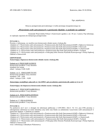 ZP-2380-409-71/3050/2016 Katowice, dnia 19.10.2016r. Egz. pojedynczy Dotyczy postępowania prowadzonego w trybie przetargu nieograniczonego na: „Wyżywienie osób zatrzymanych w garnizonie śląskim- w podziale na zadania” Komenda Wojewódzka Policji w Katowicach zgodnie z art. 38 ust. 2 ustawy Pzp informuje, że wpłynęły zapytania do niniejszego postępowania: PYTANIE 1: Prosimy o informację, czy możliwe jest dostarczanie obiadu razem z kolacją dla: -Zadanie nr 5- Wyżywienie osób zatrzymanych w Pomieszczeniu dla Osób Zatrzymanych KMP w Dąbrowie Górniczej -Zadanie nr 6- Wyżywienie osób zatrzymanych w Pomieszczeniu dla Osób Zatrzymanych KMP w Gliwicach -Zadanie nr 8- Wyżywienie osób zatrzymanych w Pomieszczeniu dla Osób Zatrzymanych KMP w w Katowicach -Zadanie nr 12- Wyżywienie osób zatrzymanych w Pomieszczeniu dla Osób Zatrzymanych KMP w Tychach -Zadanie nr 17- Wyżywienie osób zatrzymanych w Policyjnej Izbie Dziecka Wydziału Konwojowego i Policji Sądowej Oddział w Katowicach ODPOWIEDŹ: Zamawiający dopuszcza dostarczenie obiadu razem z kolacją dla: Zadanie nr 6 PDOZ KMP GLIWICE dostarczenie posiłków 2 razy dziennie śniadanie bez zmian obiad + kolacja 12,00-14,00 Zadanie nr 12 PDOZ KMP TYCHY dostarczenie posiłków 2razy dziennie śniadanie 7,00 – 8,00 obiad + kolacja 12,00 – 14,00 Zamawiający modyfikuje załącznik nr 3 do SIWZ- opis przedmiotu zamówienia dla zadań nr 6 i nr 12 Zamawiający nie dopuszcza dostarczenia obiadu razem z kolacją dla: Zadanie nr 5 PDOZ KMP DĄBROWA G. dostarczenie posiłków 3 razy dziennie Zadanie nr 8 PDOZ KMP KATOWICE dostarczenie posiłków 3 razy dziennie Zadanie nr 17 PID KATOWICE dostarczenie posiłków 3 razy dziennie PYTANIE 2: Na podstawie art.2 ust.1 o dostępie do informacji publicznej z 6-09-2001r. (Dz.U. Nr 112, poz.1198) prosimy o udostępnienie informacji na temat aktualnej ceny netto oraz brutto za całodzienne wyżywienie osób zatrzymanych w garnizonie śląskim- w podziale na zadania -Zadanie nr 5- Wyżywienie osób zatrzymanych w Pomieszczeniu dla Osób Zatrzymanych KMP w Dąbrowie Górniczej -Zadanie nr 6- Wyżywienie osób zatrzymanych w Pomieszczeniu dla Osób Zatrzymanych KMP w Gliwicach -Zadanie nr 8- Wyżywienie osób zatrzymanych w Pomieszczeniu dla Osób Zatrzymanych KMP w w Katowicach -Zadanie nr 12- Wyżywienie osób zatrzymanych w Pomieszczeniu dla Osób Zatrzymanych KMP w Tychach -Zadanie nr 17- Wyżywienie osób zatrzymanych w Policyjnej Izbie Dziecka Wydziału Konwojowego i Policji Sądowej Oddział w Katowicach wraz z informacją o aktualnym Wykonawcy ODPOWIEDŹ: Zadanie nr 5 PDOZ KMP DĄBROWA G. Firma CAFFE GALICJA Sp. z o.o. z siedzibą w Rybniku– cena całodziennego wyżywienia 8,90zł + 77% marża + 8% VAT w przypadku kobiet w ciąży i osób poniżej 18 roku życia 11,12zł + 77% marża + 8% VAT Zadanie nr 6 PDOZ KMP GLIWICE Firma CAFFE GALICJA Sp. z o.o. z siedzibą w Rybniku– cena całodziennego wyżywienia 8,90zł + 70% marża + 8% VAT w przypadku kobiet w ciąży i osób poniżej 18 roku życia 11,12zł + 70% marża + 8% VAT Zadanie nr 8 PDOZ KMP KATOWICE Firma VESUVIO Stanisław Dobruk – cena całodziennego wyżywienia 8,90zł + 29,90% marża + 8% VAT w przypadku kobiet w ciąży i osób poniżej 18 roku życia 11,12zł + 29,90% marża + 8% VAT Zadanie nr 12 PDOZ KMP TYCHY Firma NIRO Sp. z o.o LUBIN cena całodziennego wyżywienia 8,90zł + 84% marża + 8% VAT w przypadku kobiet w ciąży i osób poniżej 18 roku życia 11,12zł + 84% marża + 8% VAT Zadanie nr 17 PID KATOWICE Firma VESUVIO Stanisław Dobruk – cena całodziennego wyżywienia 11,12zł + 29,90% marża + 8% VAT wyk. w 1 egz. A.N - umieszczono na stronie internetowej Zamawiającego