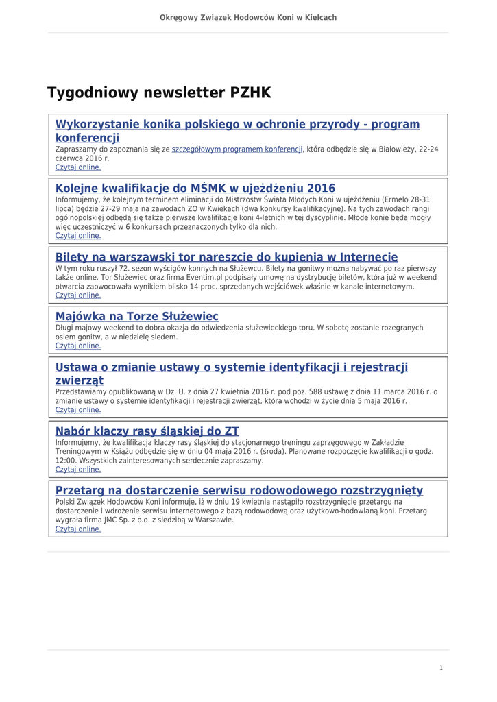 Tygodniowy newsletter PZHK - Okręgowy Związek Hodowców Koni