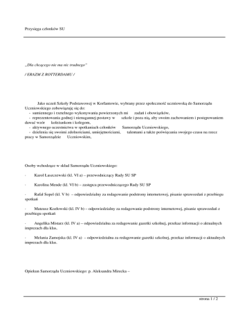 Przysięga członków SU „Dla chcącego nie ma nic trudnego” / ERAZM Z ROTTERDAMU / Jako uczeń Szkoły Podstawowej w Korfantowie, wybrany przez społeczność uczniowską do Samorządu Uczniowskiego zobowiązuję się do: - sumiennego i rzetelnego wykonywania powierzonych mi zadań i obowiązków, - reprezentowania godnej i nienagannej postawy w szkole i poza nią, aby swoim zachowaniem i postępowaniem dawać wzór koleżankom i kolegom, - aktywnego uczestnictwa w spotkaniach członków Samorządu Uczniowskiego, - dzielenia się swoimi zdolnościami, umiejętnościami, talentami a także poświęcania swojego czasu na rzecz pracy w Samorządzie Uczniowskim, Osoby wchodzące w skład Samorządu Uczniowskiego: · Karol Łaszczewski (kl. VI a) – przewodniczący Rady SU SP · Karolina Mende (kl. VI b) – zastępca przewodniczącego Rady SU SP · Rafał Sopel (kl. V b) – odpowiedzialny za redagowanie podstrony internetowej, pisanie sprawozdań z przebiegu spotkań · Mateusz Kozłowski (kl. IV b) – odpowiedzialny za redagowanie podstrony internetowej, pisanie sprawozdań z przebiegu spotkań · Angelika Mistarz (kl. IV a) – odpowiedzialna za redagowanie gazetki szkolnej, przekaz informacji o aktualnych imprezach dla klas, · Melania Zamojska (kl. IV a) – odpowiedzialna za redagowanie gazetki szkolnej, przekaz informacji o aktualnych imprezach dla klas. Opiekun Samorządu Uczniowskiego: p. Aleksandra Mirecka – strona 1 / 2 Przysięga członków SU strona 2 / 2