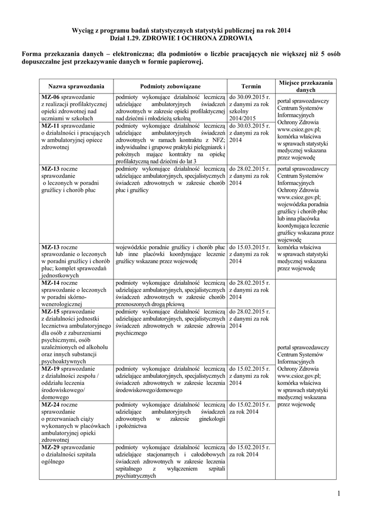 Wyciąg z programu badań statystycznych statystyki publicznej na rok 2014 Dział 1.29. ZDROWIE I OCHRONA ZDROWIA Forma przekazania danych – elektroniczna; dla podmiotów o liczbie pracujących nie większej niż 5 osób dopuszczalne jest przekazywanie danych w formie papierowej. Nazwa sprawozdania Podmioty zobowiązane Termin MZ-06 sprawozdanie z realizacji profilaktycznej opieki zdrowotnej nad uczniami w szkołach MZ-11 sprawozdanie o działalności i pracujących w ambulatoryjnej opiece zdrowotnej podmioty wykonujące działalność leczniczą udzielające ambulatoryjnych świadczeń zdrowotnych w zakresie opieki profilaktycznej nad dziećmi i młodzieżą szkolną podmioty wykonujące działalność leczniczą udzielające ambulatoryjnych świadczeń zdrowotnych w ramach kontraktu z NFZ; indywidualne i grupowe praktyki pielęgniarek i położnych mające kontrakty na opiekę profilaktyczną nad dziećmi do lat 3 podmioty wykonujące działalność leczniczą udzielające ambulatoryjnych, specjalistycznych świadczeń zdrowotnych w zakresie chorób płuc i gruźlicy do 30.09.2015 r. z danymi za rok szkolny 2014/2015 do 30.03.2015 r. z danymi za rok 2014 MZ-13 roczne sprawozdanie o leczonych w poradni gruźlicy i chorób płuc MZ-13 roczne sprawozdanie o leczonych w poradni gruźlicy i chorób płuc; komplet sprawozdań jednostkowych MZ-14 roczne sprawozdanie o leczonych w poradni skórnowenerologicznej MZ-15 sprawozdanie z działalności jednostki lecznictwa ambulatoryjnego dla osób z zaburzeniami psychicznymi, osób uzależnionych od alkoholu oraz innych substancji psychoaktywnych MZ-19 sprawozdanie z działalności zespołu / oddziału leczenia środowiskowego/ domowego MZ-24 roczne sprawozdanie o przerwaniach ciąży wykonanych w placówkach ambulatoryjnej opieki zdrowotnej MZ-29 sprawozdanie o działalności szpitala ogólnego do 28.02.2015 r. z danymi za rok 2014 wojewódzkie poradnie gruźlicy i chorób płuc do 15.03.2015 r. lub inne placówki koordynujące leczenie z danymi za rok gruźlicy wskazane przez wojewodę 2014 podmioty wykonujące działalność leczniczą udzielające ambulatoryjnych, specjalistycznych świadczeń zdrowotnych w zakresie chorób przenoszonych drogą płciową podmioty wykonujące działalność leczniczą udzielające ambulatoryjnych, specjalistycznych świadczeń zdrowotnych w zakresie zdrowia psychicznego Miejsce przekazania danych portal sprawozdawczy Centrum Systemów Informacyjnych Ochrony Zdrowia www.csioz.gov.pl; komórka właściwa w sprawach statystyki medycznej wskazana przez wojewodę portal sprawozdawczy Centrum Systemów Informacyjnych Ochrony Zdrowia www.csioz.gov.pl; wojewódzka poradnia gruźlicy i chorób płuc lub inna placówka koordynująca leczenie gruźlicy wskazana przez wojewodę komórka właściwa w sprawach statystyki medycznej wskazana przez wojewodę do 28.02.2015 r. z danymi za rok 2014 do 28.02.2015 r. z danymi za rok 2014 podmioty wykonujące działalność leczniczą do 15.02.2015 r. udzielające ambulatoryjnych, specjalistycznych z danymi za rok świadczeń zdrowotnych w zakresie leczenia 2014 środowiskowego/domowego podmioty wykonujące działalność leczniczą do 15.02.2015 r. udzielające ambulatoryjnych świadczeń za rok 2014 zdrowotnych w zakresie ginekologii i położnictwa portal sprawozdawczy Centrum Systemów Informacyjnych Ochrony Zdrowia www.csioz.gov.pl; komórka właściwa w sprawach statystyki medycznej wskazana przez wojewodę podmioty wykonujące działalność leczniczą do 15.02.2015 r. udzielające stacjonarnych i całodobowych za rok 2014 świadczeń zdrowotnych w zakresie leczenia szpitalnego z wyłączeniem szpitali psychiatrycznych 1 MZ-29A sprawozdanie o działalności podmiotu wykonującego działalność leczniczą w zakresie długoterminowej opieki zdrowotnej MZ-30 sprawozdanie podmiotu wykonującego działalność leczniczą w zakresie psychiatrycznej opieki stacjonarnej MZ-88 sprawozdanie o pracujących w podmiotach wykonujących działalność leczniczą MZ-89 sprawozdanie o specjalistach pracujących w podmiotach wykonujących działalność leczniczą MZ/Szp-11 karta statystyczna szpitalna ogólna podmioty wykonujące działalność leczniczą do 15.02.2015 r. udzielające stacjonarnych świadczeń za rok 2014 zdrowotnych w zakresie opieki długoterminowej i hospicyjnej podmioty wykonujące działalność leczniczą udzielające stacjonarnych świadczeń zdrowotnych w zakresie zdrowia psychicznego, leczenia odwykowego, rehabilitacji narkomanów z wyłączeniem szpitali ogólnych oraz regionalne ośrodki psychiatrii sądowej, Krajowy Ośrodek Psychiatrii Sądowej dla Nieletnich podmioty wykonujące działalność leczniczą udzielające ambulatoryjnych i stacjonarnych świadczeń zdrowotnych oraz regionalne centra krwiodawstwa i krwiolecznictwa do 15.02.2015 r . za rok 2014 do 28.02.2015 r. za rok 2014 portal sprawozdawczy Centrum Systemów Informacyjnych Ochrony Zdrowia www.csioz.gov.pl; komórka właściwa w sprawach statystyki medycznej wskazana przez wojewodę podmioty wykonujące działalność leczniczą do 28.02.2015 r. udzielające ambulatoryjnych i stacjonarnych za rok 2014 świadczeń zdrowotnych oraz, regionalne centra krwiodawstwa i krwiolecznictwa szpitale – przedsiębiorstwa podmiotu leczniczego, w których podmiot wykonuje działalność leczniczą w rodzaju świadczenie szpitalne z wyjątkiem szpitali i oddziałów psychiatrycznych oraz stacji dializ raz w miesiącu do 20 dni po okresie sprawozdawczym komórka właściwa w sprawach statystyki medycznej wskazana przez wojewodę, Narodowy Instytut Zdrowia Publicznego – Państwowy Zakład Higieny (część szpitali w ramach projektu pilotażowego) 2