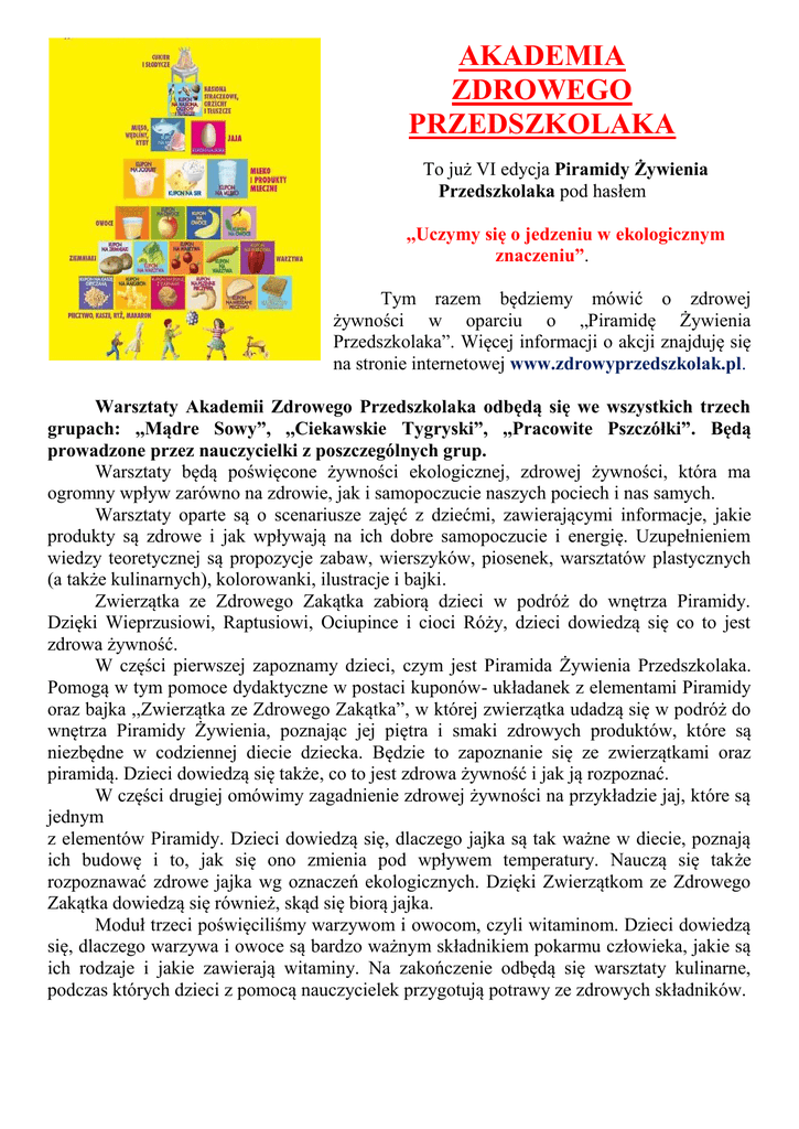 AKADEMIA ZDROWEGO PRZEDSZKOLAKA To już VI edycja Piramidy Żywienia Przedszkolaka pod hasłem ,,Uczymy się o jedzeniu w ekologicznym znaczeniu”. Tym razem będziemy mówić o zdrowej żywności w oparciu o „Piramidę Żywienia Przedszkolaka”. Więcej informacji o akcji znajduję się na stronie internetowej www.zdrowyprzedszkolak.pl. Warsztaty Akademii Zdrowego Przedszkolaka odbędą się we wszystkich trzech grupach: ,,Mądre Sowy”, ,,Ciekawskie Tygryski”, ,,Pracowite Pszczółki”. Będą prowadzone przez nauczycielki z poszczególnych grup. Warsztaty będą poświęcone żywności ekologicznej, zdrowej żywności, która ma ogromny wpływ zarówno na zdrowie, jak i samopoczucie naszych pociech i nas samych. Warsztaty oparte są o scenariusze zajęć z dziećmi, zawierającymi informacje, jakie produkty są zdrowe i jak wpływają na ich dobre samopoczucie i energię. Uzupełnieniem wiedzy teoretycznej są propozycje zabaw, wierszyków, piosenek, warsztatów plastycznych (a także kulinarnych), kolorowanki, ilustracje i bajki. Zwierzątka ze Zdrowego Zakątka zabiorą dzieci w podróż do wnętrza Piramidy. Dzięki Wieprzusiowi, Raptusiowi, Ociupince i cioci Róży, dzieci dowiedzą się co to jest zdrowa żywność. W części pierwszej zapoznamy dzieci, czym jest Piramida Żywienia Przedszkolaka. Pomogą w tym pomoce dydaktyczne w postaci kuponów- układanek z elementami Piramidy oraz bajka ,,Zwierzątka ze Zdrowego Zakątka”, w której zwierzątka udadzą się w podróż do wnętrza Piramidy Żywienia, poznając jej piętra i smaki zdrowych produktów, które są niezbędne w codziennej diecie dziecka. Będzie to zapoznanie się ze zwierzątkami oraz piramidą. Dzieci dowiedzą się także, co to jest zdrowa żywność i jak ją rozpoznać. W części drugiej omówimy zagadnienie zdrowej żywności na przykładzie jaj, które są jednym z elementów Piramidy. Dzieci dowiedzą się, dlaczego jajka są tak ważne w diecie, poznają ich budowę i to, jak się ono zmienia pod wpływem temperatury. Nauczą się także rozpoznawać zdrowe jajka wg oznaczeń ekologicznych. Dzięki Zwierzątkom ze Zdrowego Zakątka dowiedzą się również, skąd się biorą jajka. Moduł trzeci poświęciliśmy warzywom i owocom, czyli witaminom. Dzieci dowiedzą się, dlaczego warzywa i owoce są bardzo ważnym składnikiem pokarmu człowieka, jakie są ich rodzaje i jakie zawierają witaminy. Na zakończenie odbędą się warsztaty kulinarne, podczas których dzieci z pomocą nauczycielek przygotują potrawy ze zdrowych składników.