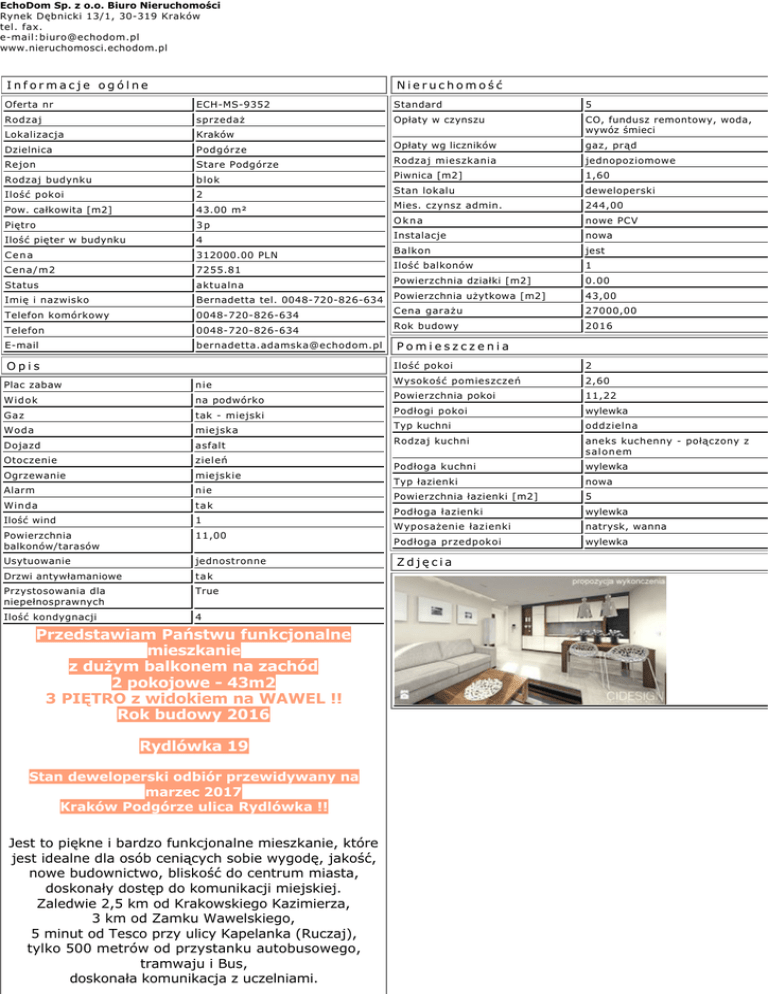 EchoDom Sp. z o.o. Biuro Nieruchomości Rynek Dębnicki 13/1, 30-319 Kraków tel. fax. e-mail:[email protected] www.nieruchomosci.echodom.pl Informacje ogólne Nieruchomość Oferta nr ECH-MS-9352 Standard 5 Rodzaj sprzedaż Opłaty w czynszu Lokalizacja Kraków CO, fundusz remontowy, woda, wywóz śmieci Dzielnica Podgórze Opłaty wg liczników gaz, prąd Stare Podgórze Rodzaj mieszkania jednopoziomowe Rodzaj budynku blok Piwnica [m2] 1,60 Ilość pokoi 2 Stan lokalu deweloperski 43.00 m² Mies. czynsz admin. 244,00 3p Okna nowe PCV 4 Instalacje nowa 312000.00 PLN Balkon jest Cena/m2 7255.81 Ilość balkonów 1 Status aktualna Powierzchnia działki [m2] 0.00 Bernadetta tel. 0048-720-826-634 Powierzchnia użytkowa [m2] 43,00 0048-720-826-634 Cena garażu 27000,00 Telefon 0048-720-826-634 Rok budowy 2016 E-mail [email protected] Pomieszczenia Rejon Pow. całkowita [m2] Piętro Ilość pięter w budynku Cena Imię i nazwisko Telefon komórkowy Opis Ilość pokoi 2 nie Wysokość pomieszczeń 2,60 na podwórko Powierzchnia pokoi 11,22 tak - miejski Podłogi pokoi wylewka Woda miejska Typ kuchni oddzielna Dojazd asfalt Rodzaj kuchni aneks kuchenny - połączony z salonem Otoczenie zieleń Podłoga kuchni wylewka Ogrzewanie miejskie Typ łazienki nowa Alarm nie Powierzchnia łazienki [m2] 5 Winda tak Podłoga łazienki wylewka Ilość wind 1 Wyposażenie łazienki natrysk, wanna Powierzchnia balkonów/tarasów 11,00 Podłoga przedpokoi wylewka Usytuowanie jednostronne Drzwi antywłamaniowe tak Przystosowania dla niepełnosprawnych True Ilość kondygnacji 4 Plac zabaw Widok Gaz Przedstawiam Państwu funkcjonalne mieszkanie z dużym balkonem na zachód 2 pokojowe - 43m2 3 PIĘTRO z widokiem na WAWEL !! Rok budowy 2016 Rydlówka 19 Stan deweloperski odbiór przewidywany na marzec 2017 Kraków Podgórze ulica Rydlówka !! Jest to piękne i bardzo funkcjonalne mieszkanie, które jest idealne dla osób ceniących sobie wygodę, jakość, nowe budownictwo, bliskość do centrum miasta, doskonały dostęp do komunikacji miejskiej. Zaledwie 2,5 km od Krakowskiego Kazimierza, 3 km od Zamku Wawelskiego, 5 minut od Tesco przy ulicy Kapelanka (Ruczaj), tylko 500 metrów od przystanku autobusowego, tramwaju i Bus, doskonała komunikacja z uczelniami. Zdjęcia Rejon, w którym znajduje się inwestycja obecnie bardzo prężnie się rozwija, powstają nowe budynki, zagospodarowywane są tereny sportowe, powstają punkty handlowe, a ceny mieszkań w stanie deweloperskim klasyfikują się w granicach od 7500zł do 9000zł Mieszkanie znajduje się w lokalizacji Kraków Podgórze w rejonie ulicy Marii Konopnickiej. Jest to idealne rozwiązanie dla osób kupujących mieszkanie pod wynajem lub jako inwestycję! Niskie koszty utrzymania mieszkania, ogrzewanie miejskie, zaliczki na wodę fundusz remontowy i śmieci w czynszu, który wynosi ok 240zł Metraż: - PRZEDPOKÓJ 3,76 -ŁAZIENKA 5,07 -POKÓJ 11,06 -POKÓJ Z ANEKSEM KUCH 22,75 (możliwość wydzielenia kuchni) SUMA 42,64 BALKON 10,89 - do mieszkania przynależy komórka lokatorska - możliwość zakupu miejsca w garażu podziemnym w cenie 27 tys. Atuty: Funkcjonalny układ pomieszczeń Doskonała lokalizacja Duży balkon o szerokości mieszkania 11m2 Duże okna o najwyższym wskaźniku izolacji akustycznej 37 Możliwość wydzielenia zamkniętej kuchni z oknem Możliwość zakupu miejsca w garażu podziemnym - 27 000 Komórka lokatorska 1800zł/m2 Praktyczne i przemyślane rozwiązania z najwyższą dbałością o bezpieczeństwo mieszkańców Niskie koszty utrzymania ogrzewanie MPEC, woda miejska, niski czynsz Możliwość zakupu mieszkania z wykończeniem Atrakcyjna cena Budynek powstaje z wielką dbałością o jakość materiałów Budynek 4 piętrowy - z 3 i 4 piętra widok na Wawel i panoramę miasta! Oddanie już w marcu!! Obecnie trwają prace z tynkowaniem ścian wewnętrznych. Zapraszam do umówienia spotkania, na którym udzielimy więcej informacji. Więcej ofert na EchoDom.pl! BIURO NIERUCHOMOŚCI EchoDom Sp. z o.o.- szeroki wybór ofert. Kompleksowa obsługa przy sprzedaży, wynajmie nieruchomości. Atrakcyjne propozycje kredytowe, sporządzane wedle potrzeb Klientów. ZAPEWNIAMY PROFESJONALIZM I BEZPIECZEŃSTWO ZAWIERANYCH TRANSAKCJI! © Wszelkie prawa zastrzeżone - EchoDom