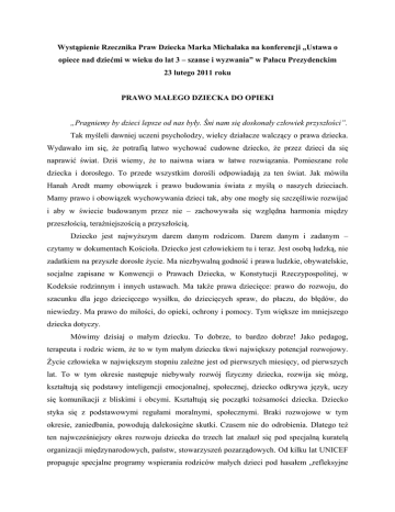Wystąpienie Rzecznika Praw Dziecka Marka Michalaka na konferencji „Ustawa o opiece nad dziećmi w wieku do lat 3 – szanse i wyzwania” w Pałacu Prezydenckim 23 lutego 2011 roku PRAWO MAŁEGO DZIECKA DO OPIEKI „Pragniemy by dzieci lepsze od nas były. Śni nam się doskonały człowiek przyszłości”. Tak myśleli dawniej uczeni psycholodzy, wielcy działacze walczący o prawa dziecka. Wydawało im się, że potrafią łatwo wychować cudowne dziecko, że przez dzieci da się naprawić świat. Dziś wiemy, że to naiwna wiara w łatwe rozwiązania. Pomieszane role dziecka i dorosłego. To przede wszystkim dorośli odpowiadają za ten świat. Jak mówiła Hanah Aredt mamy obowiązek i prawo budowania świata z myślą o naszych dzieciach. Mamy prawo i obowiązek wychowywania dzieci tak, aby one mogły się szczęśliwie rozwijać i aby w świecie budowanym przez nie – zachowywała się względna harmonia między przeszłością, teraźniejszością a przyszłością. Dziecko jest najwyższym darem danym rodzicom. Darem danym i zadanym – czytamy w dokumentach Kościoła. Dziecko jest człowiekiem tu i teraz. Jest osobą ludzką, nie zadatkiem na przyszłe dorosłe życie. Ma niezbywalną godność i prawa ludzkie, obywatelskie, socjalne zapisane w Konwencji o Prawach Dziecka, w Konstytucji Rzeczypospolitej, w Kodeksie rodzinnym i innych ustawach. Ma także prawa dziecięce: prawo do rozwoju, do szacunku dla jego dziecięcego wysiłku, do dziecięcych spraw, do płaczu, do błędów, do niewiedzy. Ma prawo do miłości, do opieki, ochrony i pomocy. Tym większe im mniejszego dziecka dotyczy. Mówimy dzisiaj o małym dziecku. To dobrze, to bardzo dobrze! Jako pedagog, terapeuta i rodzic wiem, że to w tym małym dziecku tkwi największy potencjał rozwojowy. Życie człowieka w największym stopniu zależne jest od pierwszych miesięcy, od pierwszych lat. To w tym okresie następuje niebywały rozwój fizyczny dziecka, rozwija się mózg, kształtują się podstawy inteligencji emocjonalnej, społecznej, dziecko odkrywa język, uczy się komunikacji z bliskimi i obcymi. Kształtują się początki tożsamości dziecka. Dziecko styka się z podstawowymi regułami moralnymi, społecznymi. Braki rozwojowe w tym okresie, zaniedbania, powodują dalekosiężne skutki. Czasem nie do odrobienia. Dlatego też ten najwcześniejszy okres rozwoju dziecka do trzech lat znalazł się pod specjalną kuratelą organizacji międzynarodowych, państw, stowarzyszeń pozarządowych. Od kilku lat UNICEF propaguje specjalne programy wspierania rodziców małych dzieci pod hasałem „refleksyjne rodzicielstwo”. Coraz częściej organizacje III sektora włączają się do różnych działań skierowanych do matek ciężarnych, matek karmiących, do małych dzieci wychowywanych w trudnych warunkach, dzieci z niepełnosprawnościami, dzieci wymagających opieki i pomocy. Są to różnorodne programy socjalno-edukacyjne adresowane do rodziców. Rodzina i rodzicielstwo to dzisiaj bardzo ważny problem społeczny, polityczny, edukacyjny. Rodzicielstwo jest rozumiane jako proces uczenia się roli rodzica, uczenia się dziecka, uczenia się od dziecka – jakby powiedział Korczak, obserwowania dziecka, wsłuchiwania się w dziecko, rozmowy z dzieckiem. W ten ważny program wpisuje się podpisana dzisiaj przez Pana Prezydenta Ustawa o opiece nad dzieckiem do lat 3. To szansa i nadzieja dla dzieci i rodziny. Od nas wszystkich zależy jak ją zinterpretujemy, jak ją wprowadzimy do praktyki społecznej. Art. 48. Konstytucji Rzeczypospolitej mówi, iż rodzice mają prawo wychowywać dziecko zgodnie z własnymi przekonaniami np. religijnymi, pedagogicznymi, psychologicznymi, etc. Ale jednocześnie zgodnie z zasadą pomocniczości wpisaną do preambuły Konstytucji – państwo ma obowiązek wspierać rodzinę w realizacji jej funkcji opiekuńczych, wychowawczych, edukacyjnych. Co to znaczy wspierać rodzinę? To znaczy dawać rodzinie możliwości instytucjonalne, prawne, finansowe, organizacyjne pozwalające wychowywać dziecko, w tym posłać dziecko do żłobka, klubiku, do dziennej opiekunki czy niani korzystając ze wsparcia, państwa. Ale to nie wszystko! Wsparcie to także informacja, wiedza, uczenie się, jak wychowywać dziecko, co to znaczy być rodzicem. Do żłobka, klubiku, przedszkola i szkoły trafia dziecko i jego rodzice. Rozumiem to bardzo dokładnie jako Rzecznik Praw Dziecka. Rodzice są naturalnymi partnerami wszelkich instytucji opiekuńczych i edukacyjnych. Razem z opiekunami, wychowawcami, nauczycielami ale także z innymi rodzicami tworzą wspólnotę współodpowiedzialną za to, aby ich dzieciom było jak najlepiej w żłobku, przedszkolu, szkole. Ta rodzicielska wspólnota podejmuje różne działania, wzajemnie się wspiera, kontroluje, uczy. Państwo ma obowiązek – zgodnie z zasadą subsydiarności – tworzyć warunki prawne, finansowe, organizacyjne opieki i edukacji dzieci. Ale to od rodziców jako naturalnych partnerów, zależy jakie będą te klubiki i żłobki, jak one będą pracować. Jest to nowe oblicze instytucji opiekuńczych, wychowawczych, edukacyjnych dla dzieci w państwie demokratycznym. Uczymy się dzisiaj wszyscy takiego funkcjonowania instytucji opiekuńczych i edukacyjnych. Uczą się studenci pedagogiki, pracy socjalnej, nauczyciele, pielęgniarki, teolodzy, artyści. Nie jest to łatwe zadanie. Większość z nas rodziców wychowała się w szkole niedemokratycznej, nieuspołecznionej, która często marginalizowała rodzinę. Nie mamy dobrych doświadczeń we współdziałaniu z profesjonalistami zajmującymi się opieką i wychowaniem dzieci. Podpisana dzisiaj przez Pana Prezydenta Ustawa jest szansą dla dzieci i rodziny. Możemy wspólnie w inny sposób wypełnić jej postanowienia. Żłobki, klubiki to instytucje, które zgodnie z Art. 2 Ustawy mają pełnić funkcje opiekuńcze-wychowawcze, edukacyjne. Podkreślam – edukacyjne. Mają służyć 