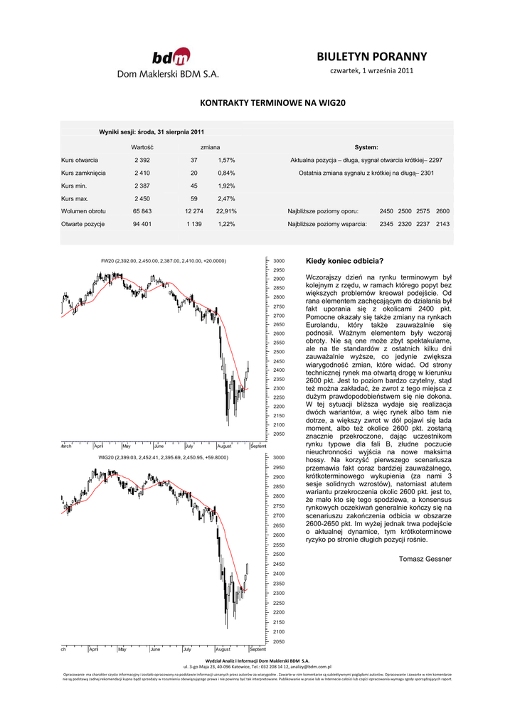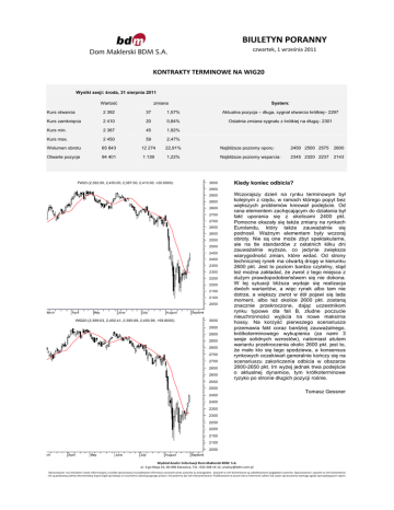 BIULETYN PORANNY czwartek, 1 września 2011 KONTRAKTY TERMINOWE NA WIG20 Wyniki sesji: środa, 31 sierpnia 2011 Wartość zmiana System: Kurs otwarcia 2 392 37 1,57% Aktualna pozycja – długa, sygnał otwarcia krótkiej– 2297 Kurs zamknięcia 2 410 20 0,84% Ostatnia zmiana sygnału z krótkiej na długą– 2301 Kurs min. 2 387 45 1,92% Kurs max. 2 450 59 2,47% Wolumen obrotu 65 843 12 274 22,91% Najbliższe poziomy oporu: 2450 2500 2575 2600 Otwarte pozycje 94 401 1 139 1,22% Najbliższe poziomy wsparcia: 2345 2320 2237 2143 3000 FW20 (2,392.00, 2,450.00, 2,387.00, 2,410.00, +20.0000) Kiedy koniec odbicia? 2950 2900 2850 2800 2750 2700 2650 2600 2550 2500 2450 2400 2350 2300 2250 2200 2150 2100 2050 March April May June July August Septemb WIG20 (2,399.03, 2,452.41, 2,395.69, 2,450.95, +59.8000) 3000 2950 2900 2850 2800 2750 2700 2650 2600 2550 2500 Wczorajszy dzień na rynku terminowym był kolejnym z rzędu, w ramach którego popyt bez większych problemów kreował podejście. Od rana elementem zachęcającym do działania był fakt uporania się z okolicami 2400 pkt. Pomocne okazały się także zmiany na rynkach Eurolandu, który także zauważalnie się podnosił. Ważnym elementem były wczoraj obroty. Nie są one może zbyt spektakularne, ale na tle standardów z ostatnich kilku dni zauważalnie wyższe, co jedynie zwiększa wiarygodność zmian, które widać. Od strony technicznej rynek ma otwartą drogę w kierunku 2600 pkt. Jest to poziom bardzo czytelny, stąd też można zakładać, że zwrot z tego miejsca z dużym prawdopodobieństwem się nie dokona. W tej sytuacji bliższa wydaje się realizacja dwóch wariantów, a więc rynek albo tam nie dotrze, a większy zwrot w dół pojawi się lada moment, albo też okolice 2600 pkt. zostaną znacznie przekroczone, dając uczestnikom rynku typowe dla fali B, złudne poczucie nieuchronności wyjścia na nowe maksima hossy. Na korzyść pierwszego scenariusza przemawia fakt coraz bardziej zauważalnego, krótkoterminowego wykupienia (za nami 3 sesje solidnych wzrostów), natomiast atutem wariantu przekroczenia okolic 2600 pkt. jest to, że mało kto się tego spodziewa, a konsensus rynkowych oczekiwań generalnie kończy się na scenariuszu zakończenia odbicia w obszarze 2600-2650 pkt. Im wyżej jednak trwa podejście o aktualnej dynamice, tym krótkoterminowe ryzyko po stronie długich pozycji rośnie. 2450 Tomasz Gessner 2400 2350 2300 2250 2200 2150 2100 2050 ch April May June July August Septemb Wydział Analiz i Informacji Dom Maklerski BDM S.A. ul. 3‐go Maja 23, 40‐096 Katowice, Tel.: 032 208 14 12, [email protected] Opracowanie ma charakter czysto informacyjny i zostało opracowany na podstawie informacji uznanych przez autorów za wiarygodne . Zawarte w nim komentarze są subiektywnymi poglądami autorów. Opracowanie i zawarte w nim komentarze nie są podstawą żadnej rekomendacji kupna bądź sprzedaży w rozumieniu obowiązującego prawa i nie powinny być tak interpretowane. Publikowanie w prasie lub w Internecie całości lub części opracowania wymaga zgody sporządzających raport. BIULETYN PORANNY czwartek, 1 września 2011 RYNEK AKCJI Wyniki sesji: środa, 31 sierpnia 2011. Kurs otwarcia Kurs zamknięcia Zmiana [%] Kurs min. Kurs max. Zakres wahań Wartość obrotów [mln PLN] 52 tygodnie Indeks Kurs max. Kurs min. WIG20 2 942,4 2 115,4 2 399,03 2 450,95 2,50% 2 395,69 2 452,41 56,7 1 249,6 sWIG80 12 936,5 8 447,6 9 535,26 9 613,49 1,04% 9 534,91 9 613,49 78,6 38,4 mWIG40 2 993,2 2 054,5 2 378,58 2 422,89 2,45% 2 368,60 2 422,89 54,3 249,6 WIG PL 49 765,2 36 660,6 41 103,64 41 722,55 2,34% 41 103,64 41 722,55 618,9 - WIG 50 501,8 36 252,4 41 430,21 42 222,38 2,23% 41 398,22 42 222,91 824,7 1 630.5 Spółka Cena [PLN] zmiana % Mkt Cap [mln PLN] zmiana % względem WIG20 1M 3M 6M 42,50 3 527 6,8% -10,8% -19,6% -15,6% 4,3% -1,5% -4,1% -6,6% BANK HANDLOWY 65,00 8 493 -4,4% -19,8% -32,6% -30,5% -6,9% -10,5% -17,0% -21,6% BOGDANKA 105,30 3 582 1,3% -0,6% -11,4% -9,7% -1,2% 8,7% 4,1% -0,7% BRE 275,00 11 574 5,8% -13,8% -19,8% -11,0% 3,3% -4,5% -4,3% -2,1% CEZ 134,60 72 413 -0,7% -3,9% -12,0% 3,0% -3,2% 5,4% 3,6% 11,9% GETIN 9,79 7 164 6,8% -10,3% -29,6% -24,8% 4,3% -1,0% -14,0% -15,9% GTC 12,10 2 654 6,2% -26,8% -39,2% -41,3% 3,7% -17,5% -23,7% -32,4% KERNEL 65,50 5 219 -2,4% -11,5% -19,6% -20,9% -4,9% -2,2% -4,1% -11,9% KGHM 174,80 34 960 2,9% -6,8% -8,5% -0,2% 0,4% 2,5% 7,0% 8,8% LOTOS 30,84 4 005 0,9% -19,7% -34,0% -23,4% -1,6% -10,4% -18,5% -14,4% ASSECOPOL dzienna 1M 3M 6M dzienna PBG 95,00 1 358 -1,4% -29,2% -32,6% -51,3% -3,9% -19,9% -17,0% -42,3% PEKAO 147,90 38 804 5,0% -6,1% -12,0% -9,8% 2,5% 3,2% 3,6% -0,9% PGE 20,64 38 592 0,7% -9,9% -16,3% -7,4% -1,8% -0,6% -0,7% 1,5% PGNIG 4,07 24 013 -2,6% -4,7% -7,1% 5,2% -5,1% 4,6% 8,5% 14,1% PKNORLEN 39,59 16 933 4,2% -14,5% -26,1% -13,0% 1,7% -5,2% -10,6% -4,0% PKOBP 36,25 45 313 2,4% -11,6% -18,0% -12,0% -0,1% -2,3% -2,4% -3,0% PZU 355,00 30 655 1,5% -6,1% -9,0% 3,4% -1,0% 3,2% 6,6% 12,4% TAURON 5,34 9 359 0,9% -16,7% -18,8% -13,5% -1,6% -7,4% -3,3% -4,5% TPSA 17,30 23 107 5,1% 0,1% -4,7% 3,6% 2,6% 9,4% 10,8% 12,6% TVN 14,58 5 011 3,4% -13,0% -14,7% -14,8% 0,9% -3,7% 0,8% -5,8% Komentarz po sesji Komentarz przed sesją: Równość fal osiągnięta Koniec korekty? Docelowy zasięg korekty spadków został osiągnięty. Wskazywałem na 2450 pkt (wczorajsze zamknięcie) jednak wydawało się, że przed tym poziomem rynek trochę odpocznie. Udało się jednak „z marszu” i moim zdaniem doszliśmy do punktu zwrotnego. Interesujące jest „rozjechanie” wartości indeksu bazowego i pochodnej na fixingu (baza -40 pkt). Zapewne to zasługa „window dressing” i dziś indeks powinien oddać większość zdobyczy. Jeśli podaży uda się zakryć wczorajszą, byczą lukę 2395-2391 to rynek skieruje się w stronę 2330 pkt. Tam w mojej opinii może rozstrzygnąć się średnioterminowy scenariusz. Odbicie będzie oznaczać, że korekta spadków nie jest zakońc