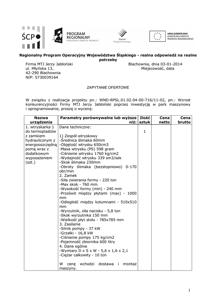 Regionalny Program Operacyjny Województwa Śląskiego - realna odpowiedź na realne potrzeby Firma MTJ Jerzy Jabłoński Blachownia, dnia 03-01-2014 ul. Młyńska 13, Miejscowość, data 42-290 Blachownia NIP: 5730039164 ZAPYTANIE OFERTOWE W związku z realizacja projektu pn.: WND-RPSL.01.02.04-00-716/11-02, pn.: Wzrost konkurencyjności Firmy MTJ Jerzy Jabłoński poprzez inwestycję w park maszynowy i oprogramowanie, proszę o wycenę: Nazwa urządzenia 1. wtryskarka 1 do termoplastów z zamkiem hydraulicznym z energooszczędną pomą wraz z dodatkowym wyposażeniem (szt.) Parametry porównywalne lub wyższe Ilość niż: sztuk Dane techniczne: 1 1) Zespół wtryskowy -Średnica ślimaka 60mm -Objętość wtrysku 650cm3 -Masa wtrysku (PS) 598 gram -Ciśnienie wtrysku 1760 kg/cm2 -Wydajność wtrysku 339 sm3/sek -Skok ślimaka 230mm -Obroty ślimaka (bezstopniowo) 0-170 obr/min 2. Zamek -Siła zwierania formy - 220 ton -Max skok - 760 mm -Wysokość formy (min) - 240 mm -Prześwit między płytami (max) - 1000 mm -Odległość między kolumnami - 510x510 mm -Wyrzutnik, siła nacisku - 5,8 ton -Skok wyrzutnika 150 mm -Wielkość płyt stołu - 785x785 mm 3. Zasilanie -Silnik pompy - 37 kW -Grzałki - 16,8 kW -Ciśnienie pompy 175 kg/cm2 -Pojemność zbiornika 600 litry 4. Dane ogólne -Wymiary D x S x W - 5,6 x 1,6 x 2,1 -Ciężar całkowity - 10 ton W cenę wchodzi maszyny. dostawa i Cena netto Cena brutto montaż 1 wtryskarka 2 do termoplastów z zamkiem hydraulicznym z energooszczędną pomą wraz z dodatkowym wyposażeniem (szt.) Zespół wtryskowy -Średnica ślimaka - 75mm -Objętość wtrysku - 1281cm3 -Masa wtrysku (PS) - 1179gram -Ciśnienie wtrysku 1680 kg/cm2 -Wydajność wtrysku 530 cm3/sek -Prędkość wtrysku - 120mm/sek -Skok ślimaka 290mm -Obroty ślimaka (bezstopniowo) 0-170 obr/min 2. Zamek -Siła zwierania formy - 360 ton -Max skok - 1000 mm -Wysokość formy (min) - 300 mm -Prześwit między płytami (max) - 1300 mm -Odległość między kolumnami - 700x700 mm -Wyrzutnik, siła nacisku – 10 ton -Skok wyrzutnika 200 mm -Wielkość płyt stołu - 1025x1025 mm 3. Zasilanie -Silnik pompy - 55 kW -Grzałki - 24,6 kW -Ciśnienie pompy 175 kg/cm2 -Pojemność zbiornika 800 litry 4. Dane ogólne -Wymiary D x S x W - 7,0 x 1,9 x 2,4 1 Ciężar całkowity - 17 ton W cenę wchodzi dostawa i montaż maszyny. Termin składania ofert do 17.01.2014r. Kryterium wyboru: 100% cena Odbierający: Przekazujący 2