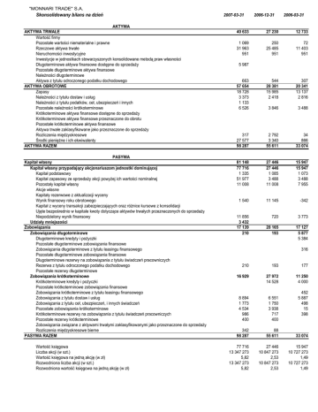 "MONNARI TRADE" S.A. Skonsolidowany bilans na dzień AKTYWA AKTYWA TRWAŁE Wartość firmy Pozostałe wartości niematerialne i prawne Rzeczowe aktywa trwałe Nieruchomości inwestycyjne Inwestycje w jednostkach stowarzyszonych konsolidowane metodą praw własności Długoterminowe aktywa finansowe dostępne do sprzedaŜy Pozostałe długoterminowe aktywa finansowe NaleŜności długoterminowe Aktywa z tytułu odroczonego podatku dochodowego AKTYWA OBROTOWE Zapasy NaleŜności z tytułu dostaw i usług NaleŜności z tytułu podatków, ceł, ubezpieczeń i innych Pozostałe naleŜności krótkoterminowe Krótkoterminowe aktywa finansowe dostępne do sprzedaŜy Krótkoterminowe aktywa finansowe przeznaczone do obrotu Pozostałe krótkoterminowe aktywa finansowe Aktywa trwałe zaklasyfikowane jako przeznaczone do sprzedaŜy Rozliczenia międzyokresowe Środki pienięŜne i ich ekwiwalenty AKTYWA RAZEM PASYWA Kapitał własny Kapitał własny przypadający akcjonariuszom jednostki dominującej Kapitał podstawowy Kapitał zapasowy ze sprzedaŜy akcji powyŜej ich wartości nominalnej Pozostały kapitał własny Akcje własne Kapitały rezerwowe z aktualizacji wyceny Wynik finansowy roku obrotowego Kapitał z wyceny transakcji zabezpieczających oraz róŜnice kursowe z konsolidacji Ujęte bezpośrednio w kapitale kwoty dotyczące aktywów trwałych przeznaczonych do sprzedaŜy Niepodzielony wynik finansowy Udziały mniejszości Zobowiązania Zobowiązania długoterminowe Długoterminowe kredyty i poŜyczki Pozostałe długoterminowe zobowiązania finansowe Zobowiązania długoterminowe z tytułu leasingu finansowego Pozostałe długoterminowe zobowiązania finansowe Długoterminowe rezerwy na zobowiązania z tytułu świadczeń pracowniczych Rezerwa z tytułu odroczonego podatku dochodowego Pozostałe rezerwy długoterminowe Zobowiązania krótkoterminowe Krótkoterminowe kredyty i poŜyczki Pozostałe krótkoterminowe zobowiązania finansowe Zobowiązania krótkoterminowe z tytułu leasingu finansowego Zobowiązania z tytułu dostaw i usług Zobowiązania z tytułu ceł, ubezpieczeń, i innych świadczeń Pozostałe zobowiązania krótkoterminowe Krótkoterminowe rezerwy na zobowiązania z tytułu świadczeń pracowniczych Pozostałe rezerwy krótkoterminowe Zobowiązania związane z aktywami trwałymi zaklasyfikowanymi jako przeznaczone do sprzedaŜy Rozliczenia międzyokresowe bierne PASYWA RAZEM Wartość księgowa Liczba akcji (w szt.) Wartość księgowa na jedną akcję (w zł) Rozwodniona liczba akcji (w szt.) Rozwodniona wartość księgowa na jedną akcję (w zł) 2007-03-31 40 633 0 1 069 31 963 951 0 5 987 0 0 663 57 654 18 728 3 373 1 133 6 526 2006-12-31 2006-03-31 0 0 0 317 27 577 98 287 27 230 0 250 25 485 951 0 0 0 0 544 28 381 15 985 2 418 0 3 846 0 0 0 0 2 792 3 340 55 611 12 733 0 72 11 403 951 0 0 0 0 307 20 341 13 137 2 816 0 3 488 0 0 0 0 34 866 33 074 81 148 77 716 1 335 51 977 11 008 0 0 1 540 0 0 11 856 3 432 17 139 210 0 0 0 0 0 210 0 16 929 0 0 0 8 894 1 773 4 534 986 400 0 342 98 287 27 446 27 446 1 085 3 488 11 008 0 0 11 145 0 0 720 0 28 165 193 0 0 0 0 0 193 0 27 972 14 528 0 0 6 551 1 750 3 938 717 400 0 88 55 611 15 947 15 947 1 073 3 488 7 955 0 0 -342 0 0 3 773 0 17 127 5 877 5 384 0 316 0 0 177 0 11 250 4 000 0 452 5 887 498 15 398 0 0 0 33 074 77 716 13 347 273 5,82 13 347 273 5,82 27 446 10 847 273 2,53 10 847 273 2,53 15 947 10 727 273 1,49 10 727 273 1,49 "MONNARI TRADE" S.A. Pozycje pozabilansowe na dzień 2007-03-31 2006-12-31 2006-03-31 NaleŜności warunkowe: Zobowiązania warunkowe: na rzecz jednostek powiązanych na rzecz pozostałych jednostek z tytułu udzielonych gwarancji i poręczeń Skonsolidowany rachunek zysków i strat w okresie 300 300 300 300 2007-01-01 2007-03-31 Przychody ze sprzedaŜy Przychody ze sprzedaŜy wyrobów i usług Przychody ze sprzedaŜy towarów i materiałów Koszt własny sprzedaŜy (koszt sprzedanych produktów, usług, towarów i materiałów) Koszt wytworzenia sprzedanych wyrobów i usług Koszt sprzedanych towarów i materiałów Koszt zysk strata brutto ze sprzedaŜy Koszty sprzedaŜy Koszty ogólnego zarządu Zysk (strata) ze sprzedaŜy Pozostałe przychody operacyjne Pozostałe koszty operacyjne Udział w zyskach jednostek objętych konsolidacją metodą praw własności Koszty restrukturyzacji Zysk (strata) na działalności operacyjnej Przychody (koszty) finansowe Pozostałe zyski (straty) z inwestycji Zysk (strata) przed opodatkowaniem Podatek dochodowy Zysk (strata) netto mniejszości Zysk (strata) netto z działalności kontynuowanej Działalność zaniechana Zysk (strata) netto z działalności zaniechanej Zysk (strata) netto Zysk (strata) netto na jedną akcję zwykłą (zanualizowany): z działalności kontynuowanej podstawowy rozwodniony 2006-01-01 2006-12-31 2006-01-01 2006-03-31 27 104 39 27 065 -12 729 -16 -12 713 14 375 -10 120 -3 085 1 170 382 -131 0 0 1 421 447 0 1 868 -350 -22 1 540 91 676 127 91 549 -38 542 -50 -38 492 53 134 -29 376 -7 344 16 414 1 056 -2 307 0 0 15 163 -1 303 0 13 860 -2 715 0 11 145 13 921 24 13 897 -7 269 -10 -7 259 6 652 -5 424 -1 346 -118 38 -57 0 0 -137 -292 0 -429 87 0 -342 1 540 11 145 -342 1,16 1,16 1,04 1,04 0,27 0,27 z działalności kontynuowanej i zaniechanej podstawowy rozwodniony - - - "MONNARI TRADE" S.A. Skonsolidowany rachunek przepływów pienięŜnych w okresie 2007-01-01 2007-03-31 Przepływy środków pienięŜnych z działalności operacyjnej Zysk (strata) netto Korekty: Zyski (straty) mniejszości Amortyzacja Zyski (straty) z tytułu róŜnic kursowych Odsetki i udziały w zyskach (dywidendy) Zysk (strata) z działalności inwestycyjnej Zmiana stanu rezerw Zmiana stanu zapasów Zmiana stanu naleŜności Zmiana stanu zobowiązań krótkoterminowych, z wyjątkiem poŜyczek i kredytów Zmiana stanu rozliczeń międzyokresowych Inne korekty Przepływy pienięŜne netto z działalności operacyjnej 1 540 -753 -22 528 -68 40 0 17 231 685 -4 818 2 666 -12 78