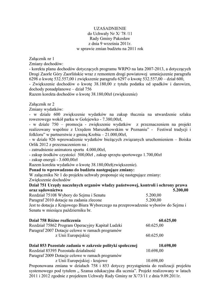 UZASADNIENIE do Uchwały Nr X/ 78 /11 Rady Gminy Pakosław z dnia 9 września 2011r. w sprawie zmian budżetu na 2011 rok Załącznik nr 1 Zmiany dochodów: - korekta planu dochodów dotyczących programu WRPO na lata 2007-2013, a dotyczących Drogi Zaorle Góry Zaorlińskie wraz z remontem drogi powiatowej umniejszenie paragrafu 6298 o kwotę 532.557,00 i zwiększenie paragrafu 6297 o kwotę 532.557,00 – dział 600, - Zwiększenie dochodów o kwotę 38.180,00 z tytułu podatku od spadków i darowizn, dochody ponadplanowe – dział 756 Razem korekta dochodów o kwotę 38.180,00zł (zwiększenie) Załącznik nr 2 Zmiany wydatków: - w dziale 600 zwiększenie wydatków na zakup tłucznia na utwardzenie szlaku rowerowego wokół parku w Golejewko - 7.380,00zł, - w dziale 750 – promocja - zwiększenie wydatków z przeznaczeniem na projekt realizowany wspólnie z Urzędem Marszałkowskim w Poznaniu” - Festiwal tradycji i folkloru” w partnerstwie z gminą Krobia – 21.000,00zł, - w dziale 926 wprowadzenie wydatków bieżących związanych uruchomieniem – Boiska Orlik 2012 z przeznaczeniem na : - zatrudnienie animatora sportu 4.000,00zł, - zakup środków czystości 500,00zł , zakup sprzętu sportowego 1.700,00zł - zakup energii - 3.600,00zł Razem korekta wydatków o kwotę 38.180,00zł(zwiększenie). Ponad to wprowadzono do budżetu następujące zmiany: W załączniku Nr 1 do projektu uchwały proponuje się następujące zmiany: Zwiększenie dochodów Dział 751 Urzędy naczelnych organów władzy państwowej, kontroli i ochrony prawa oraz sądownictwa 5.200,00 Rozdział 75108 Wybory do Sejmu i Senatu 5.200,00 Paragraf 2010 dotacje na zadania zlecone 5.200,00 Jest to dotacja z Krajowego Biura Wyborczego na przeprowadzenie wyborów do Sejmu i Senatu w miesiącu październiku br. Dział 758 Różne rozliczenia Rozdział 75862 Program Operacyjny Kapitał Ludzki Paragraf 2007 Dotacje celowe w ramach programów z Unii Europejskiej 60.625,00 60.625,00 60.625,00 Dział 853 Pozostałe zadania w zakresie polityki społecznej 10.698,00 Rozdział 85395 Pozostała działalność 10.698,00 Paragraf 2009 Dotacje celowe w ramach programów z Unii Europejskiej - krajowe 10.698,00 Proponowana zmiana w działach 758 i 853 dotyczy przystąpienia do realizacji projektu systemowego pod tytułem „ Szansa edukacyjna dla ucznia”. Projekt realizowany w latach 2011 i 2012 zgodnie z projektem Uchwały Rady Gminy nr X/73/11 z dnia 9.09.2011r. Zwiększenie dochodów w proponowanej autopoprawce 76.523,00 Łącznie zwiększenie planu dochodów Plan dochodów po zmianach 114.703,00 15.666.057,00 W załączniku Nr 2 do projektu uchwały proponuje się następujące zmiany: Zwiększenie i zmniejszenie wydatków Dział 751 Urzędy naczelnych organów władzy państwowej, kontroli i ochrony prawa oraz sądownictwa 5.200,00 Rozdział 75108 Wybory do Sejmu i Senatu 5.200,00 Zmiana dotyczy zwiększenia wydatków rzeczowych na przeprowadzenie wyborów do Sejmu i Senatu w październiku br. Dział 801 Oświata i wychowanie 71.323,00 Rozdział 80195 Pozostała działalność 71.323,00 Proponowana zmiana w dziale 801 dotyczy przystąpienia do realizacji projektu systemowego pod tytułem „ Szansa edukacyjna dla ucznia” klasy I-III szkoły podstawowe w Gminie Pakosław. Projekt realizowany w latach 2011 i 2012 zgodnie z zapisami projektu Uchwały Rady Gminy nr X/73/11 z dnia 9.09.2011r. Projekt finansowany w 100% całkowitych wydatków kwalifikowanych projektu systemowego przez Wojewódzki Urząd Pracy w Poznaniu. W dziale 900 Gospodarka komunalna i ochrona środowiska przeniesienie planowanych wydatków między paragrafami: zmniejszenie paragraf 4010 wynagrodzenia -6.000,00 zwiększenie paragraf 4300 zakup usług pozostałych +6.000,00 proponuje się W dziale 926 Kultura fizyczna proponuje się przeniesienie planowanych wydatków między paragrafami w związku z przekwalifikowaniem zadania inwestycyjnego „Wymiana nawierzchni asfaltowej boiska na nawierzchnię z trawy syntetycznej przy szkole podstawowej w Chojnie” - planowane wydatki w roku budżetowym w kwocie 300.000,00zł, na dwa zadania: na zadanie inwestycyjne pod nazwą „Budowa instalacji oświetleniowej boiska szkolnego przy szkole podstawowej w Chojnie” w kwocie 65.000,00 i wydatki bieżące – usługi remontowe „Wymiana nawierzchni boiska na nawierzchnię z trawy syntetycznej przy Szkole Podstawowej w Chojnie ” w kwocie 235.000,00zł, W związku z powyższym zmiana w załączniku Nr 2 do projektu uchwały przedstawia się następująco: Dział 926 Rozdział 92605 paragraf 6050 zmniejszenie -235.000,00 Dział 926 Rozdział 92605 paragraf 4270 zwiększenie +235.000,00 Zwiększenie wydatków w proponowanej autopoprawce 76.523,00 Łącznie zwiększenie planu wydatków Plan wydatków po zmianach 114.703,00 21.639.217,00 Wprowadzone zmiany w załączniku Nr 1 i 2 powodują wprowadzenie zmian w dochodach i wydatkach dotyczących zadań zleconych co obrazuje załącznik Nr 3 do projektu zmian w budżecie. Wprowadzone zmiany w załączniku Nr 2 a dotyczące przystąpienia do realizacji projektu systemowego pod tytułem „ Szansa edukacyjna dla ucznia” klasy I-III szkoły podstawowe w Gminie Pakosław powodują zmianę w wydatkach bieżących załącznika Nr 4 do uchwały budżetowej z dnia 28 stycznia 2011r. w sprawie budżetu gminy na 2011 rok – Wydatki na programy i projekty ze środków UE, EFTA i innych środków ze źródeł zagranicznych niepodlegających zwrotowi zgodnie z załącznikiem nr 4 do projektu zmian w budżecie gminy. Wprowadzone zmiany w załączniku Nr 2 a dotyczące zmiany wydatków majątkowych w działach 600 Transport i łączność i 926 Kultura fizyczna obrazuje załącznik Nr 5 do projektu zmian w budżecie.