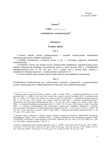 Projekt 22 stycznia 2008 r. Ustawa1) z dnia ....................... o działalności reasekuracyjnej2) Rozdział 1 Przepisy ogólne Art. 1 1. Ustawa określa zasady podejmowania i warunki wykonywania działalności reasekuracyjnej przez zakłady reasekuracji. 2. Zakłady reasekuracji, o których mowa w ust. 1, wykonują wyłącznie działalność reasekuracyjną. 3. Przepisów ustawy nie stosuje się do wykonywania działalności reasekuracyjnej przez zakłady ubezpieczeń, działające na podstawie ustawy z dnia 22 maja 2003 r. o działalności ubezpieczeniowej (Dz. U. Nr 124, poz. 1151, z późn. zm.3)), zwanej dalej „ustawą o działalności ubezpieczeniowej”, z zastrzeŜeniem rozdziału 8 i 9. 4. Ustawa określa takŜe zasady sprawowania nadzoru nad zakładami reasekuracji. Art. 2 Działalnością reasekuracyjną jest wykonywanie czynności związanych z przyjmowaniem ryzyka cedowanego przez zakład ubezpieczeń lub przez inny zakład reasekuracji. 1) Niniejszą ustawą zmienia się ustawy: ustawę z dnia 15 lutego 1992 r. o podatku dochodowym od osób prawnych (Dz. U. z 2000 r. Nr 54, poz. 654, z późn. zm.), ustawę z dnia 29 września 1994 r. o rachunkowości (Dz. U. z 2002 r. Nr 76, poz. 694, z późn. zm.), ustawę z dnia 22 maja 2003 r. o działalności ubezpieczeniowej (Dz. U. Nr 124, poz. 1151, z późn. zm.), ustawę z dnia 22 maja 2003 r. o nadzorze ubezpieczeniowym i emerytalnym oraz Rzeczniku Ubezpieczonych (Dz. U. Nr 124, poz. 1153, z późn. zm.), ustawę z dnia 2 lipca 2004 r. o swobodzie działalności gospodarczej (Dz. U. z 2007 r. Nr 155, poz. 1095), ustawę z dnia 15 kwietnia 2005 r. o nadzorze uzupełniającym nad instytucjami kredytowymi, zakładami ubezpieczeń i firmami inwestycyjnymi wchodzącymi w skład konglomeratu finansowego (Dz. U. Nr 83, poz. 719 oraz z 2006 r. Nr 157, poz. 1119), oraz.oraz w ustawie z dnia 21 lipca 2006 r. o nadzorze nad rynkiem finansowym (Dz. U. Nr 157, poz. 1119, z późn. zam.). 2) Niniejsza ustawa dokonuje w zakresie swojej regulacji transpozycji dyrektywy 2005/68/WE Parlamentu Europejskiego i Rady z dnia 16 listopada 2005 r. w sprawie reasekuracji oraz zmieniającej dyrektywy Rady 73/239/EWG, 92/49/EWG, a takŜe dyrektywy 98/78/WE i 2002/83/ (Dz. Urz. WE L 323 z 9.12.2005, str. 1; Dz. Urz. UE Polskie wydanie specjalne, t. 48, str. 1). 3) Zmiany wymienionej ustawy zostały ogłoszone w Dz. U. z 2004 r. Nr 91, poz. 870 i Nr 96, poz. 959, z 2005 r. Nr 83, poz. 719, Nr 143, poz. 1204, Nr 167, poz. 1396, Nr 183, poz. 1538 i Nr 184, poz. 1539, z 2006 r. Nr 157, poz. 1119 oraz z 2007 r. Nr 50, poz. 331, Nr 82, poz. 557, Nr 102, poz.691 i Nr 112, poz. 769. 1 Art. 3 1. Określenia uŜyte w ustawie oznaczają 1) bliskie powiązania - bliskie powiązania w rozumieniu ustawy z dnia 15 kwietnia 2005 r. o nadzorze uzupełniającym nad instytucjami kredytowymi, zakładami ubezpieczeń, zakładami reasekuracji i firmami inwestycyjnymi wchodzącymi w skład konglomeratu finansowego (Dz. U. Nr 83, poz. 719), zwanej dalej „ustawą o nadzorze uzupełniającym”; 2) dominujący podmiot nieregulowany - dominujący podmiot nieregulowany w rozumieniu ustawy z dnia 15 kwietnia 2005 r. o nadzorze uzupełniającym; 3) dominujący podmiot ubezpieczeniowy - dominujący podmiot ubezpieczeniowy w rozumieniu art. 2 ust. 1 pkt 13a ustawy o działalności ubezpieczeniowej; 4) firma inwestycyjna – firma inwestycyjna w rozumieniu art. 3 pkt 33 ustawy z dnia 29 lipca 2005 r. o obrocie instrumentami finansowymi (Dz. U. Nr 183, poz. 1538 oraz z 2006 r. Nr 104, poz. 708 i Nr 157, poz. 1119), zwanej dalej "ustawą o obrocie instrumentami finansowymi”; 5) główny oddział - oddział, w rozumieniu ustawy z dnia 2 lipca 2004 r. o swobodzie działalności gospodarczej (Dz. U. z 2007 r. Nr 155, poz. 1095), zakładu reasekuracji z państwa niebędącego państwem członkowskim Unii Europejskiej; 6) instytucja finansowa oznacza: a) instytucję kredytową, instytucje finansową lub przedsiębiorstwo pomocniczych usług bankowych, b) zakład ubezpieczeń, zakład reasekuracji lub dominujący podmiot ubezpieczeniowy, c) firmę inwestycyjną, d) dominujący podmiot nieregulowany; 7) instytucja kredytowa – instytucję kredytową, w rozumieniu art. 3 pkt 1 ustawy o nadzorze uzupełniającym; 8) krajowy zakład reasekuracji – przedsiębiorcę, w rozumieniu ustawy z dnia 2 lipca 2004 r. o swobodzie działalności gospodarczej, którego siedziba znajduje się na terytorium Rzeczypospolitej Polskiej i który uzyskał zezwolenie na wykonywanie działalności reasekuracyjnej zgodnie z niniejszą ustawą; 9) nadzór dodatkowy - nadzór dodatkowy w rozumieniu art. 2 ust. 1 pkt 5c ustawy o działalności ubezpieczeniowej; 10) organ nadzoru – Komisję Nadzoru Finansowego, o której mowa w ustawie z dnia 21 lipca 2006 r. o nadzorze nad rynkiem finansowym (Dz. U. Nr 157, poz.1119 oraz z 2007 r. Nr 42, poz. 272 i Nr 49, poz. 328); 11) podmiot dominujący – podmiot dominujący, w rozumieniu art. 4 pkt 14 ustawy z dnia 29 lipca 2005 r. o ofercie publicznej i warunkach wprowadzania instrumentów finansowych do zorganizowanego systemu obrotu oraz o spółkach publicznych (Dz. U. Nr 184, poz. 1539 oraz Dz. U. z 2006 r., Nr 157, poz. 1119), zwanej dalej „ustawą o ofercie publicznej”; 12) podmiot zaleŜny – podmiot zaleŜny, w rozumieniu art. 4 pkt 15 ustawy o ofercie publicznej; 13) przedsiębiorstwo finansowe - podmiot niebędący instytucją kredytową, którego podstawowa działalność gospodarcza polega na: a) nabywaniu i zbywaniu udziałów lub akcji, b) udzielaniu poŜyczek ze środków własnych, c) udostępnianiu składników majątkowych na podstawie umowy leasingu, 2 d) e) f) g) świadczeniu usług w zakresie nabywania i zbywania wierzytelności, świadczeniu usług związanych z transferem środków pienięŜnych, emitowaniu instrumentów płatniczych i administrowaniu nimi, udzielaniu gwarancji, poręczeń lub zaciągania innych zobowiązań nieujmowanych w bil