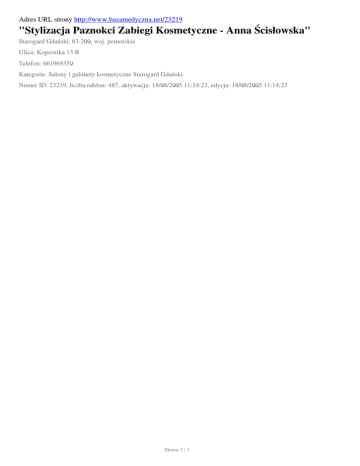 Adres URL strony http://www.bazamedyczna.net/23219 "Stylizacja Paznokci Zabiegi Kosmetyczne - Anna Ścisłowska" Starogard Gdański, 83-200, woj. pomorskie Ulica: Kopernika 13 B Telefon: 661969350 Kategorie: Salony i gabinety kosmetyczne Starogard Gdański Numer ID: 23219, liczba odsłon: 487, aktywacja: 18/08/2005 11:14:23, edycja: 18/08/2005 11:14:23 Strona 1 / 1