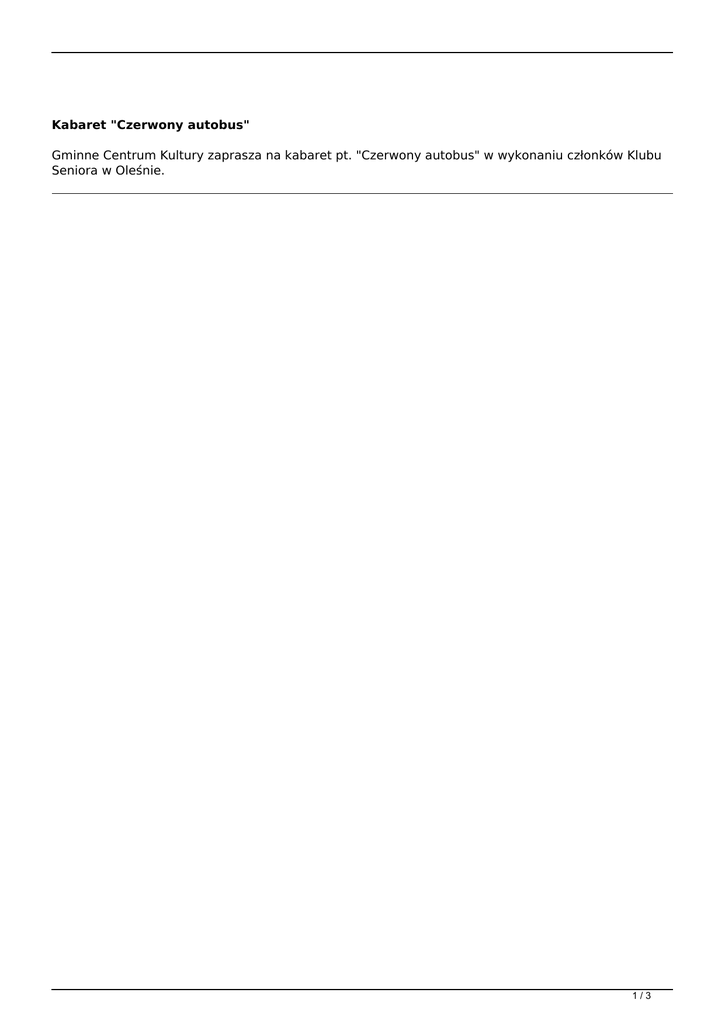Kabaret "Czerwony autobus" Gminne Centrum Kultury zaprasza na kabaret pt. "Czerwony autobus" w wykonaniu członków Klubu Seniora w Oleśnie. 1/3 2/3 3/3 Powered by TCPDF (www.tcpdf.org)
