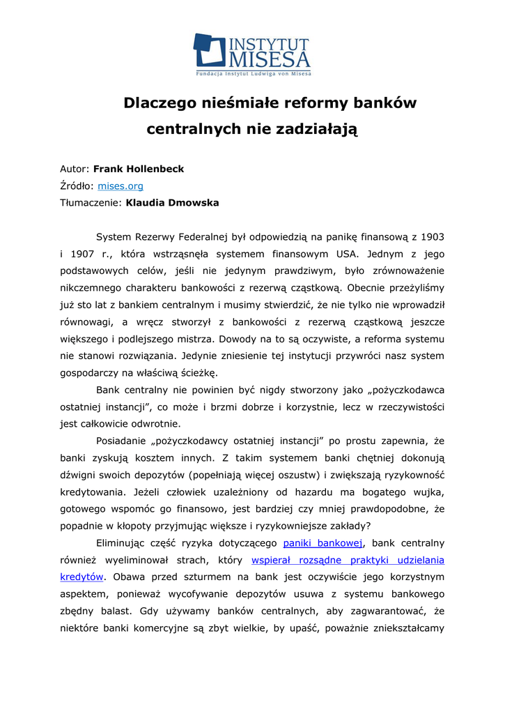 Dlaczego nieśmiałe reformy banków centralnych nie zadziałają Autor: Frank Hollenbeck Źródło: mises.org Tłumaczenie: Klaudia Dmowska System Rezerwy Federalnej był odpowiedzią na panikę finansową z 1903 i 1907 r., która wstrząsnęła systemem finansowym USA. Jednym z jego podstawowych celów, jeśli nie jedynym prawdziwym, było zrównoważenie nikczemnego charakteru bankowości z rezerwą cząstkową. Obecnie przeżyliśmy już sto lat z bankiem centralnym i musimy stwierdzić, że nie tylko nie wprowadził równowagi, a wręcz stworzył z bankowości z rezerwą cząstkową jeszcze większego i podlejszego mistrza. Dowody na to są oczywiste, a reforma systemu nie stanowi rozwiązania. Jedynie zniesienie tej instytucji przywróci nasz system gospodarczy na właściwą ścieżkę. Bank centralny nie powinien być nigdy stworzony jako „pożyczkodawca ostatniej instancji”, co może i brzmi dobrze i korzystnie, lecz w rzeczywistości jest całkowicie odwrotnie. Posiadanie „pożyczkodawcy ostatniej instancji” po prostu zapewnia, że banki zyskują kosztem innych. Z takim systemem banki chętniej dokonują dźwigni swoich depozytów (popełniają więcej oszustw) i zwiększają ryzykowność kredytowania. Jeżeli człowiek uzależniony od hazardu ma bogatego wujka, gotowego wspomóc go finansowo, jest bardziej czy mniej prawdopodobne, że popadnie w kłopoty przyjmując większe i ryzykowniejsze zakłady? Eliminując część ryzyka dotyczącego paniki bankowej, bank centralny również wyeliminował strach, który wspierał rozsądne praktyki udzielania kredytów. Obawa przed szturmem na bank jest oczywiście jego korzystnym aspektem, ponieważ wycofywanie depozytów usuwa z systemu bankowego zbędny balast. Gdy używamy banków centralnych, aby zagwarantować, że niektóre banki komercyjne są zbyt wielkie, by upaść, poważnie zniekształcamy aspekt zysku i straty systemu bankowego, a zarazem dużej części systemu kapitalistycznego. Niektórzy ekonomiści twierdzą, że podwójny mandat Rezerwy Federalnej był pomyłką, a drobne reformy (takie jak ograniczenie tego mandatu do kwestii inflacji) mogłyby przywrócić politykę pieniężną na właściwe tory. Amerykanie muszą jedynie spojrzeć przez ocean na Europę, aby stwierdzić, że takie reformy ustawiłyby politykę pieniężną na innych niewłaściwych torach. Europejski Bank Centralny (EBC) jest tak samo winny powstawania baniek na rynku nieruchomości na początku tego wieku jak Fed. EBC był jednak z prawnego punktu widzenia zorganizowany zdecydowanie bardziej konserwatywnie niż Rezerwa Federalna. Niemcy zaakceptowali ideę euro jako cenę zjednoczenia z Niemcami Wschodnimi, lecz zażyczyli sobie, aby struktura banku centralnego właściwie przypominała większą kopię Bundesbanku1. Wyłącznym celem EBC była stabilność cenowa, a jej wprowadzenie jasno zakazało finansowania długu publicznego. Główną siedzibą Europejskiego Banku Centralnego jest Frankfurt, w celu podkreślenia, że jest to bank w stylu niemieckim (tzn. charakteryzujący się twardym pieniądzem). Ale nawet posiadając tak konserwatywną strukturę, EBC popełnia właściwie te same błędy jak Rezerwa Federalna. Pierwszym problemem polityki pieniężnej EBC jest to, że definiuje stabilność cenową jako stały wskaźnik cen towarów i usług konsumpcyjnych (CPI). Oryginalna ilościowa teoria pieniądza wiązała pieniądz z ceną transakcji, a nie tylko z produktem krajowym brutto (PKB). Gdy inflację definiuje się jako CPI, zamiast jako cenę wszystkiego, co można kupić za pieniądze (łącznie z cenami aktywów), polityka pieniężna skupia się na zdrowej grupce drzew, podczas gdy reszta lasu jest chora. Poza tym, jeżeli średnie ceny będą się obniżać, zerowa inflacja może faktycznie odzwierciedlać zbyt agresywną politykę pieniężną. Drugi problem stanowi sposób organizacji polityki pieniężnej EBC. Jest to maszyna tworząca bańki. EBC zapewnia płynność zabezpieczenia — im wyższa jakość zabezpieczenia, tym większa płynność. Banki europejskie szybko zdały sobie sprawę, że najlepszym zabezpieczeniem są obligacje rządowe państw strefy euro, ponieważ wszystkie otrzymały od agencji ratingowych ocenę AAA. Założenie oczywiście jest takie, że rząd nigdy nie bankrutuje. 1 Niektóre idee zaczerpnięto ze wspaniałej książki dr. Philippa Bagusa Tragedia Euro. Ze względu na duże zapotrzebowanie na obligacje rządowe, stopy procentowe w całej strefie euro szybko spadły do poziomu, którego doświadczyły tylko Niemcy przed wprowadzeniem euro. Zmniejszenie kosztów zaciągania kredytów spowodowało zachętę dla takich krajów jak Grecja czy Włochy, do zaciągania pożyczek na poczet wydatków publicznych (zwłaszcza podwyżek płac pracowników sektora publicznego) przeznaczonych dla uzyskania głosów wyborców. Rząd wyemitował zbyt wiele obligacji, co doprowadziło do nadmiernej płynności i kredytów, a w rezultacie do ogromnej bańki na rynku nieruchomości i błędnych inwestycji w latach 1999-2007 w całej strefie euro. Gdyby struktura polityki pieniężnej była inna, Grecja, Hiszpania i Włochy nigdy nie popadłyby w tak wielkie długi. Bańkę obligacji rządowych można bezpośrednio przypisać strukturze EBC gwarantującej płynność. Trudno uwierzyć, że ten system cały czas istnieje, a EBC wydaje się zupełnie nie zadawać sobie sprawy z tego, do czego doprowadził i co nadal powoduje. Banki europejskie są obecnie po uszy pogrążone w długu publicznym, ale EBC wydaje się nieświadomy swej roli w tej wielkiej farsie. Ostatnio EBC wprowadził ujemne stopy depozytów i zastanawia się nad jakąś formą luzowania ilościowego polityki pieniężnej. Zdecydowanie mądrzej byłoby uniemożliwić wykorzystywanie obligacji rządowych jako zabezpieczenia dla tanich kredytów EBC, wprowadzając jasne i natychmiastowe ograniczenia (łącznie z pożyczania całkowitym i 