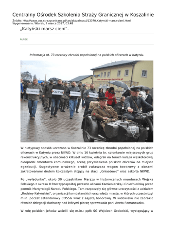 Centralny Ośrodek Szkolenia Straży Granicznej w Koszalinie Źródło: http://www.cos.strazgraniczna.pl/cos/aktualnosci/13070,Katynski-marsz-cieni.html Wygenerowano: Wtorek, 7 marca 2017, 03:48 „Katyński marsz cieni”. Autor: Informacja nt. 73 rocznicy zbrodni popełnionej na polskich oficerach w Katyniu. W nietypowy sposób uczczono w Koszalinie 73 rocznicę zbrodni popełnionej na polskich oficerach w Katyniu przez NKWD. W dniu 16 kwietnia br. członkowie miejscowych grup rekonstrukcyjnych, w obecności kilkuset widzów, odegrali na torach kolejki wąskotorowej nieopodal cmentarza komunalnego, scenę przywiezienia polskich oficerów na miejsce egzekucji. Sugestywne wrażenie zrobił zwłaszcza wagon towarowy z oknami zakratowanymi drutem kolczastym stojący na stacji „Gniazdowo” oraz eskorta NKWD. Po „wyładunku”, około 30 uczestników Marszu w historycznych mundurach Wojska Polskiego z okresu II Rzeczypospolitej przeszło ulicami Kamieniarską i Gnieźnieńską przed pomnik Martyrologii Narodu Polskiego. Tam rozpoczęły się główne uroczystości z udziałem „Rodziny Katyńskiej”, organizacji kombatanckich oraz władz miasta, w których uczestniczył m.in. poczet sztandarowy COSSG wraz z asystą honorową. W widowisku nie zabrakło również delegacji słuchaczy nad którymi pieczę sprawowała pani Aneta Romanowska. W rolę polskich jeńców wcielili się m.in.: ppłk SG Wojciech Grobelski, występujący w mundurze oficera Korpusu Ochrony Pogranicza oraz kpt. SG Tomasz Chachaj jako oficer broni pancernej. Zawieszenie na symbolicznej mogile wstęgi Orderu Wojennego „Virtuti Militari” oraz Apel Poległych i salwa honorowa były widocznym znakiem czci i pamięci dla niewinnie straconych Rodaków. Później pod pomnikiem Martyrologii Narodu Polskiego złożono wieńce, a uczestnicy „Marszu Cieni” zapalili znicze. Warto zaznaczyć, iż uroczystość zorganizowana w formie inscenizacji stała się prawdziwą lekcją historii dla mieszkańców Koszalina, zyskując jednocześnie gorący aplauz ze strony władz miasta. 2013/04/rozne_Obraz 730.jpg
