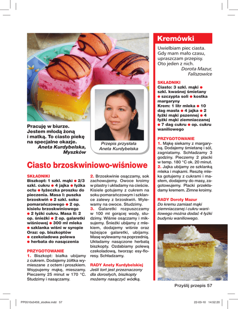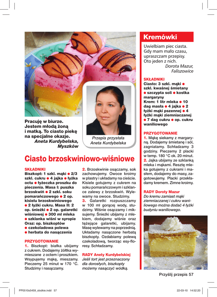 Kremówki Uwielbiam piec ciasta. Gdy mam mało czasu, upraszczam przepisy. Oto jeden z nich. Dorota Mazur, Faliszowice Pracuję w biurze. Jestem młodą żoną i matką. To ciasto piekę na specjalne okazje. Aneta Kurdybelska, Myszków SKŁADNIKI Ciasto: 3 szkl. mąki ● szkl. kwaśnej śmietany ● szczypta soli ● kostka margaryny Krem: 1 litr mleka ● 10 dag masła ● 4 jajka ● 2 łyżki mąki pszennej ● 4 łyżki mąki ziemniaczanej ● 7 dag cukru ● op. cukru waniliowego Przepis przysłała Aneta Kurdybelska Ciasto brzoskwiniowo-wiśniowe SKŁADNIKI Biszkopt: 1 szkl. mąki ● 2/3 szkl. cukru ● 4 jajka ● łyżka octu ● łyżeczka proszku do pieczenia. Masa I: puszka brzoskwiń ● 2 szkl. soku pomarańczowego ● 2 op. kisielu brzoskwiniowego ● 2 łyżki cukru. Masa II: 2 op. śnieżki ● 2 op. galaretki wiśniowej ● 300 ml mleka ● szklanka wiśni w syropie Oraz: op. biszkoptów ● czekoladowa polewa ● herbata do nasączenia PRZYGOTOWANIE 1. Biszkopt: białka ubijamy z cukrem. Dodajemy żółtka wymieszane z octem i proszkiem. Wsypujemy mąkę, mieszamy. Pieczemy 25 minut w 170 °C. Studzimy i nasączamy. 2. Brzoskwinie osączamy, sok zachowujemy. Owoce kroimy w plastry i układamy na cieście. Kisiele gotujemy z cukrem na soku pomarańczowym i szklance zalewy z brzoskwiń. Wylewamy na owoce. Studzimy. 3. Galaretki rozpuszczamy w 100 ml gorącej wody, studzimy. Wiśnie osączamy i miksujemy. Śnieżki ubijamy z mlekiem, dodajemy wiśnie oraz tężejące galaretki, ubijamy. Masę wylewamy na poprzednią. Układamy nasączone herbatą biszkopty. Ozdabiamy polewą czekoladową, tworząc esy-floresy. Schładzamy. PRZYGOTOWANIE 1. Mąkę siekamy z margaryną. Dodajemy śmietanę i sól, zagniatamy. Schładzamy 3 godziny. Pieczemy 2 placki w temp. 180 °C ok. 20 minut. 2. Jajka ubijamy ze szklanką mleka i mąkami. Resztę mleka gotujemy z cukrami i masłem, dodajemy do masy, zagotowujemy. Placki przekładamy kremem. Zimne kroimy. RADY Doroty Mazur Do kremu zamiast mąki ziemniaczanej i cukru waniliowego można dodać 4 łyżki budyniu waniliowego. RADY Anety Kurdybelskiej Jeśli tort jest przeznaczony dla dorosłych, biszkopty możemy nasączyć wódką. Przyślij przepis 57 PP0510s5459_slodkie.indd 57 22-03-10 14:52:20