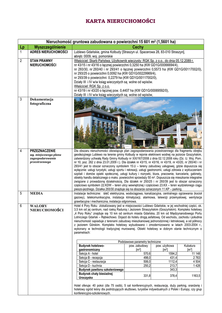 KARTA NIERUCHOMOŚCI Lp Nieruchomość gruntowa zabudowana o powierzchni 15 601 m2 (1,5601 ha) Wyszczególnienie Cechy 1 ADRES NIERUCHOMOŚCI 2 STAN PRAWNY NIERUCHOMOŚCI 3 Dokumentacja fotograficzna 4 PRZEZNACZENIE wg. miejscowego planu zagospodarowania przestrzennego 5 MEDIA 6 WALORY NIERUCHOMOŚCI Lublewo Gdańskie, gmina Kolbudy [Straszyn ul. Spacerowa 28, 83-010 Straszyn], obręb: 0009, woj. pomorskie Właściciel: Skarb Państwa; Użytkownik wieczysty: RGK Sp. z o.o.. do dnia 05.12.2089 r. nr 43/15 i nr 43/16 o łącznej powierzchni 0,3250 ha (KW GD1G/00066694/4), nr 293/30, nr 293/40 i nr 293/41 o łącznej powierzchni 0,5573 ha (KW GD1G/00117002/0), nr 293/25 o powierzchni 0,0092 ha (KW GD1G/00229969/4), nr 293/39 o powierzchni 0,2279 ha (KW GD1G/00117002/0), Działy III i IV w/w ksiąg wieczystych są wolne od wpisów. Właściciel: RGK Sp. z o.o. nr 43/19 i nr 43/20 o łącznej pow. 0,4407 ha (KW GD1G/00069592/0), Działy III i IV w/w ksiąg wieczystych są wolne od wpisów, Dla obszaru nieruchomości obowiązuje plan zagospodarowania przestrzennego dla fragmentu obrębu geodezyjnego Lublewo na terenie gminy Kolbudy w rejonie elektrowni wodnej na jeziorze Goszyńskim, zatwierdzony uchwałą Rady Gminy Kolbudy nr XXI/167/2008 z dnia 02.12.2008 roku (Dz. U. Woj. Pom. nr 10, poz. 262 z dnia 23.01.2009 r.). Dla działek nr 43/15, nr 43/16, nr 43/19, nr 43/20, nr 293/40 i nr 293/41 jest to obszar oznaczony symbolem 15.U – tereny zabudowy usługowej, gdzie dopuszcza się wyłącznie: usługi turystyki, usługi sportu i rekreacji, usługi gastronomii, usługi zdrowia z wykluczeniem szpitali i domów opieki społecznej, usługi kultury i rozrywki, biura, pracownie, kancelarie, gabinety, obiekty handlu detalicznego o maks. powierzchni sprzedaży 50 m2. Dopuszcza się mieszkanie integralne związane z prowadzoną działalnością. Dla działek nr 293/25 i nr 293/39 jest to obszar oznaczony częściowo symbolem 22.KDW – teren ulicy wewnętrznej i częściowo 23.KX – teren wydzielonego ciągu pieszo-jezdnego. Działka 293/30 znajduje się na obszarze oznaczonym 11.KP – parking. Instalacje techniczne: sieć elektryczna, wodociągowa, kanalizacyjna, centralnego ogrzewania (kocioł gazowy), telekomunikacyjna, instalacja klimatyzacji, alarmowa, telewizji przemysłowej, wentylacja grawitacyjna i mechaniczna, instalacja odgromowa. Hotel 4 Pory Roku zlokalizowany jest w miejscowości Lublewo Gdańskie, w jej wschodniej części, ok. 3,5 km od jej centrum, nad rzeką Radunią i Jeziorem Straszyńskim (Goszyńskim). Kompleks hotelowy „4 Pory Roku” znajduje się 10 km od centrum miasta Gdańska, 20 km od Międzynarodowego Portu Lotniczego Gdańsk – Rębiechowo. Dojazd do hotelu drogą asfaltową. Od wschodu, zachodu i południa nieruchomość sąsiaduje z terenami zabudowy mieszkaniowej jednorodzinnej i letniskowej, a od północy z jeziorem Górskim. Kompleks hotelowy wybudowano i zmodernizowano w latach 2003-2004 r., wykonany w technologii tradycyjnej murowanej. Obiekt hotelowy w dobrym stanie technicznym o parametrach: Podstawowe parametry techniczne Budynek hotelowopow. zabudowy pow. użytkowa gastronomiczny [m2] [m2] Sekcja A - hotel 570,6 1594,2 Sekcja B - recepcja 498,0 431,4 Sekcja C - restauracja 506,0 1112,4 Sekcja D - kuchnia 250,2 213,7 Budynek pawilonu szkoleniowego 343,3 Budynek chaty biesiadnej 331,8 378,4 Uroczysko Kubatura [m3] 11 148 2 763 4 504 1 428 1163,5 Hotel oferuje: 40 pokoi (dla 75 osób), 5 sal konferencyjnych, restaurację, duży parking, oranżerię i hotelowy ogród leśny dla podróżujących służbowo, turystów indywidualnych z Polski i Europy, czy grup konferencyjno-szkoleniowych. Struktura pokoi hotelowych:: - liczba miejsc hotelowych 75 - w pokojach 1 os (6 pokoi) i 2 os (30 pokoi), 3 os. (1 pokój Superior) i 2 os apartamenty (3 pokoje); - sale konferencyjne: 1. Sala Wielki Błękit – o pow. 135 m2 2. Sala Pistacjowa, Jaśminowa, Cynamonowa – o pow. 51 m2 3. Sala Brzoskwiniowa – o pow. 33 m2 4. Sala Narad – o pow. 17 m2 5. Sala Bankietowa – o pow. 25 m2 Wszystkie pokoje hotelowe i apartamenty wyposażone są w odbiorniki radiowe i TV, telefony, łącza internetowe oraz komfortowo urządzone łazienki. 7 8 Cena DODATKOWE INFORMACJE, KONTAKT 12 800 000,00 zł netto + VAT w obowiązującej stawce Michał Jankowski, M +48 609 710 262, e-mail: [email protected], Jarosław Goncerz M +48 605 299 613, e-mail: [email protected]